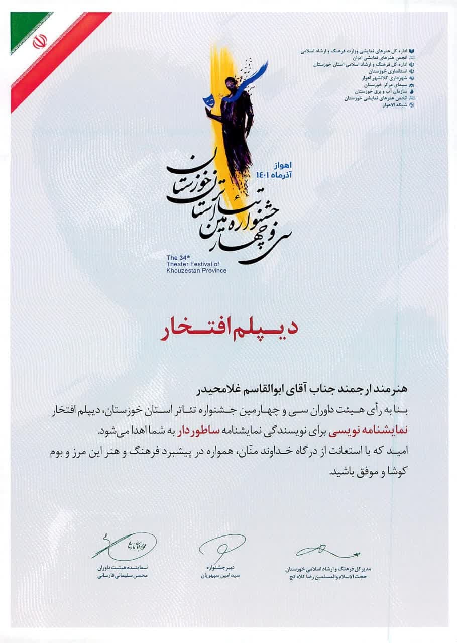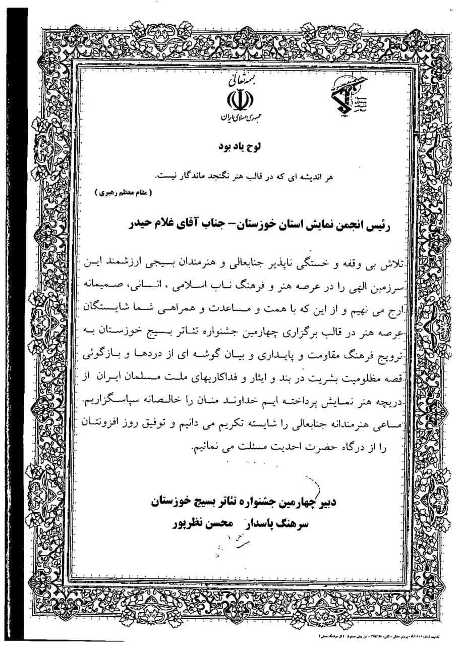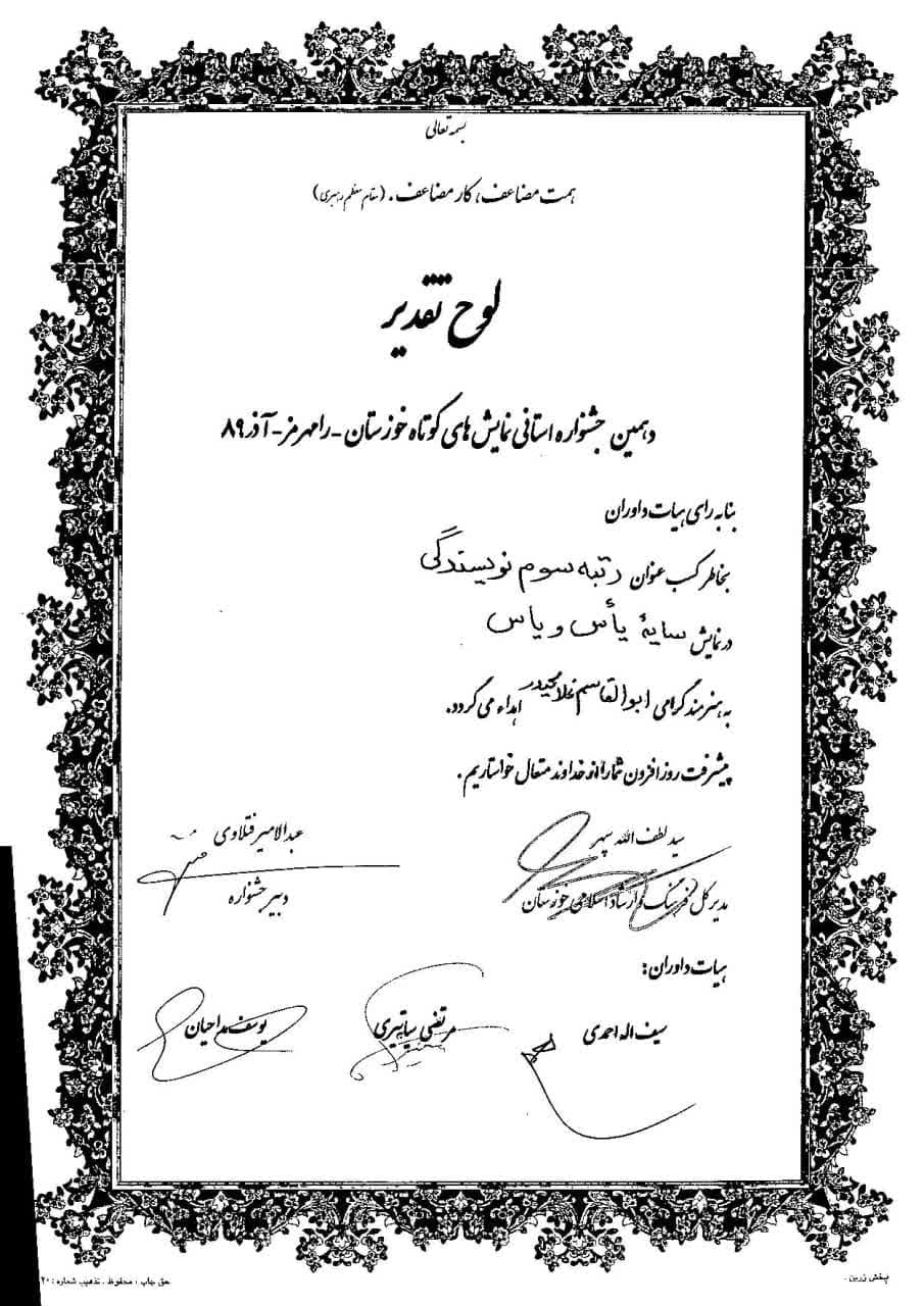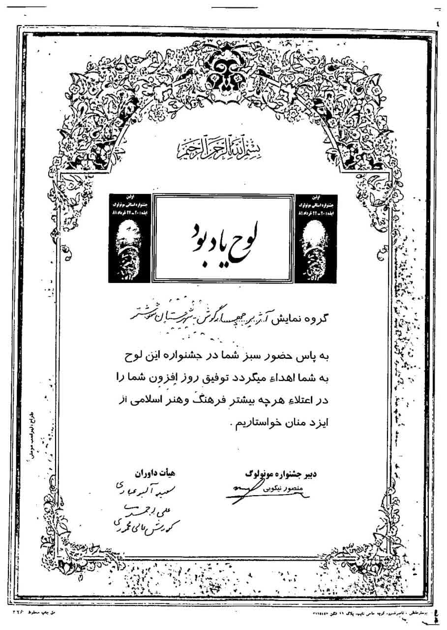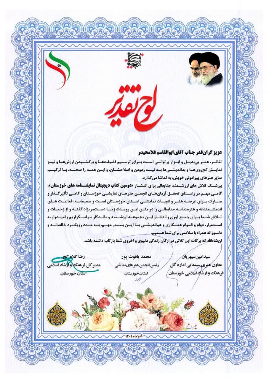 تقدیرنامه ها حکم انتصاب عضو هیئت داوران بخش نقالی و پرده خوانی حکم مسئولیت مدیر اجرایی هجدمین جشنوار تئاتر استان خوزستان بازخوان نوزدهمین جشنواره تئاتر استان خوزستان حکم مسئولیت داور بخش نمایشنامه نویسی سومین جشنواره هنری مقاومت عضو هیات داوران بخش نمایشنامه خوانی نخستین جشنواره بزرگ مقاومت آبادان حکم مسئولیت داور بخش نمایشنامه نویسی سومین جشنواره هنری مقاومت حکم مسئولیت مشاور نخستین جشنواره تئاتر دفاع مقدس خوزستان تقدیرنامه هیجدهمین جشنواره تئاتر استان خوزستان حکم مسئولیت شورای بررسی و انتخاب آثار حرفه ای و عضو کارگروه تئاتر استان خوزستان حکم مسئولیت عضو هیات داوران بخش نمایشنامه خوانی دومین جشنواره هنری مقاومت ویژه شکست حصر آبادان حکم مسئولیت مدیر اجرایی هجدهمین جشنواره تئاتر استان خوزستان حکم مسئولیت عضو هیئت نظارت بر تولیدات و مشاور فنی عضو شورای مشورتی تئاتر خوزستان حکم مسئولیت عضو هیات داوران بخش نمایشنامه خوانی دومین جشنواره هنری مقاومت ویژه شکست حصر آبادان حکم مسئولیت رئیس و عضو هیئت امنا انجمن نمایش حکم مسئول کمیته اجرایی و امور فرهنگی در نحستین جشنواره تئاتر دفاع مقدس خوزستان حکم مسئولیت شورای بررسی و انتخاب آثار حرفه ای و عضو کارگروه تئاتر خوزستان حکم مسئولیت بازخوان نوزدهمین جشنواره تئاتر استان خوزستان مسئول کمیته اجرایی و امور فرهنگی در نخستین جشنواره تئاتر دفاع مقدس خوزستان مشاور نخستین جشنواره تئاتر دفاع مقدس خوزستان حکم مسئولیت عضو هیات نظارت بر تولیدات و مشاور فنی واحد نمایش تقدیرنامه به مناسبت روز جوان حکم مسئولیت مشاور اجرایی در حوزه جوانان حکم مسئولیت عضویت در شورای نظارت بر نمایش شهرستان شوشتر عضو هیات داوران بخش نمایشنامه خوانی نخستین جشنواره بزرگ مقاومت آبادان حکم مسئولیت مشاور بررسی مسائل جوانان حکم عضویت شورای نظارت بر نمایش شهرستان شوشتر حکم مسئولیت عنوان رئیس و عضو هیئت امنا انجمن نمایش تقدیرنامه هجدهمین جشنواره تئاتر استان خوزستان تقدیرنامه در نشر و اعتلای هنر استان خوزستان حکم مسئولیت دبیر جمعیت پیشرفت و عدالت ایران اسلامی در شهرستان شوشتر لوح یادمان بیست و هفتمین جشنواره تئاتر مناطق کشور تقدیرنامه به مناسبت روز جوان تقدیرنامه اجرای نمایش غم در غیاب خداوند حکم مسئولیت راه اندازی خانه تشکلهای جوان در شهرستان ماهشهر بازخوان نوزدهمین جشنواره تئاتر استان خوزستان حکم مسئولیت داور بخش نمایشنامه نویسی سومین جشنوازه هنری مقاومت لوح یادبود نمایش آژیر چهار گوش لوح یادمان جشنواره فرهنگ جوانان خلیج فارس حکم مسئولیت دبیرخانه نشر آثار و پژوهش های انجمن هنرهای نمایشی استان خوزستان حکم مسئولیت مدیر اجرایی هجدهمین جشنواره تئاتر استان خوزستان تقدیرنامه نفر اول جشنواره اتفاق لوح تقدیر دهمین جشنواره استانی نمایش های کوتاه خوزستان حکم مسئولیت داوری اولین سوگواره عرشیان تقدیرنامه جوان منتخب در نخستین جشنواره استانی حضرت علی اکبر تقدیرنامه به مناسبت نوروز تقدیرنامه نفر اول جشنواره اتفاق حکم مسئولیت داور مرحله حضوری مسابقات هنرهای نمایشی در رشته تئاتر صحنه ای دانش آموزان استان خوزستان نبریک هفته میراث فرهنگی لوح یادبود چهارمین جشنواره تئاتر بسیج خوزستان حکم مسئولیت مشاور در نخستین جشنواره تئاتر دفاع مقدس خوزستان حکم مسئولیت عضو هیئت داوران بخش نمایشنامه خوانی نخستین جشنواره بزرگ مقاومت آبادان حکم مسئولیت شورای بررسی و انتخاب آثار حکم مسئولیت عضو هیات داوران بخش نمایشنامه خوانی دومین جشنواره هنری مقاومت ویژه شکست حصر آبادان حکم مسئولیت نماینده هفته نامه عصر کارون در شهرستان شوشتر تقدیرنامه نمایش زیبا و با شکوه آرش بزرگ اسطوره وطن لوح تقدیر سومین جشنواره استانی نمایش های کوتاه لوح تقدیر دومین کتاب دیجیتال نمایشنامه های خوزستان گواهینامه کارگاه تاریخ شفاهی و فن مصاحبه تقدیرنامه نمایش خورشید کاوران حکم مسئولیت دبی