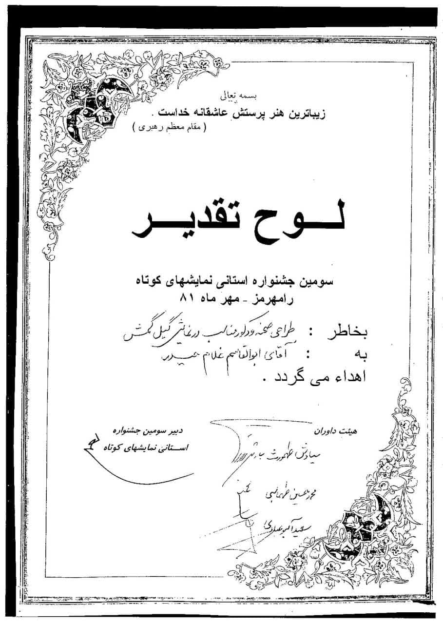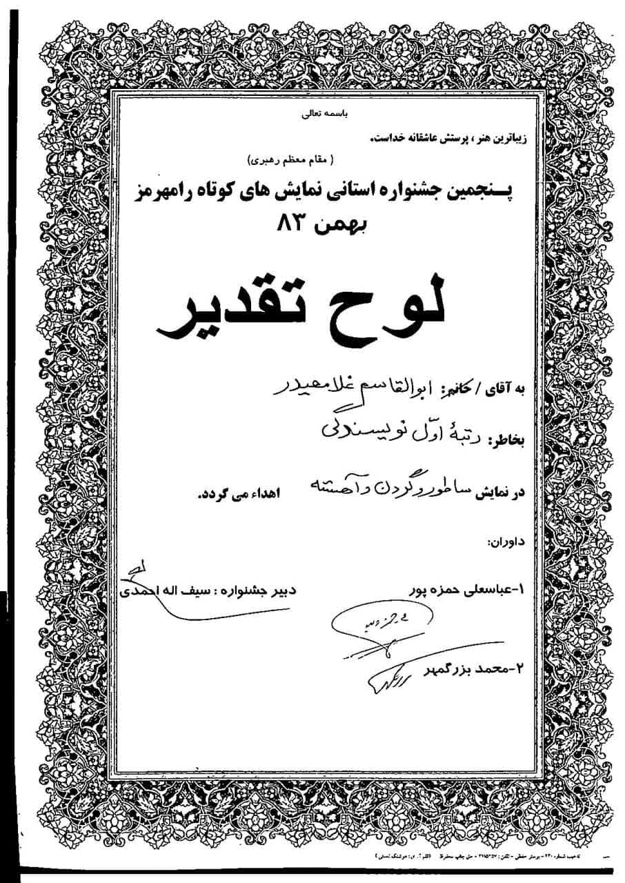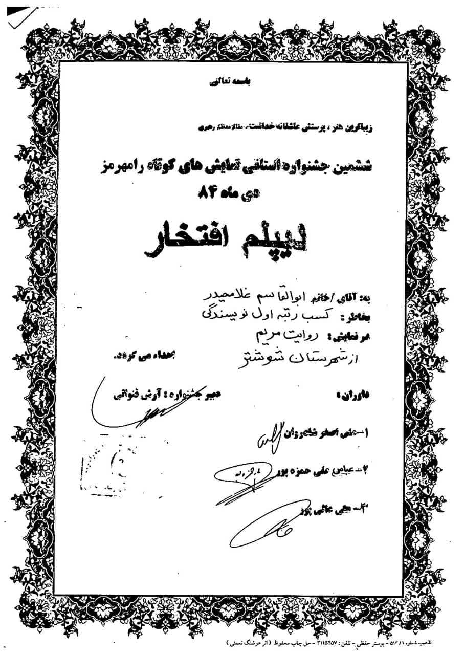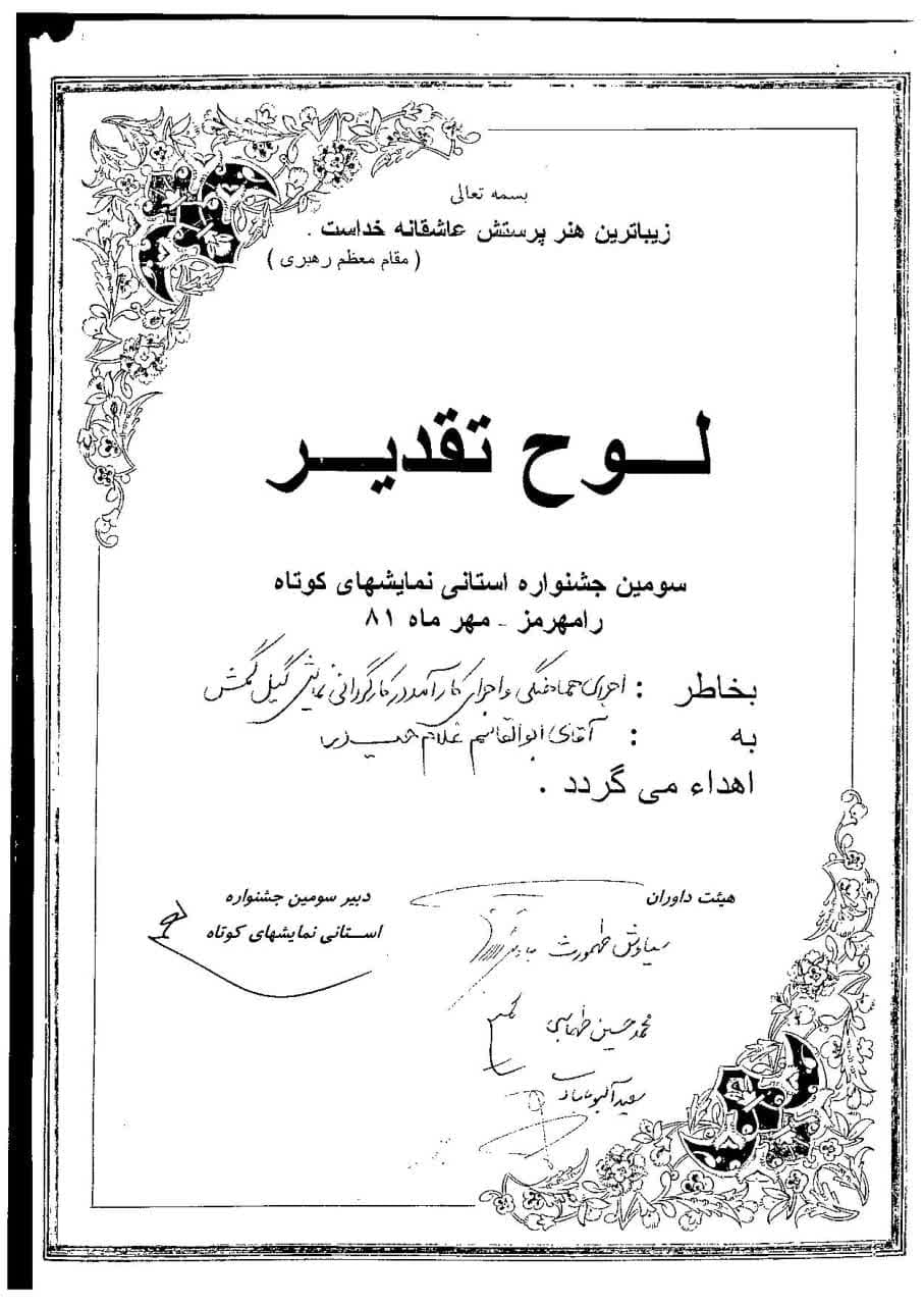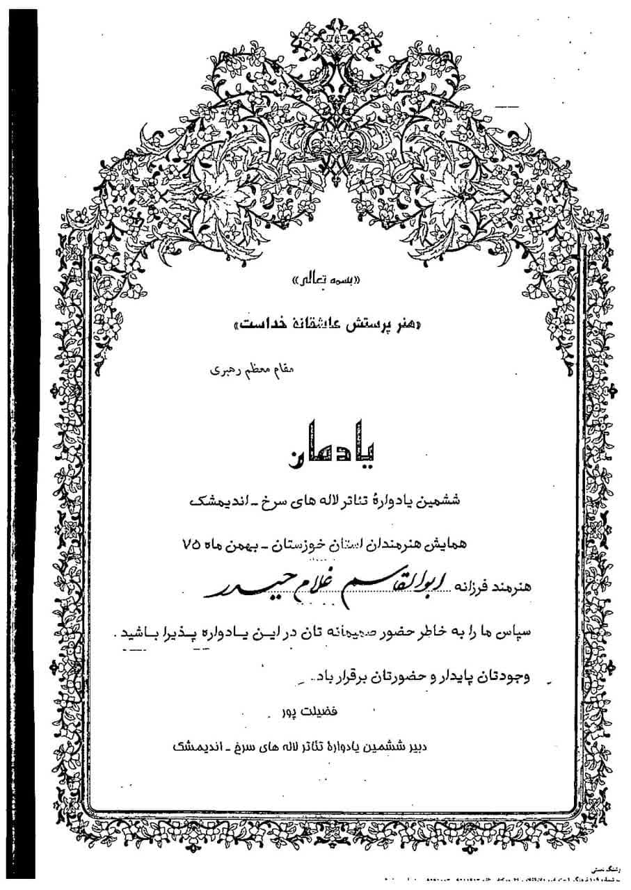 تقدیرنامه ها حکم انتصاب عضو هیئت داوران بخش نقالی و پرده خوانی حکم مسئولیت مدیر اجرایی هجدمین جشنوار تئاتر استان خوزستان بازخوان نوزدهمین جشنواره تئاتر استان خوزستان حکم مسئولیت داور بخش نمایشنامه نویسی سومین جشنواره هنری مقاومت عضو هیات داوران بخش نمایشنامه خوانی نخستین جشنواره بزرگ مقاومت آبادان حکم مسئولیت داور بخش نمایشنامه نویسی سومین جشنواره هنری مقاومت حکم مسئولیت مشاور نخستین جشنواره تئاتر دفاع مقدس خوزستان تقدیرنامه هیجدهمین جشنواره تئاتر استان خوزستان حکم مسئولیت شورای بررسی و انتخاب آثار حرفه ای و عضو کارگروه تئاتر استان خوزستان حکم مسئولیت عضو هیات داوران بخش نمایشنامه خوانی دومین جشنواره هنری مقاومت ویژه شکست حصر آبادان حکم مسئولیت مدیر اجرایی هجدهمین جشنواره تئاتر استان خوزستان حکم مسئولیت عضو هیئت نظارت بر تولیدات و مشاور فنی عضو شورای مشورتی تئاتر خوزستان حکم مسئولیت عضو هیات داوران بخش نمایشنامه خوانی دومین جشنواره هنری مقاومت ویژه شکست حصر آبادان حکم مسئولیت رئیس و عضو هیئت امنا انجمن نمایش حکم مسئول کمیته اجرایی و امور فرهنگی در نحستین جشنواره تئاتر دفاع مقدس خوزستان حکم مسئولیت شورای بررسی و انتخاب آثار حرفه ای و عضو کارگروه تئاتر خوزستان حکم مسئولیت بازخوان نوزدهمین جشنواره تئاتر استان خوزستان مسئول کمیته اجرایی و امور فرهنگی در نخستین جشنواره تئاتر دفاع مقدس خوزستان مشاور نخستین جشنواره تئاتر دفاع مقدس خوزستان حکم مسئولیت عضو هیات نظارت بر تولیدات و مشاور فنی واحد نمایش تقدیرنامه به مناسبت روز جوان حکم مسئولیت مشاور اجرایی در حوزه جوانان حکم مسئولیت عضویت در شورای نظارت بر نمایش شهرستان شوشتر عضو هیات داوران بخش نمایشنامه خوانی نخستین جشنواره بزرگ مقاومت آبادان حکم مسئولیت مشاور بررسی مسائل جوانان حکم عضویت شورای نظارت بر نمایش شهرستان شوشتر حکم مسئولیت عنوان رئیس و عضو هیئت امنا انجمن نمایش تقدیرنامه هجدهمین جشنواره تئاتر استان خوزستان تقدیرنامه در نشر و اعتلای هنر استان خوزستان حکم مسئولیت دبیر جمعیت پیشرفت و عدالت ایران اسلامی در شهرستان شوشتر لوح یادمان بیست و هفتمین جشنواره تئاتر مناطق کشور تقدیرنامه به مناسبت روز جوان تقدیرنامه اجرای نمایش غم در غیاب خداوند حکم مسئولیت راه اندازی خانه تشکلهای جوان در شهرستان ماهشهر بازخوان نوزدهمین جشنواره تئاتر استان خوزستان حکم مسئولیت داور بخش نمایشنامه نویسی سومین جشنوازه هنری مقاومت لوح یادبود نمایش آژیر چهار گوش لوح یادمان جشنواره فرهنگ جوانان خلیج فارس حکم مسئولیت دبیرخانه نشر آثار و پژوهش های انجمن هنرهای نمایشی استان خوزستان حکم مسئولیت مدیر اجرایی هجدهمین جشنواره تئاتر استان خوزستان تقدیرنامه نفر اول جشنواره اتفاق لوح تقدیر دهمین جشنواره استانی نمایش های کوتاه خوزستان حکم مسئولیت داوری اولین سوگواره عرشیان تقدیرنامه جوان منتخب در نخستین جشنواره استانی حضرت علی اکبر تقدیرنامه به مناسبت نوروز تقدیرنامه نفر اول جشنواره اتفاق حکم مسئولیت داور مرحله حضوری مسابقات هنرهای نمایشی در رشته تئاتر صحنه ای دانش آموزان استان خوزستان نبریک هفته میراث فرهنگی لوح یادبود چهارمین جشنواره تئاتر بسیج خوزستان حکم مسئولیت مشاور در نخستین جشنواره تئاتر دفاع مقدس خوزستان حکم مسئولیت عضو هیئت داوران بخش نمایشنامه خوانی نخستین جشنواره بزرگ مقاومت آبادان حکم مسئولیت شورای بررسی و انتخاب آثار حکم مسئولیت عضو هیات داوران بخش نمایشنامه خوانی دومین جشنواره هنری مقاومت ویژه شکست حصر آبادان حکم مسئولیت نماینده هفته نامه عصر کارون در شهرستان شوشتر تقدیرنامه نمایش زیبا و با شکوه آرش بزرگ اسطوره وطن لوح تقدیر سومین جشنواره استانی نمایش های کوتاه لوح تقدیر دومین کتاب دیجیتال نمایشنامه های خوزستان گواهینامه کارگاه تاریخ شفاهی و فن مصاحبه تقدیرنامه نمایش خورشید کاوران حکم مسئولیت دبی
