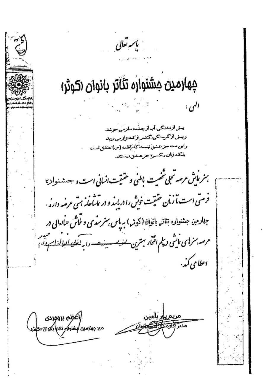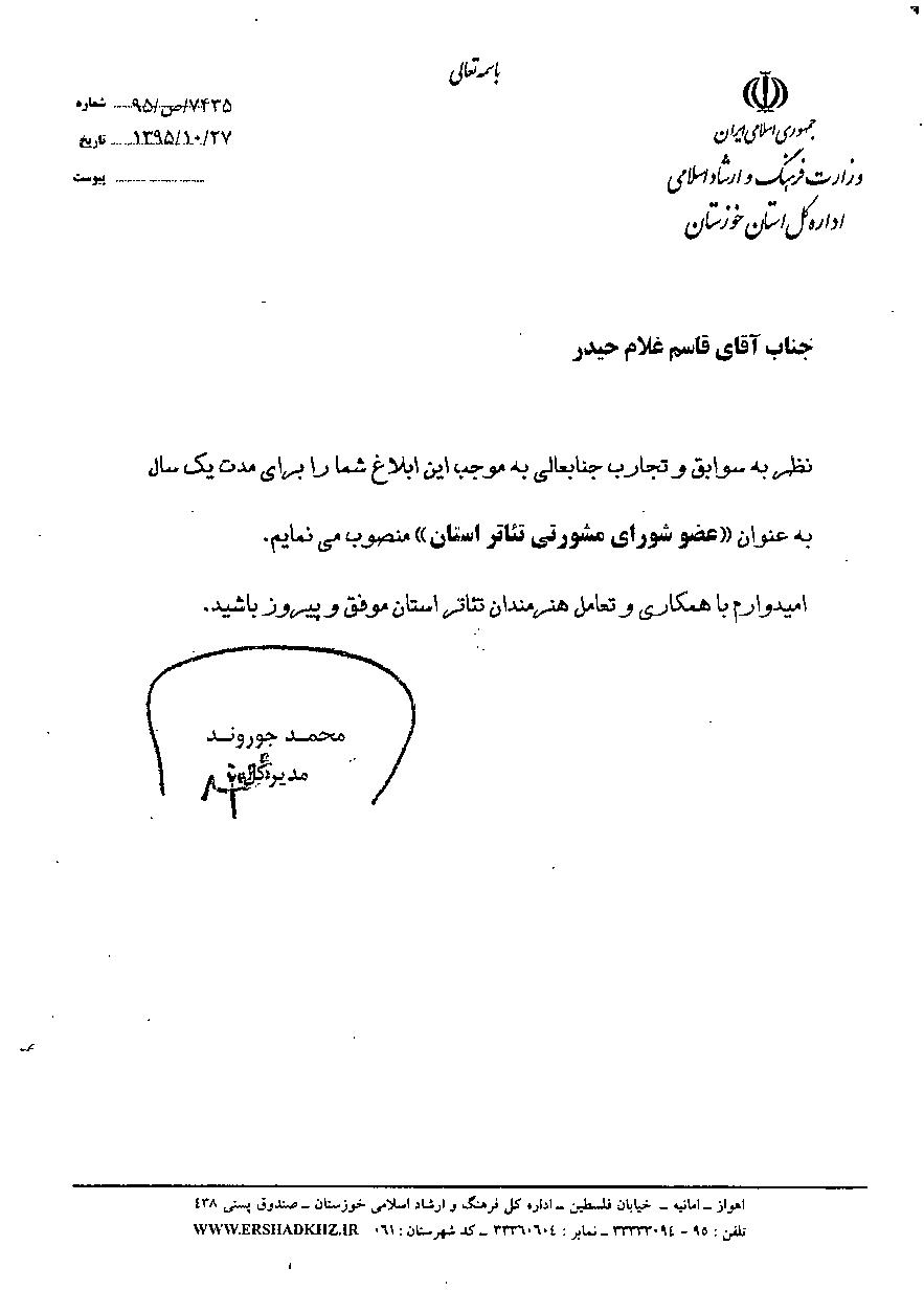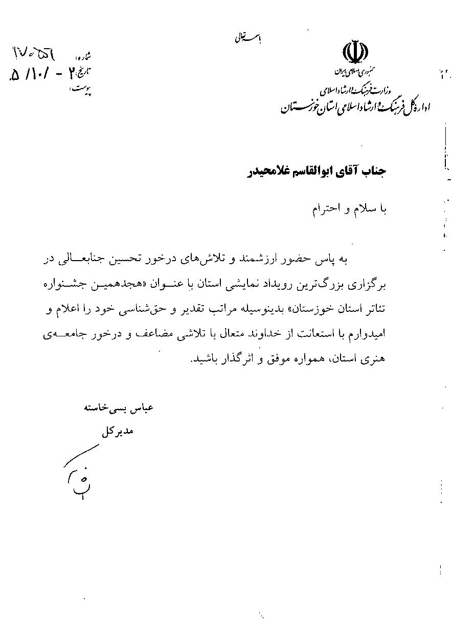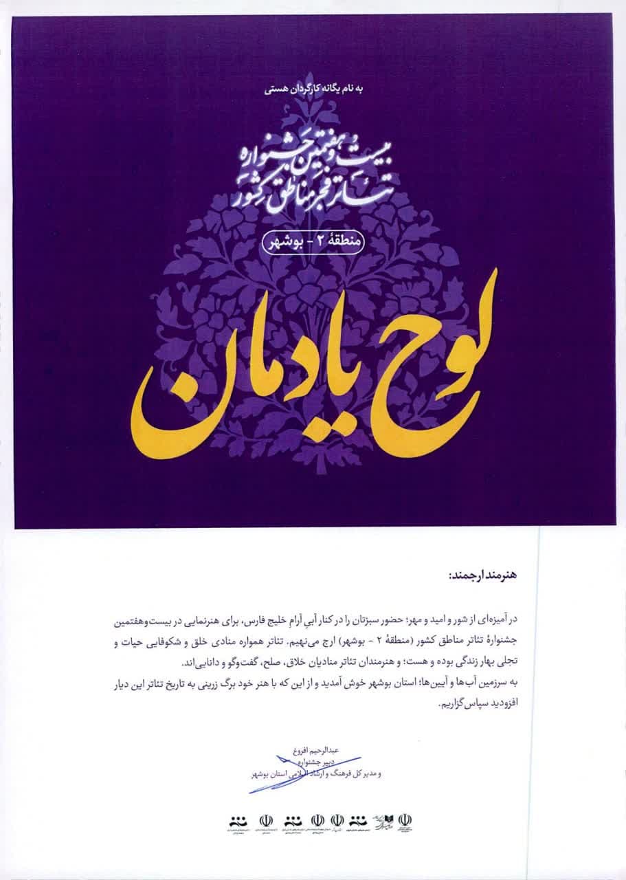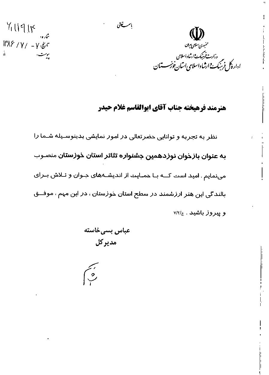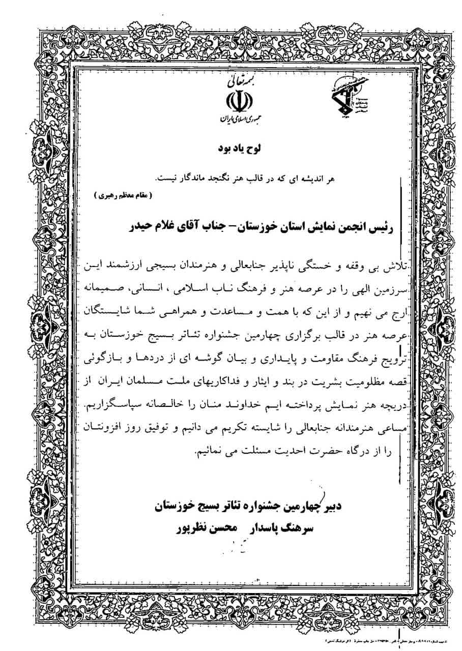 تقدیرنامه ها حکم انتصاب عضو هیئت داوران بخش نقالی و پرده خوانی حکم مسئولیت مدیر اجرایی هجدمین جشنوار تئاتر استان خوزستان بازخوان نوزدهمین جشنواره تئاتر استان خوزستان حکم مسئولیت داور بخش نمایشنامه نویسی سومین جشنواره هنری مقاومت عضو هیات داوران بخش نمایشنامه خوانی نخستین جشنواره بزرگ مقاومت آبادان حکم مسئولیت داور بخش نمایشنامه نویسی سومین جشنواره هنری مقاومت حکم مسئولیت مشاور نخستین جشنواره تئاتر دفاع مقدس خوزستان تقدیرنامه هیجدهمین جشنواره تئاتر استان خوزستان حکم مسئولیت شورای بررسی و انتخاب آثار حرفه ای و عضو کارگروه تئاتر استان خوزستان حکم مسئولیت عضو هیات داوران بخش نمایشنامه خوانی دومین جشنواره هنری مقاومت ویژه شکست حصر آبادان حکم مسئولیت مدیر اجرایی هجدهمین جشنواره تئاتر استان خوزستان حکم مسئولیت عضو هیئت نظارت بر تولیدات و مشاور فنی عضو شورای مشورتی تئاتر خوزستان حکم مسئولیت عضو هیات داوران بخش نمایشنامه خوانی دومین جشنواره هنری مقاومت ویژه شکست حصر آبادان حکم مسئولیت رئیس و عضو هیئت امنا انجمن نمایش حکم مسئول کمیته اجرایی و امور فرهنگی در نحستین جشنواره تئاتر دفاع مقدس خوزستان حکم مسئولیت شورای بررسی و انتخاب آثار حرفه ای و عضو کارگروه تئاتر خوزستان حکم مسئولیت بازخوان نوزدهمین جشنواره تئاتر استان خوزستان مسئول کمیته اجرایی و امور فرهنگی در نخستین جشنواره تئاتر دفاع مقدس خوزستان مشاور نخستین جشنواره تئاتر دفاع مقدس خوزستان حکم مسئولیت عضو هیات نظارت بر تولیدات و مشاور فنی واحد نمایش تقدیرنامه به مناسبت روز جوان حکم مسئولیت مشاور اجرایی در حوزه جوانان حکم مسئولیت عضویت در شورای نظارت بر نمایش شهرستان شوشتر عضو هیات داوران بخش نمایشنامه خوانی نخستین جشنواره بزرگ مقاومت آبادان حکم مسئولیت مشاور بررسی مسائل جوانان حکم عضویت شورای نظارت بر نمایش شهرستان شوشتر حکم مسئولیت عنوان رئیس و عضو هیئت امنا انجمن نمایش تقدیرنامه هجدهمین جشنواره تئاتر استان خوزستان تقدیرنامه در نشر و اعتلای هنر استان خوزستان حکم مسئولیت دبیر جمعیت پیشرفت و عدالت ایران اسلامی در شهرستان شوشتر لوح یادمان بیست و هفتمین جشنواره تئاتر مناطق کشور تقدیرنامه به مناسبت روز جوان تقدیرنامه اجرای نمایش غم در غیاب خداوند حکم مسئولیت راه اندازی خانه تشکلهای جوان در شهرستان ماهشهر بازخوان نوزدهمین جشنواره تئاتر استان خوزستان حکم مسئولیت داور بخش نمایشنامه نویسی سومین جشنوازه هنری مقاومت لوح یادبود نمایش آژیر چهار گوش لوح یادمان جشنواره فرهنگ جوانان خلیج فارس حکم مسئولیت دبیرخانه نشر آثار و پژوهش های انجمن هنرهای نمایشی استان خوزستان حکم مسئولیت مدیر اجرایی هجدهمین جشنواره تئاتر استان خوزستان تقدیرنامه نفر اول جشنواره اتفاق لوح تقدیر دهمین جشنواره استانی نمایش های کوتاه خوزستان حکم مسئولیت داوری اولین سوگواره عرشیان تقدیرنامه جوان منتخب در نخستین جشنواره استانی حضرت علی اکبر تقدیرنامه به مناسبت نوروز تقدیرنامه نفر اول جشنواره اتفاق حکم مسئولیت داور مرحله حضوری مسابقات هنرهای نمایشی در رشته تئاتر صحنه ای دانش آموزان استان خوزستان نبریک هفته میراث فرهنگی لوح یادبود چهارمین جشنواره تئاتر بسیج خوزستان حکم مسئولیت مشاور در نخستین جشنواره تئاتر دفاع مقدس خوزستان حکم مسئولیت عضو هیئت داوران بخش نمایشنامه خوانی نخستین جشنواره بزرگ مقاومت آبادان حکم مسئولیت شورای بررسی و انتخاب آثار حکم مسئولیت عضو هیات داوران بخش نمایشنامه خوانی دومین جشنواره هنری مقاومت ویژه شکست حصر آبادان حکم مسئولیت نماینده هفته نامه عصر کارون در شهرستان شوشتر تقدیرنامه نمایش زیبا و با شکوه آرش بزرگ اسطوره وطن لوح تقدیر سومین جشنواره استانی نمایش های کوتاه لوح تقدیر دومین کتاب دیجیتال نمایشنامه های خوزستان گواهینامه کارگاه تاریخ شفاهی و فن مصاحبه تقدیرنامه نمایش خورشید کاوران حکم مسئولیت دبی