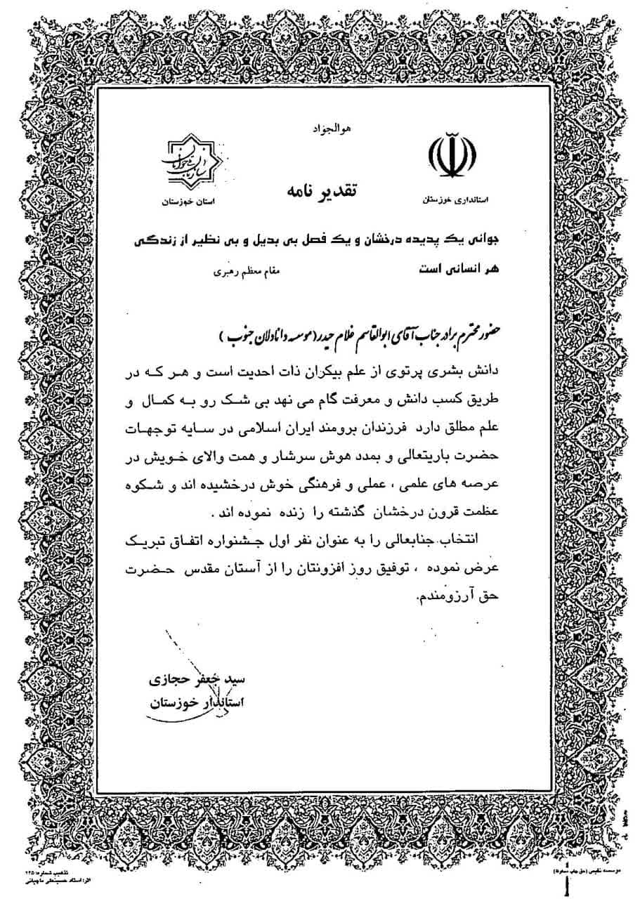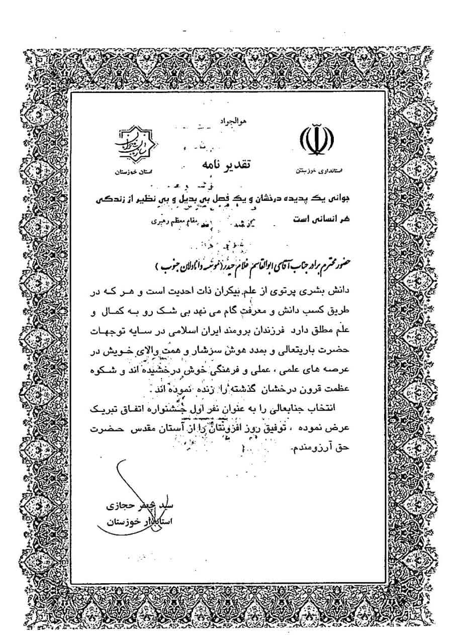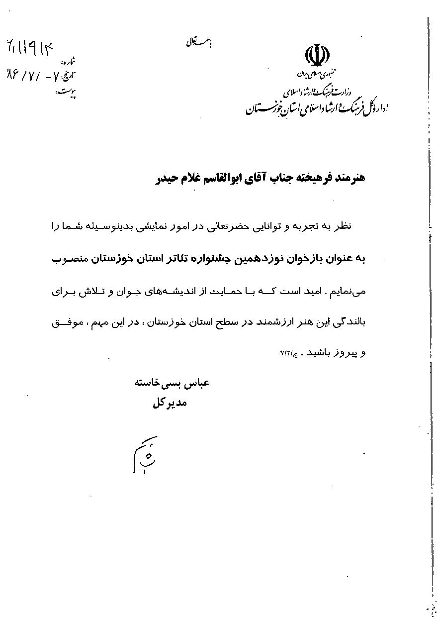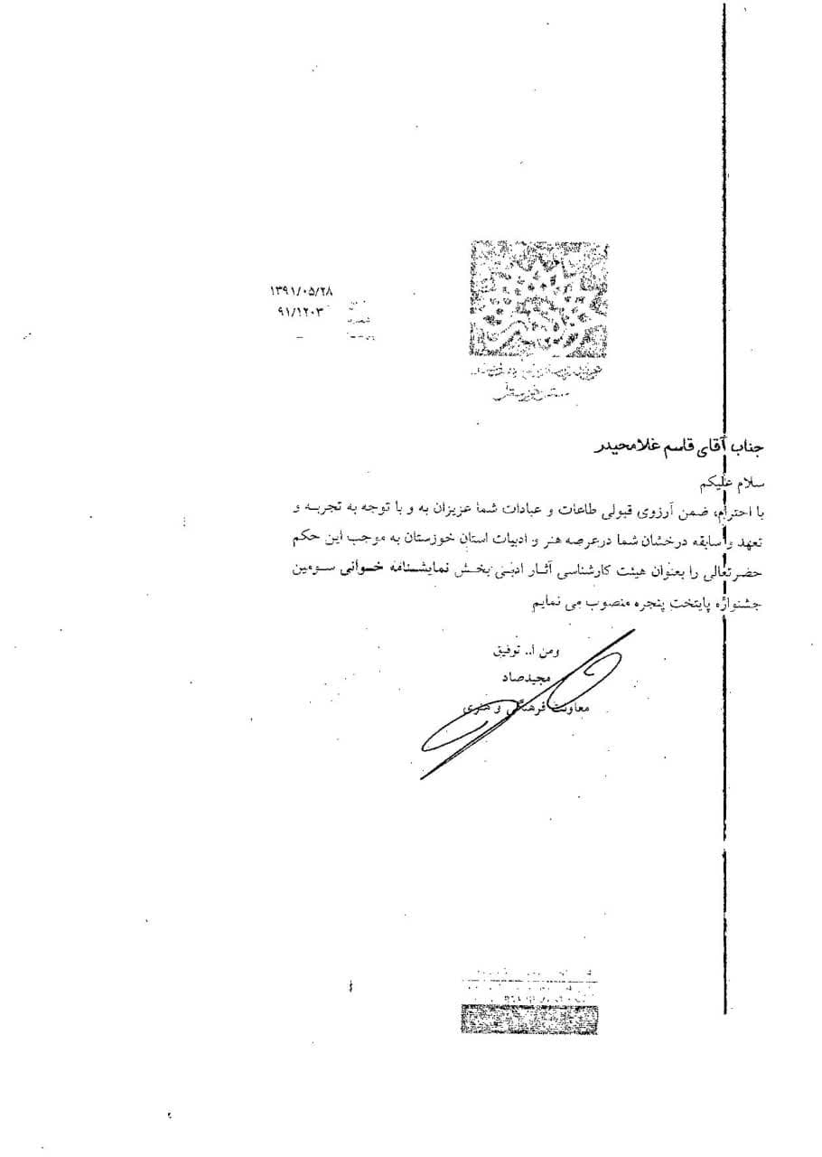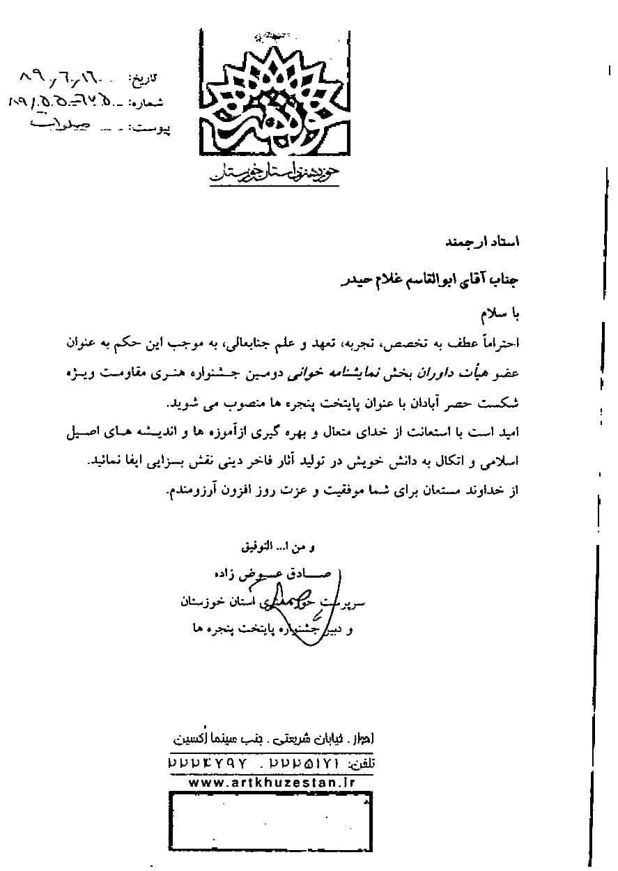 تقدیرنامه ها حکم انتصاب عضو هیئت داوران بخش نقالی و پرده خوانی حکم مسئولیت مدیر اجرایی هجدمین جشنوار تئاتر استان خوزستان بازخوان نوزدهمین جشنواره تئاتر استان خوزستان حکم مسئولیت داور بخش نمایشنامه نویسی سومین جشنواره هنری مقاومت عضو هیات داوران بخش نمایشنامه خوانی نخستین جشنواره بزرگ مقاومت آبادان حکم مسئولیت داور بخش نمایشنامه نویسی سومین جشنواره هنری مقاومت حکم مسئولیت مشاور نخستین جشنواره تئاتر دفاع مقدس خوزستان تقدیرنامه هیجدهمین جشنواره تئاتر استان خوزستان حکم مسئولیت شورای بررسی و انتخاب آثار حرفه ای و عضو کارگروه تئاتر استان خوزستان حکم مسئولیت عضو هیات داوران بخش نمایشنامه خوانی دومین جشنواره هنری مقاومت ویژه شکست حصر آبادان حکم مسئولیت مدیر اجرایی هجدهمین جشنواره تئاتر استان خوزستان حکم مسئولیت عضو هیئت نظارت بر تولیدات و مشاور فنی عضو شورای مشورتی تئاتر خوزستان حکم مسئولیت عضو هیات داوران بخش نمایشنامه خوانی دومین جشنواره هنری مقاومت ویژه شکست حصر آبادان حکم مسئولیت رئیس و عضو هیئت امنا انجمن نمایش حکم مسئول کمیته اجرایی و امور فرهنگی در نحستین جشنواره تئاتر دفاع مقدس خوزستان حکم مسئولیت شورای بررسی و انتخاب آثار حرفه ای و عضو کارگروه تئاتر خوزستان حکم مسئولیت بازخوان نوزدهمین جشنواره تئاتر استان خوزستان مسئول کمیته اجرایی و امور فرهنگی در نخستین جشنواره تئاتر دفاع مقدس خوزستان مشاور نخستین جشنواره تئاتر دفاع مقدس خوزستان حکم مسئولیت عضو هیات نظارت بر تولیدات و مشاور فنی واحد نمایش تقدیرنامه به مناسبت روز جوان حکم مسئولیت مشاور اجرایی در حوزه جوانان حکم مسئولیت عضویت در شورای نظارت بر نمایش شهرستان شوشتر عضو هیات داوران بخش نمایشنامه خوانی نخستین جشنواره بزرگ مقاومت آبادان حکم مسئولیت مشاور بررسی مسائل جوانان حکم عضویت شورای نظارت بر نمایش شهرستان شوشتر حکم مسئولیت عنوان رئیس و عضو هیئت امنا انجمن نمایش تقدیرنامه هجدهمین جشنواره تئاتر استان خوزستان تقدیرنامه در نشر و اعتلای هنر استان خوزستان حکم مسئولیت دبیر جمعیت پیشرفت و عدالت ایران اسلامی در شهرستان شوشتر لوح یادمان بیست و هفتمین جشنواره تئاتر مناطق کشور تقدیرنامه به مناسبت روز جوان تقدیرنامه اجرای نمایش غم در غیاب خداوند حکم مسئولیت راه اندازی خانه تشکلهای جوان در شهرستان ماهشهر بازخوان نوزدهمین جشنواره تئاتر استان خوزستان حکم مسئولیت داور بخش نمایشنامه نویسی سومین جشنوازه هنری مقاومت لوح یادبود نمایش آژیر چهار گوش لوح یادمان جشنواره فرهنگ جوانان خلیج فارس حکم مسئولیت دبیرخانه نشر آثار و پژوهش های انجمن هنرهای نمایشی استان خوزستان حکم مسئولیت مدیر اجرایی هجدهمین جشنواره تئاتر استان خوزستان تقدیرنامه نفر اول جشنواره اتفاق لوح تقدیر دهمین جشنواره استانی نمایش های کوتاه خوزستان حکم مسئولیت داوری اولین سوگواره عرشیان تقدیرنامه جوان منتخب در نخستین جشنواره استانی حضرت علی اکبر تقدیرنامه به مناسبت نوروز تقدیرنامه نفر اول جشنواره اتفاق حکم مسئولیت داور مرحله حضوری مسابقات هنرهای نمایشی در رشته تئاتر صحنه ای دانش آموزان استان خوزستان نبریک هفته میراث فرهنگی لوح یادبود چهارمین جشنواره تئاتر بسیج خوزستان حکم مسئولیت مشاور در نخستین جشنواره تئاتر دفاع مقدس خوزستان حکم مسئولیت عضو هیئت داوران بخش نمایشنامه خوانی نخستین جشنواره بزرگ مقاومت آبادان حکم مسئولیت شورای بررسی و انتخاب آثار حکم مسئولیت عضو هیات داوران بخش نمایشنامه خوانی دومین جشنواره هنری مقاومت ویژه شکست حصر آبادان حکم مسئولیت نماینده هفته نامه عصر کارون در شهرستان شوشتر تقدیرنامه نمایش زیبا و با شکوه آرش بزرگ اسطوره وطن لوح تقدیر سومین جشنواره استانی نمایش های کوتاه لوح تقدیر دومین کتاب دیجیتال نمایشنامه های خوزستان گواهینامه کارگاه تاریخ شفاهی و فن مصاحبه تقدیرنامه نمایش خورشید کاوران حکم مسئولیت دبی