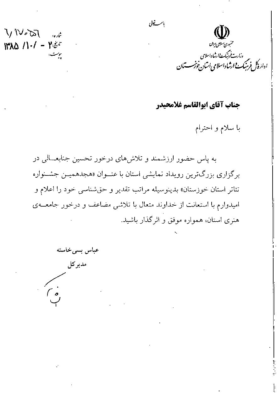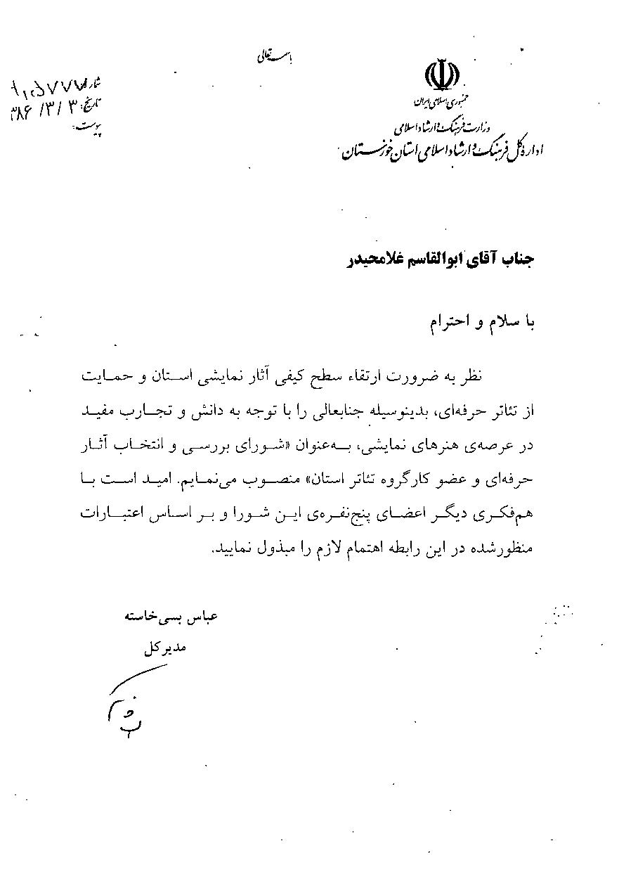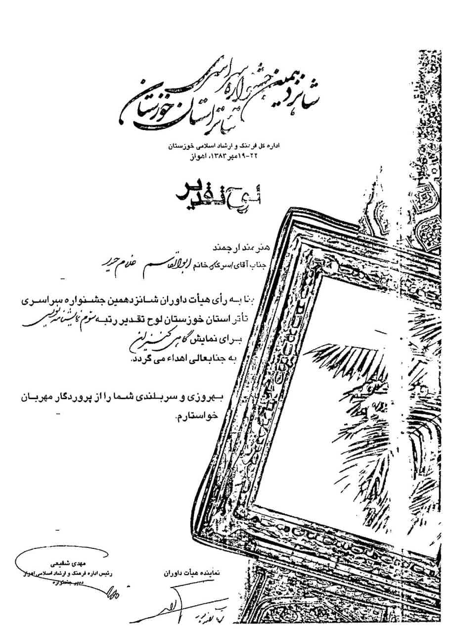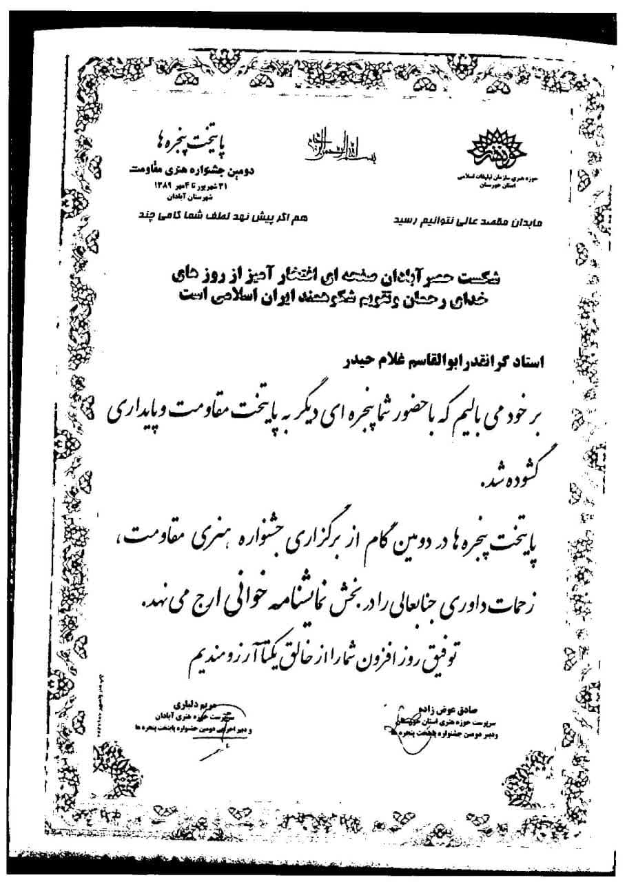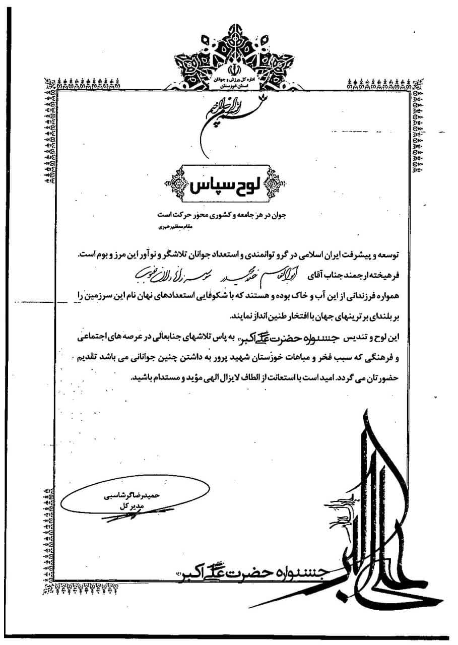 تقدیرنامه ها حکم انتصاب عضو هیئت داوران بخش نقالی و پرده خوانی حکم مسئولیت مدیر اجرایی هجدمین جشنوار تئاتر استان خوزستان بازخوان نوزدهمین جشنواره تئاتر استان خوزستان حکم مسئولیت داور بخش نمایشنامه نویسی سومین جشنواره هنری مقاومت عضو هیات داوران بخش نمایشنامه خوانی نخستین جشنواره بزرگ مقاومت آبادان حکم مسئولیت داور بخش نمایشنامه نویسی سومین جشنواره هنری مقاومت حکم مسئولیت مشاور نخستین جشنواره تئاتر دفاع مقدس خوزستان تقدیرنامه هیجدهمین جشنواره تئاتر استان خوزستان حکم مسئولیت شورای بررسی و انتخاب آثار حرفه ای و عضو کارگروه تئاتر استان خوزستان حکم مسئولیت عضو هیات داوران بخش نمایشنامه خوانی دومین جشنواره هنری مقاومت ویژه شکست حصر آبادان حکم مسئولیت مدیر اجرایی هجدهمین جشنواره تئاتر استان خوزستان حکم مسئولیت عضو هیئت نظارت بر تولیدات و مشاور فنی عضو شورای مشورتی تئاتر خوزستان حکم مسئولیت عضو هیات داوران بخش نمایشنامه خوانی دومین جشنواره هنری مقاومت ویژه شکست حصر آبادان حکم مسئولیت رئیس و عضو هیئت امنا انجمن نمایش حکم مسئول کمیته اجرایی و امور فرهنگی در نحستین جشنواره تئاتر دفاع مقدس خوزستان حکم مسئولیت شورای بررسی و انتخاب آثار حرفه ای و عضو کارگروه تئاتر خوزستان حکم مسئولیت بازخوان نوزدهمین جشنواره تئاتر استان خوزستان مسئول کمیته اجرایی و امور فرهنگی در نخستین جشنواره تئاتر دفاع مقدس خوزستان مشاور نخستین جشنواره تئاتر دفاع مقدس خوزستان حکم مسئولیت عضو هیات نظارت بر تولیدات و مشاور فنی واحد نمایش تقدیرنامه به مناسبت روز جوان حکم مسئولیت مشاور اجرایی در حوزه جوانان حکم مسئولیت عضویت در شورای نظارت بر نمایش شهرستان شوشتر عضو هیات داوران بخش نمایشنامه خوانی نخستین جشنواره بزرگ مقاومت آبادان حکم مسئولیت مشاور بررسی مسائل جوانان حکم عضویت شورای نظارت بر نمایش شهرستان شوشتر حکم مسئولیت عنوان رئیس و عضو هیئت امنا انجمن نمایش تقدیرنامه هجدهمین جشنواره تئاتر استان خوزستان تقدیرنامه در نشر و اعتلای هنر استان خوزستان حکم مسئولیت دبیر جمعیت پیشرفت و عدالت ایران اسلامی در شهرستان شوشتر لوح یادمان بیست و هفتمین جشنواره تئاتر مناطق کشور تقدیرنامه به مناسبت روز جوان تقدیرنامه اجرای نمایش غم در غیاب خداوند حکم مسئولیت راه اندازی خانه تشکلهای جوان در شهرستان ماهشهر بازخوان نوزدهمین جشنواره تئاتر استان خوزستان حکم مسئولیت داور بخش نمایشنامه نویسی سومین جشنوازه هنری مقاومت لوح یادبود نمایش آژیر چهار گوش لوح یادمان جشنواره فرهنگ جوانان خلیج فارس حکم مسئولیت دبیرخانه نشر آثار و پژوهش های انجمن هنرهای نمایشی استان خوزستان حکم مسئولیت مدیر اجرایی هجدهمین جشنواره تئاتر استان خوزستان تقدیرنامه نفر اول جشنواره اتفاق لوح تقدیر دهمین جشنواره استانی نمایش های کوتاه خوزستان حکم مسئولیت داوری اولین سوگواره عرشیان تقدیرنامه جوان منتخب در نخستین جشنواره استانی حضرت علی اکبر تقدیرنامه به مناسبت نوروز تقدیرنامه نفر اول جشنواره اتفاق حکم مسئولیت داور مرحله حضوری مسابقات هنرهای نمایشی در رشته تئاتر صحنه ای دانش آموزان استان خوزستان نبریک هفته میراث فرهنگی لوح یادبود چهارمین جشنواره تئاتر بسیج خوزستان حکم مسئولیت مشاور در نخستین جشنواره تئاتر دفاع مقدس خوزستان حکم مسئولیت عضو هیئت داوران بخش نمایشنامه خوانی نخستین جشنواره بزرگ مقاومت آبادان حکم مسئولیت شورای بررسی و انتخاب آثار حکم مسئولیت عضو هیات داوران بخش نمایشنامه خوانی دومین جشنواره هنری مقاومت ویژه شکست حصر آبادان حکم مسئولیت نماینده هفته نامه عصر کارون در شهرستان شوشتر تقدیرنامه نمایش زیبا و با شکوه آرش بزرگ اسطوره وطن لوح تقدیر سومین جشنواره استانی نمایش های کوتاه لوح تقدیر دومین کتاب دیجیتال نمایشنامه های خوزستان گواهینامه کارگاه تاریخ شفاهی و فن مصاحبه تقدیرنامه نمایش خورشید کاوران حکم مسئولیت دبی