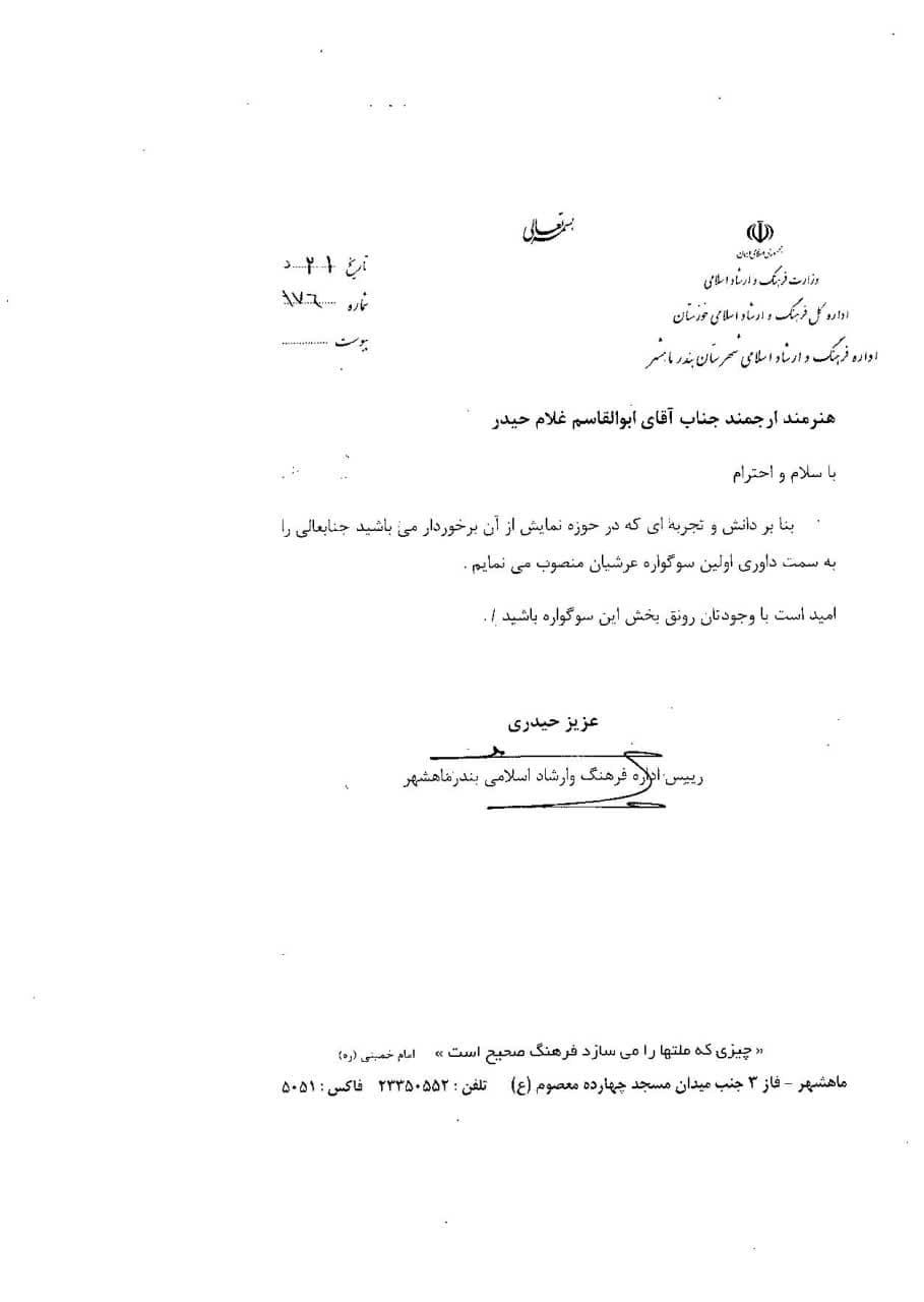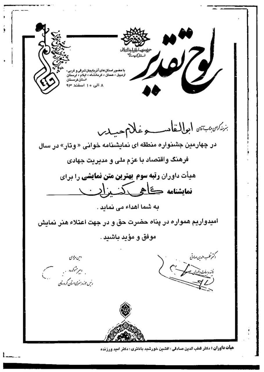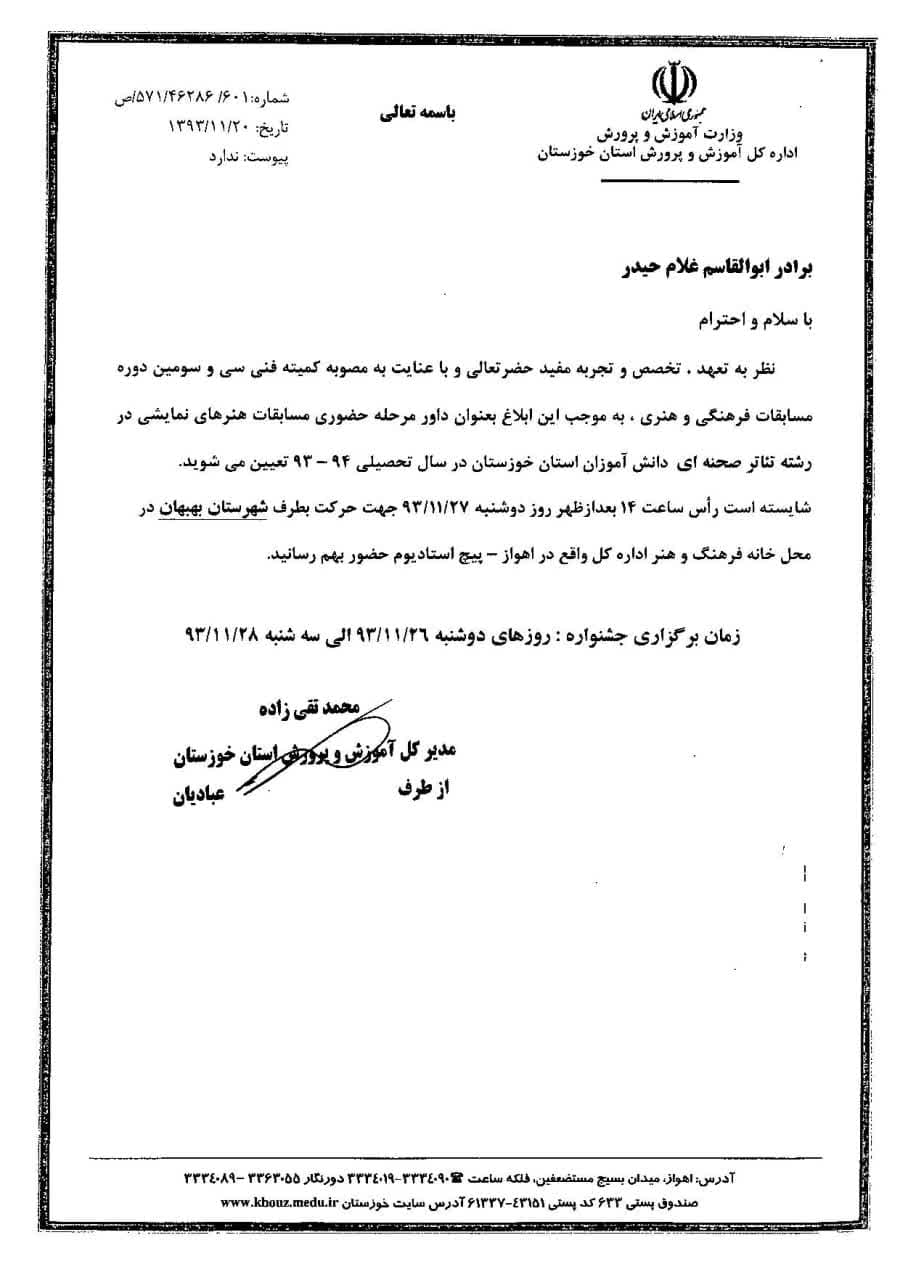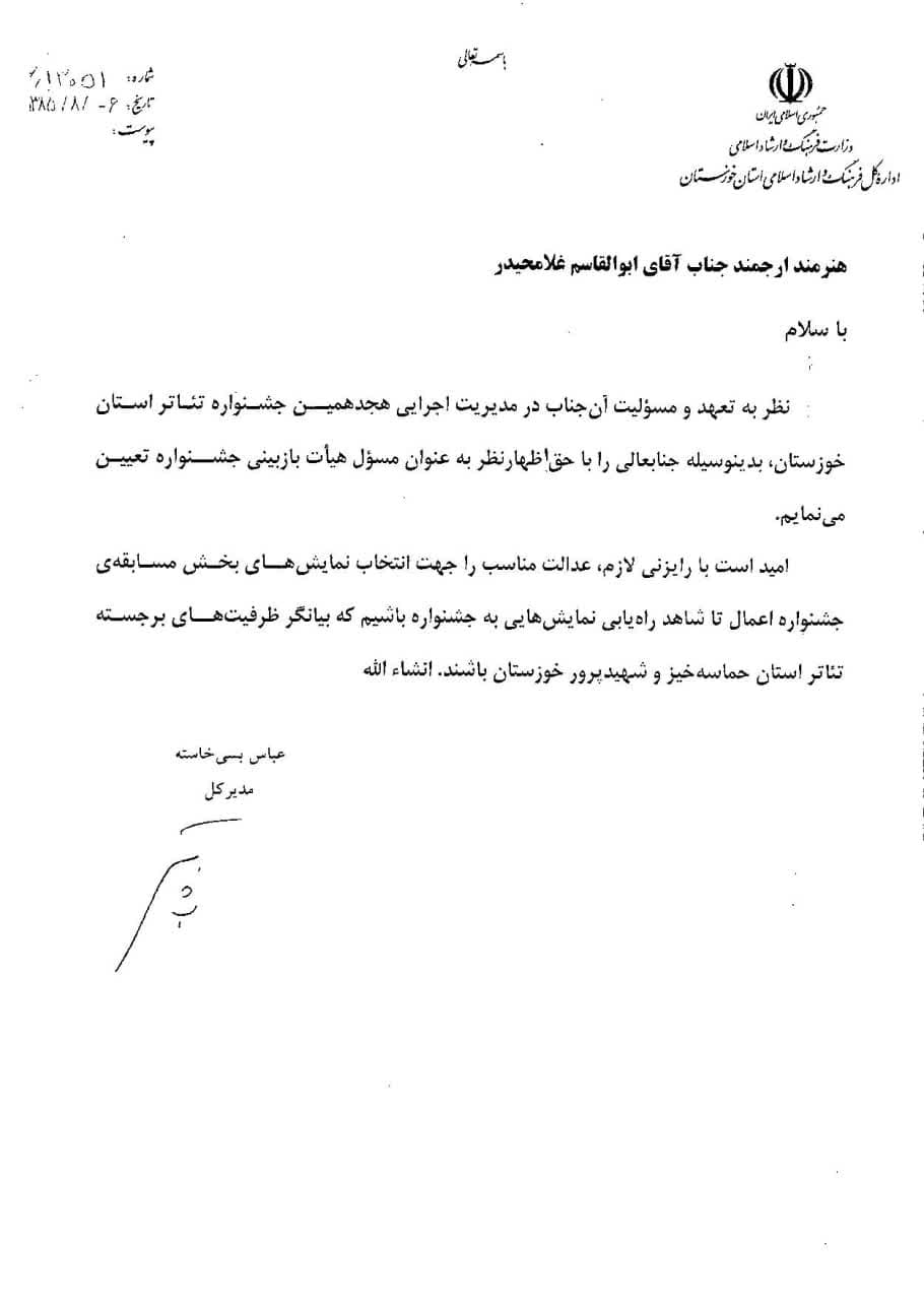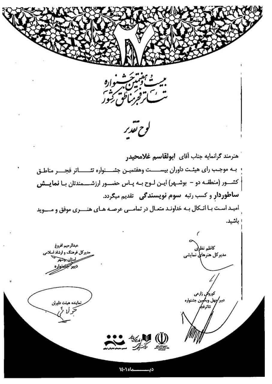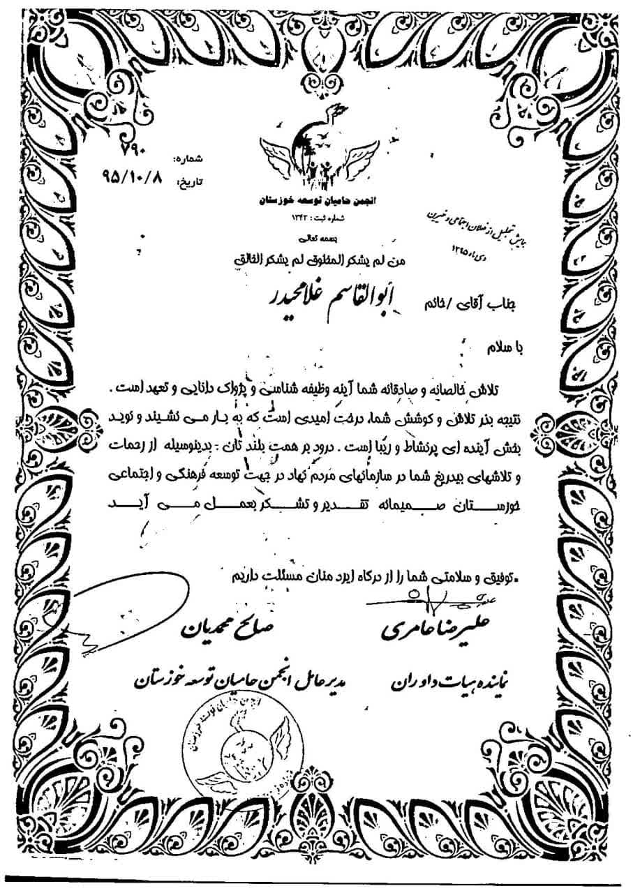 تقدیرنامه ها حکم انتصاب عضو هیئت داوران بخش نقالی و پرده خوانی حکم مسئولیت مدیر اجرایی هجدمین جشنوار تئاتر استان خوزستان بازخوان نوزدهمین جشنواره تئاتر استان خوزستان حکم مسئولیت داور بخش نمایشنامه نویسی سومین جشنواره هنری مقاومت عضو هیات داوران بخش نمایشنامه خوانی نخستین جشنواره بزرگ مقاومت آبادان حکم مسئولیت داور بخش نمایشنامه نویسی سومین جشنواره هنری مقاومت حکم مسئولیت مشاور نخستین جشنواره تئاتر دفاع مقدس خوزستان تقدیرنامه هیجدهمین جشنواره تئاتر استان خوزستان حکم مسئولیت شورای بررسی و انتخاب آثار حرفه ای و عضو کارگروه تئاتر استان خوزستان حکم مسئولیت عضو هیات داوران بخش نمایشنامه خوانی دومین جشنواره هنری مقاومت ویژه شکست حصر آبادان حکم مسئولیت مدیر اجرایی هجدهمین جشنواره تئاتر استان خوزستان حکم مسئولیت عضو هیئت نظارت بر تولیدات و مشاور فنی عضو شورای مشورتی تئاتر خوزستان حکم مسئولیت عضو هیات داوران بخش نمایشنامه خوانی دومین جشنواره هنری مقاومت ویژه شکست حصر آبادان حکم مسئولیت رئیس و عضو هیئت امنا انجمن نمایش حکم مسئول کمیته اجرایی و امور فرهنگی در نحستین جشنواره تئاتر دفاع مقدس خوزستان حکم مسئولیت شورای بررسی و انتخاب آثار حرفه ای و عضو کارگروه تئاتر خوزستان حکم مسئولیت بازخوان نوزدهمین جشنواره تئاتر استان خوزستان مسئول کمیته اجرایی و امور فرهنگی در نخستین جشنواره تئاتر دفاع مقدس خوزستان مشاور نخستین جشنواره تئاتر دفاع مقدس خوزستان حکم مسئولیت عضو هیات نظارت بر تولیدات و مشاور فنی واحد نمایش تقدیرنامه به مناسبت روز جوان حکم مسئولیت مشاور اجرایی در حوزه جوانان حکم مسئولیت عضویت در شورای نظارت بر نمایش شهرستان شوشتر عضو هیات داوران بخش نمایشنامه خوانی نخستین جشنواره بزرگ مقاومت آبادان حکم مسئولیت مشاور بررسی مسائل جوانان حکم عضویت شورای نظارت بر نمایش شهرستان شوشتر حکم مسئولیت عنوان رئیس و عضو هیئت امنا انجمن نمایش تقدیرنامه هجدهمین جشنواره تئاتر استان خوزستان تقدیرنامه در نشر و اعتلای هنر استان خوزستان حکم مسئولیت دبیر جمعیت پیشرفت و عدالت ایران اسلامی در شهرستان شوشتر لوح یادمان بیست و هفتمین جشنواره تئاتر مناطق کشور تقدیرنامه به مناسبت روز جوان تقدیرنامه اجرای نمایش غم در غیاب خداوند حکم مسئولیت راه اندازی خانه تشکلهای جوان در شهرستان ماهشهر بازخوان نوزدهمین جشنواره تئاتر استان خوزستان حکم مسئولیت داور بخش نمایشنامه نویسی سومین جشنوازه هنری مقاومت لوح یادبود نمایش آژیر چهار گوش لوح یادمان جشنواره فرهنگ جوانان خلیج فارس حکم مسئولیت دبیرخانه نشر آثار و پژوهش های انجمن هنرهای نمایشی استان خوزستان حکم مسئولیت مدیر اجرایی هجدهمین جشنواره تئاتر استان خوزستان تقدیرنامه نفر اول جشنواره اتفاق لوح تقدیر دهمین جشنواره استانی نمایش های کوتاه خوزستان حکم مسئولیت داوری اولین سوگواره عرشیان تقدیرنامه جوان منتخب در نخستین جشنواره استانی حضرت علی اکبر تقدیرنامه به مناسبت نوروز تقدیرنامه نفر اول جشنواره اتفاق حکم مسئولیت داور مرحله حضوری مسابقات هنرهای نمایشی در رشته تئاتر صحنه ای دانش آموزان استان خوزستان نبریک هفته میراث فرهنگی لوح یادبود چهارمین جشنواره تئاتر بسیج خوزستان حکم مسئولیت مشاور در نخستین جشنواره تئاتر دفاع مقدس خوزستان حکم مسئولیت عضو هیئت داوران بخش نمایشنامه خوانی نخستین جشنواره بزرگ مقاومت آبادان حکم مسئولیت شورای بررسی و انتخاب آثار حکم مسئولیت عضو هیات داوران بخش نمایشنامه خوانی دومین جشنواره هنری مقاومت ویژه شکست حصر آبادان حکم مسئولیت نماینده هفته نامه عصر کارون در شهرستان شوشتر تقدیرنامه نمایش زیبا و با شکوه آرش بزرگ اسطوره وطن لوح تقدیر سومین جشنواره استانی نمایش های کوتاه لوح تقدیر دومین کتاب دیجیتال نمایشنامه های خوزستان گواهینامه کارگاه تاریخ شفاهی و فن مصاحبه تقدیرنامه نمایش خورشید کاوران حکم مسئولیت دبی