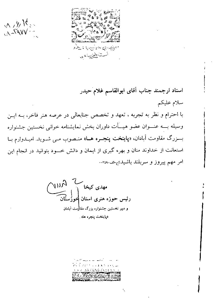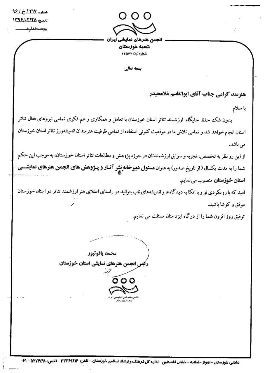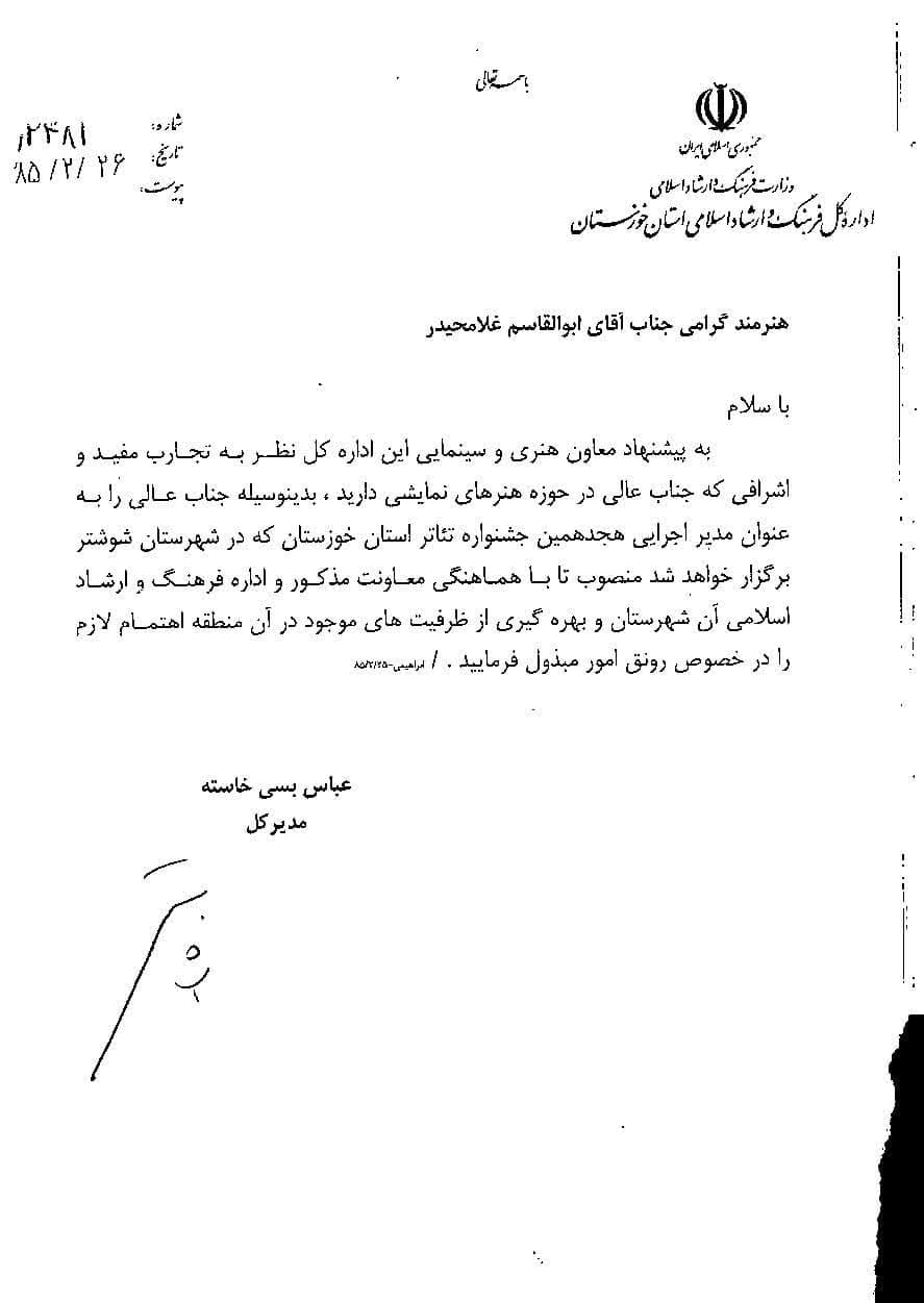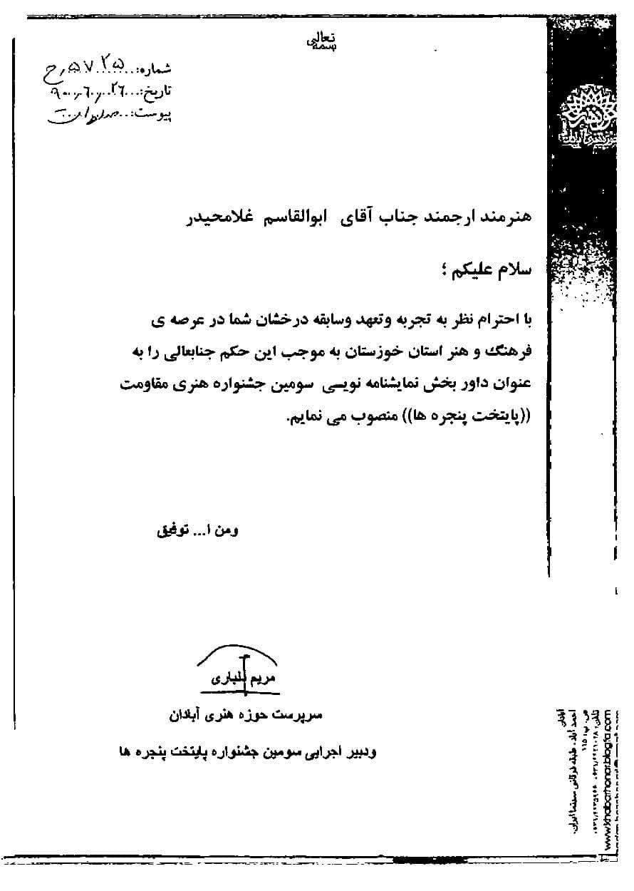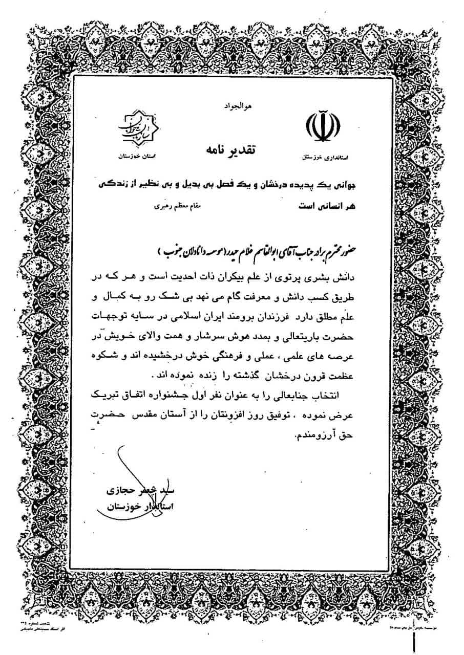 تقدیرنامه ها حکم انتصاب عضو هیئت داوران بخش نقالی و پرده خوانی حکم مسئولیت مدیر اجرایی هجدمین جشنوار تئاتر استان خوزستان بازخوان نوزدهمین جشنواره تئاتر استان خوزستان حکم مسئولیت داور بخش نمایشنامه نویسی سومین جشنواره هنری مقاومت عضو هیات داوران بخش نمایشنامه خوانی نخستین جشنواره بزرگ مقاومت آبادان حکم مسئولیت داور بخش نمایشنامه نویسی سومین جشنواره هنری مقاومت حکم مسئولیت مشاور نخستین جشنواره تئاتر دفاع مقدس خوزستان تقدیرنامه هیجدهمین جشنواره تئاتر استان خوزستان حکم مسئولیت شورای بررسی و انتخاب آثار حرفه ای و عضو کارگروه تئاتر استان خوزستان حکم مسئولیت عضو هیات داوران بخش نمایشنامه خوانی دومین جشنواره هنری مقاومت ویژه شکست حصر آبادان حکم مسئولیت مدیر اجرایی هجدهمین جشنواره تئاتر استان خوزستان حکم مسئولیت عضو هیئت نظارت بر تولیدات و مشاور فنی عضو شورای مشورتی تئاتر خوزستان حکم مسئولیت عضو هیات داوران بخش نمایشنامه خوانی دومین جشنواره هنری مقاومت ویژه شکست حصر آبادان حکم مسئولیت رئیس و عضو هیئت امنا انجمن نمایش حکم مسئول کمیته اجرایی و امور فرهنگی در نحستین جشنواره تئاتر دفاع مقدس خوزستان حکم مسئولیت شورای بررسی و انتخاب آثار حرفه ای و عضو کارگروه تئاتر خوزستان حکم مسئولیت بازخوان نوزدهمین جشنواره تئاتر استان خوزستان مسئول کمیته اجرایی و امور فرهنگی در نخستین جشنواره تئاتر دفاع مقدس خوزستان مشاور نخستین جشنواره تئاتر دفاع مقدس خوزستان حکم مسئولیت عضو هیات نظارت بر تولیدات و مشاور فنی واحد نمایش تقدیرنامه به مناسبت روز جوان حکم مسئولیت مشاور اجرایی در حوزه جوانان حکم مسئولیت عضویت در شورای نظارت بر نمایش شهرستان شوشتر عضو هیات داوران بخش نمایشنامه خوانی نخستین جشنواره بزرگ مقاومت آبادان حکم مسئولیت مشاور بررسی مسائل جوانان حکم عضویت شورای نظارت بر نمایش شهرستان شوشتر حکم مسئولیت عنوان رئیس و عضو هیئت امنا انجمن نمایش تقدیرنامه هجدهمین جشنواره تئاتر استان خوزستان تقدیرنامه در نشر و اعتلای هنر استان خوزستان حکم مسئولیت دبیر جمعیت پیشرفت و عدالت ایران اسلامی در شهرستان شوشتر لوح یادمان بیست و هفتمین جشنواره تئاتر مناطق کشور تقدیرنامه به مناسبت روز جوان تقدیرنامه اجرای نمایش غم در غیاب خداوند حکم مسئولیت راه اندازی خانه تشکلهای جوان در شهرستان ماهشهر بازخوان نوزدهمین جشنواره تئاتر استان خوزستان حکم مسئولیت داور بخش نمایشنامه نویسی سومین جشنوازه هنری مقاومت لوح یادبود نمایش آژیر چهار گوش لوح یادمان جشنواره فرهنگ جوانان خلیج فارس حکم مسئولیت دبیرخانه نشر آثار و پژوهش های انجمن هنرهای نمایشی استان خوزستان حکم مسئولیت مدیر اجرایی هجدهمین جشنواره تئاتر استان خوزستان تقدیرنامه نفر اول جشنواره اتفاق لوح تقدیر دهمین جشنواره استانی نمایش های کوتاه خوزستان حکم مسئولیت داوری اولین سوگواره عرشیان تقدیرنامه جوان منتخب در نخستین جشنواره استانی حضرت علی اکبر تقدیرنامه به مناسبت نوروز تقدیرنامه نفر اول جشنواره اتفاق حکم مسئولیت داور مرحله حضوری مسابقات هنرهای نمایشی در رشته تئاتر صحنه ای دانش آموزان استان خوزستان نبریک هفته میراث فرهنگی لوح یادبود چهارمین جشنواره تئاتر بسیج خوزستان حکم مسئولیت مشاور در نخستین جشنواره تئاتر دفاع مقدس خوزستان حکم مسئولیت عضو هیئت داوران بخش نمایشنامه خوانی نخستین جشنواره بزرگ مقاومت آبادان حکم مسئولیت شورای بررسی و انتخاب آثار حکم مسئولیت عضو هیات داوران بخش نمایشنامه خوانی دومین جشنواره هنری مقاومت ویژه شکست حصر آبادان حکم مسئولیت نماینده هفته نامه عصر کارون در شهرستان شوشتر تقدیرنامه نمایش زیبا و با شکوه آرش بزرگ اسطوره وطن لوح تقدیر سومین جشنواره استانی نمایش های کوتاه لوح تقدیر دومین کتاب دیجیتال نمایشنامه های خوزستان گواهینامه کارگاه تاریخ شفاهی و فن مصاحبه تقدیرنامه نمایش خورشید کاوران حکم مسئولیت دبی