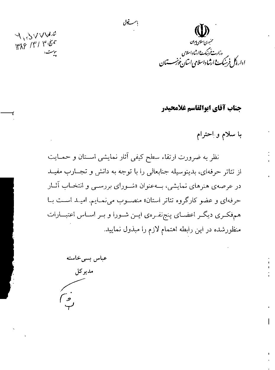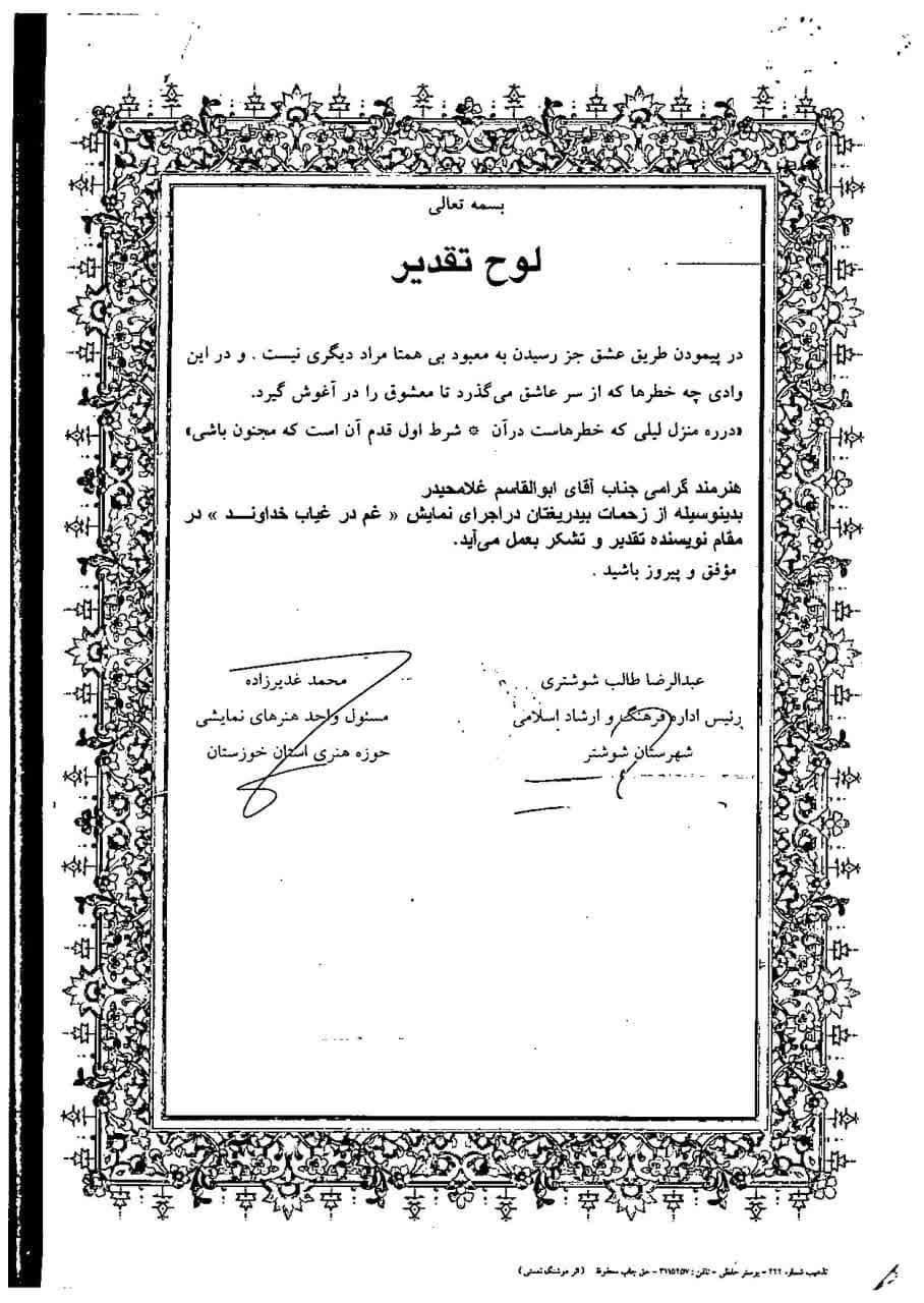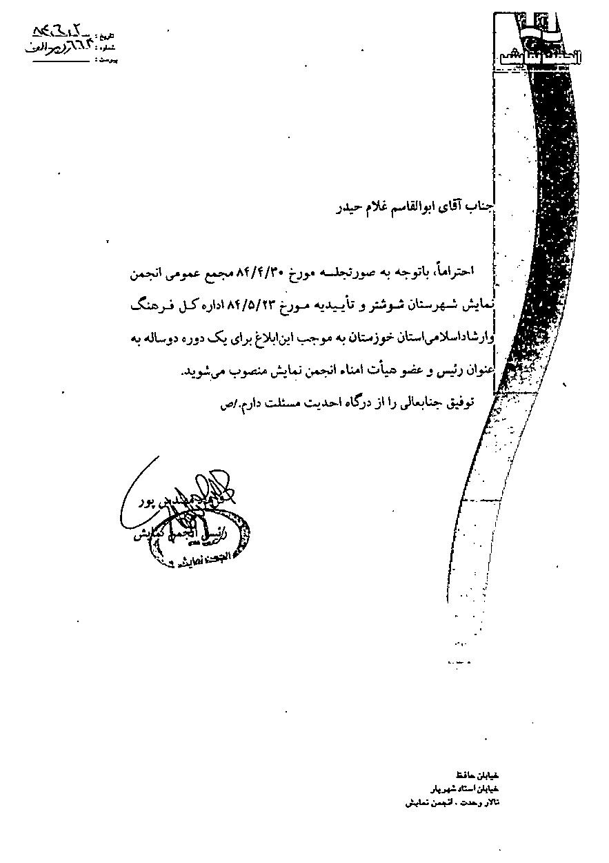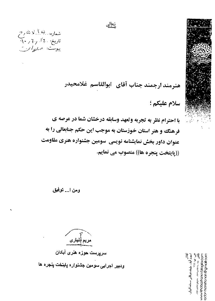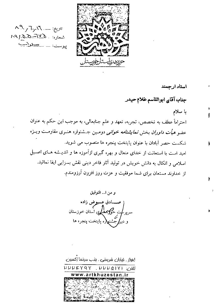 تقدیرنامه ها حکم انتصاب عضو هیئت داوران بخش نقالی و پرده خوانی حکم مسئولیت مدیر اجرایی هجدمین جشنوار تئاتر استان خوزستان بازخوان نوزدهمین جشنواره تئاتر استان خوزستان حکم مسئولیت داور بخش نمایشنامه نویسی سومین جشنواره هنری مقاومت عضو هیات داوران بخش نمایشنامه خوانی نخستین جشنواره بزرگ مقاومت آبادان حکم مسئولیت داور بخش نمایشنامه نویسی سومین جشنواره هنری مقاومت حکم مسئولیت مشاور نخستین جشنواره تئاتر دفاع مقدس خوزستان تقدیرنامه هیجدهمین جشنواره تئاتر استان خوزستان حکم مسئولیت شورای بررسی و انتخاب آثار حرفه ای و عضو کارگروه تئاتر استان خوزستان حکم مسئولیت عضو هیات داوران بخش نمایشنامه خوانی دومین جشنواره هنری مقاومت ویژه شکست حصر آبادان حکم مسئولیت مدیر اجرایی هجدهمین جشنواره تئاتر استان خوزستان حکم مسئولیت عضو هیئت نظارت بر تولیدات و مشاور فنی عضو شورای مشورتی تئاتر خوزستان حکم مسئولیت عضو هیات داوران بخش نمایشنامه خوانی دومین جشنواره هنری مقاومت ویژه شکست حصر آبادان حکم مسئولیت رئیس و عضو هیئت امنا انجمن نمایش حکم مسئول کمیته اجرایی و امور فرهنگی در نحستین جشنواره تئاتر دفاع مقدس خوزستان حکم مسئولیت شورای بررسی و انتخاب آثار حرفه ای و عضو کارگروه تئاتر خوزستان حکم مسئولیت بازخوان نوزدهمین جشنواره تئاتر استان خوزستان مسئول کمیته اجرایی و امور فرهنگی در نخستین جشنواره تئاتر دفاع مقدس خوزستان مشاور نخستین جشنواره تئاتر دفاع مقدس خوزستان حکم مسئولیت عضو هیات نظارت بر تولیدات و مشاور فنی واحد نمایش تقدیرنامه به مناسبت روز جوان حکم مسئولیت مشاور اجرایی در حوزه جوانان حکم مسئولیت عضویت در شورای نظارت بر نمایش شهرستان شوشتر عضو هیات داوران بخش نمایشنامه خوانی نخستین جشنواره بزرگ مقاومت آبادان حکم مسئولیت مشاور بررسی مسائل جوانان حکم عضویت شورای نظارت بر نمایش شهرستان شوشتر حکم مسئولیت عنوان رئیس و عضو هیئت امنا انجمن نمایش تقدیرنامه هجدهمین جشنواره تئاتر استان خوزستان تقدیرنامه در نشر و اعتلای هنر استان خوزستان حکم مسئولیت دبیر جمعیت پیشرفت و عدالت ایران اسلامی در شهرستان شوشتر لوح یادمان بیست و هفتمین جشنواره تئاتر مناطق کشور تقدیرنامه به مناسبت روز جوان تقدیرنامه اجرای نمایش غم در غیاب خداوند حکم مسئولیت راه اندازی خانه تشکلهای جوان در شهرستان ماهشهر بازخوان نوزدهمین جشنواره تئاتر استان خوزستان حکم مسئولیت داور بخش نمایشنامه نویسی سومین جشنوازه هنری مقاومت لوح یادبود نمایش آژیر چهار گوش لوح یادمان جشنواره فرهنگ جوانان خلیج فارس حکم مسئولیت دبیرخانه نشر آثار و پژوهش های انجمن هنرهای نمایشی استان خوزستان حکم مسئولیت مدیر اجرایی هجدهمین جشنواره تئاتر استان خوزستان تقدیرنامه نفر اول جشنواره اتفاق لوح تقدیر دهمین جشنواره استانی نمایش های کوتاه خوزستان حکم مسئولیت داوری اولین سوگواره عرشیان تقدیرنامه جوان منتخب در نخستین جشنواره استانی حضرت علی اکبر تقدیرنامه به مناسبت نوروز تقدیرنامه نفر اول جشنواره اتفاق حکم مسئولیت داور مرحله حضوری مسابقات هنرهای نمایشی در رشته تئاتر صحنه ای دانش آموزان استان خوزستان نبریک هفته میراث فرهنگی لوح یادبود چهارمین جشنواره تئاتر بسیج خوزستان حکم مسئولیت مشاور در نخستین جشنواره تئاتر دفاع مقدس خوزستان حکم مسئولیت عضو هیئت داوران بخش نمایشنامه خوانی نخستین جشنواره بزرگ مقاومت آبادان حکم مسئولیت شورای بررسی و انتخاب آثار حکم مسئولیت عضو هیات داوران بخش نمایشنامه خوانی دومین جشنواره هنری مقاومت ویژه شکست حصر آبادان حکم مسئولیت نماینده هفته نامه عصر کارون در شهرستان شوشتر تقدیرنامه نمایش زیبا و با شکوه آرش بزرگ اسطوره وطن لوح تقدیر سومین جشنواره استانی نمایش های کوتاه لوح تقدیر دومین کتاب دیجیتال نمایشنامه های خوزستان گواهینامه کارگاه تاریخ شفاهی و فن مصاحبه تقدیرنامه نمایش خورشید کاوران حکم مسئولیت دبی