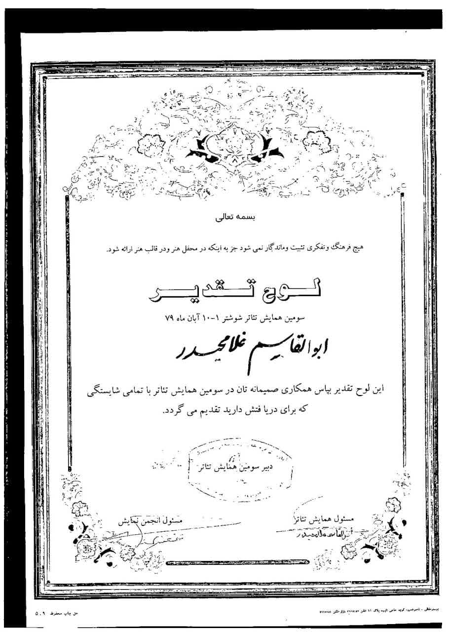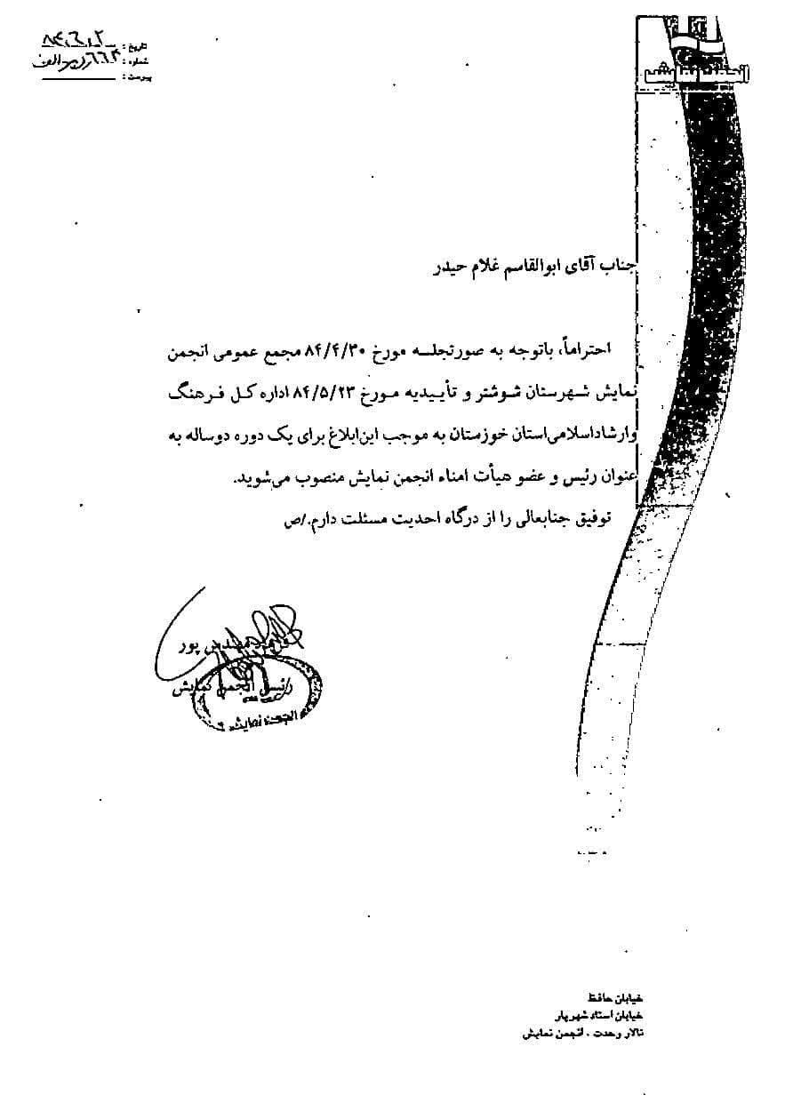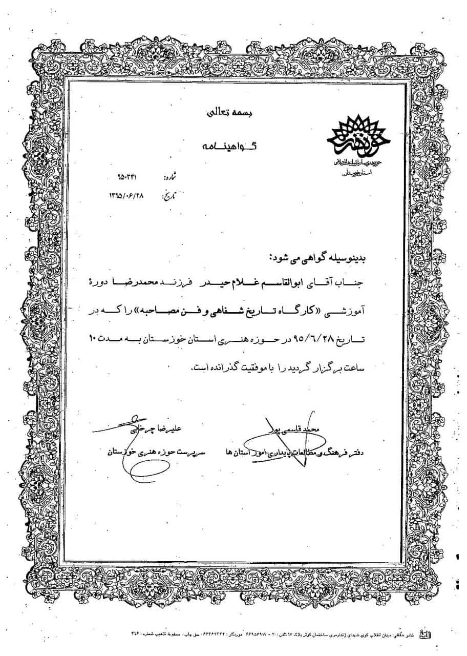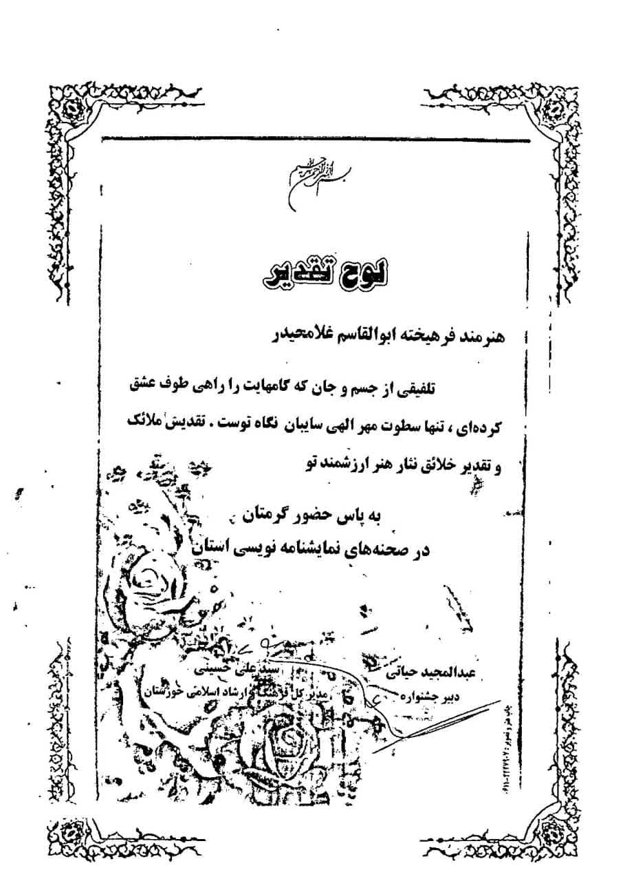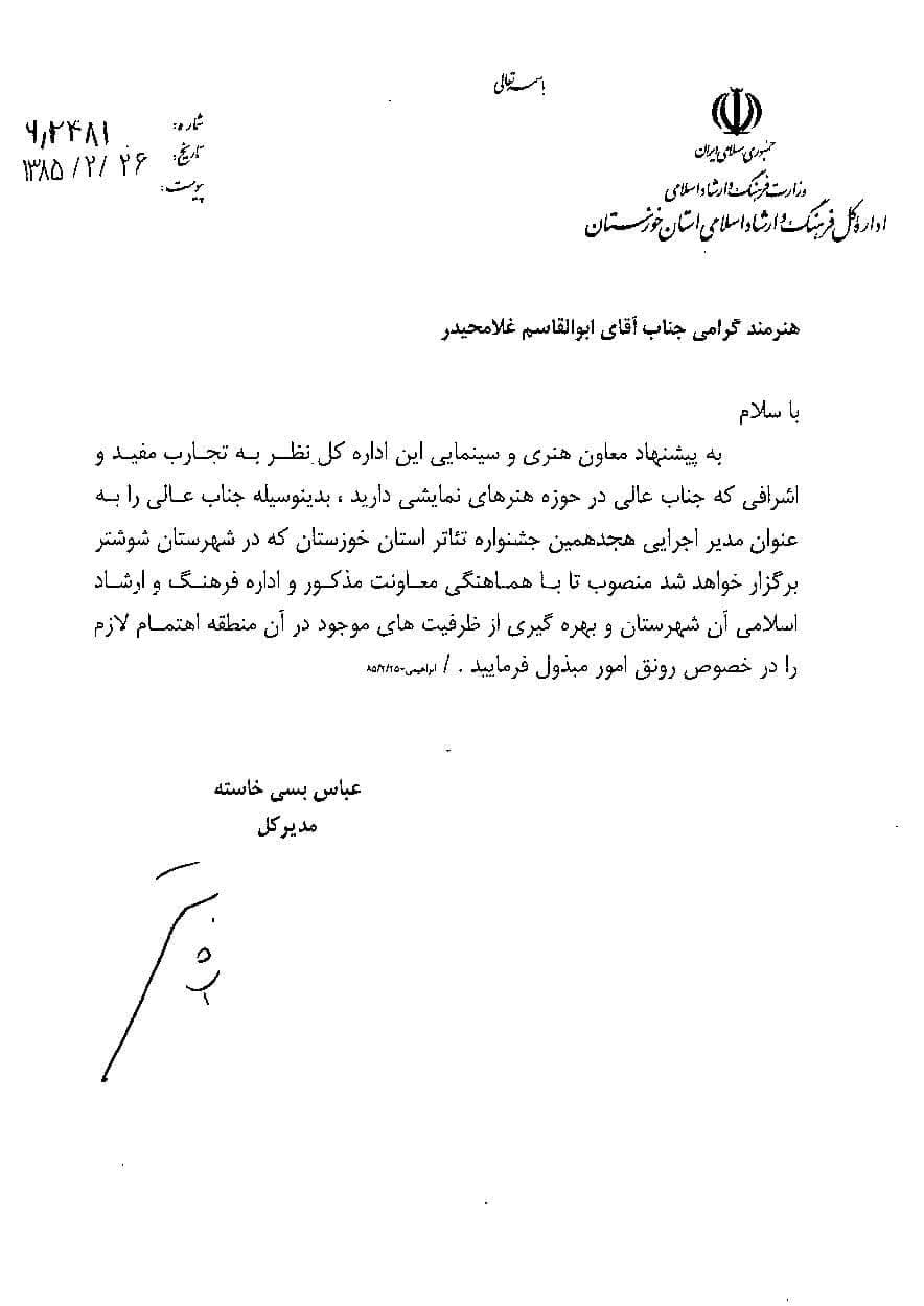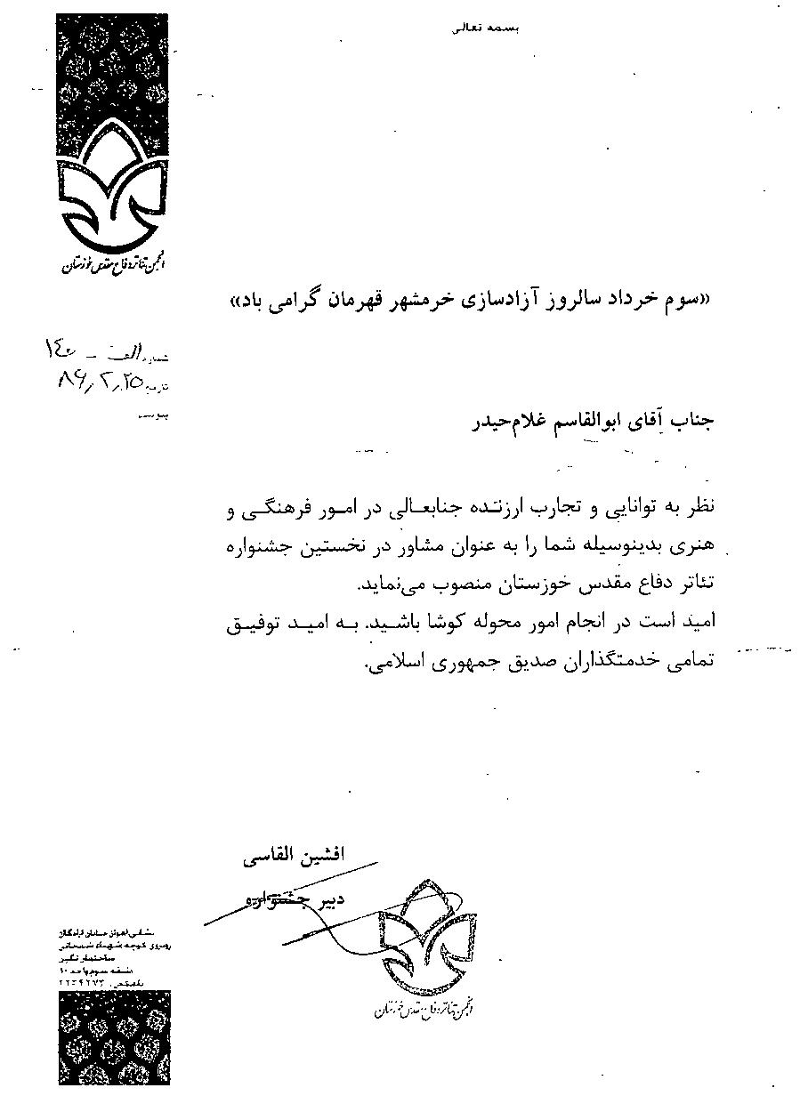 تقدیرنامه ها حکم انتصاب عضو هیئت داوران بخش نقالی و پرده خوانی حکم مسئولیت مدیر اجرایی هجدمین جشنوار تئاتر استان خوزستان بازخوان نوزدهمین جشنواره تئاتر استان خوزستان حکم مسئولیت داور بخش نمایشنامه نویسی سومین جشنواره هنری مقاومت عضو هیات داوران بخش نمایشنامه خوانی نخستین جشنواره بزرگ مقاومت آبادان حکم مسئولیت داور بخش نمایشنامه نویسی سومین جشنواره هنری مقاومت حکم مسئولیت مشاور نخستین جشنواره تئاتر دفاع مقدس خوزستان تقدیرنامه هیجدهمین جشنواره تئاتر استان خوزستان حکم مسئولیت شورای بررسی و انتخاب آثار حرفه ای و عضو کارگروه تئاتر استان خوزستان حکم مسئولیت عضو هیات داوران بخش نمایشنامه خوانی دومین جشنواره هنری مقاومت ویژه شکست حصر آبادان حکم مسئولیت مدیر اجرایی هجدهمین جشنواره تئاتر استان خوزستان حکم مسئولیت عضو هیئت نظارت بر تولیدات و مشاور فنی عضو شورای مشورتی تئاتر خوزستان حکم مسئولیت عضو هیات داوران بخش نمایشنامه خوانی دومین جشنواره هنری مقاومت ویژه شکست حصر آبادان حکم مسئولیت رئیس و عضو هیئت امنا انجمن نمایش حکم مسئول کمیته اجرایی و امور فرهنگی در نحستین جشنواره تئاتر دفاع مقدس خوزستان حکم مسئولیت شورای بررسی و انتخاب آثار حرفه ای و عضو کارگروه تئاتر خوزستان حکم مسئولیت بازخوان نوزدهمین جشنواره تئاتر استان خوزستان مسئول کمیته اجرایی و امور فرهنگی در نخستین جشنواره تئاتر دفاع مقدس خوزستان مشاور نخستین جشنواره تئاتر دفاع مقدس خوزستان حکم مسئولیت عضو هیات نظارت بر تولیدات و مشاور فنی واحد نمایش تقدیرنامه به مناسبت روز جوان حکم مسئولیت مشاور اجرایی در حوزه جوانان حکم مسئولیت عضویت در شورای نظارت بر نمایش شهرستان شوشتر عضو هیات داوران بخش نمایشنامه خوانی نخستین جشنواره بزرگ مقاومت آبادان حکم مسئولیت مشاور بررسی مسائل جوانان حکم عضویت شورای نظارت بر نمایش شهرستان شوشتر حکم مسئولیت عنوان رئیس و عضو هیئت امنا انجمن نمایش تقدیرنامه هجدهمین جشنواره تئاتر استان خوزستان تقدیرنامه در نشر و اعتلای هنر استان خوزستان حکم مسئولیت دبیر جمعیت پیشرفت و عدالت ایران اسلامی در شهرستان شوشتر لوح یادمان بیست و هفتمین جشنواره تئاتر مناطق کشور تقدیرنامه به مناسبت روز جوان تقدیرنامه اجرای نمایش غم در غیاب خداوند حکم مسئولیت راه اندازی خانه تشکلهای جوان در شهرستان ماهشهر بازخوان نوزدهمین جشنواره تئاتر استان خوزستان حکم مسئولیت داور بخش نمایشنامه نویسی سومین جشنوازه هنری مقاومت لوح یادبود نمایش آژیر چهار گوش لوح یادمان جشنواره فرهنگ جوانان خلیج فارس حکم مسئولیت دبیرخانه نشر آثار و پژوهش های انجمن هنرهای نمایشی استان خوزستان حکم مسئولیت مدیر اجرایی هجدهمین جشنواره تئاتر استان خوزستان تقدیرنامه نفر اول جشنواره اتفاق لوح تقدیر دهمین جشنواره استانی نمایش های کوتاه خوزستان حکم مسئولیت داوری اولین سوگواره عرشیان تقدیرنامه جوان منتخب در نخستین جشنواره استانی حضرت علی اکبر تقدیرنامه به مناسبت نوروز تقدیرنامه نفر اول جشنواره اتفاق حکم مسئولیت داور مرحله حضوری مسابقات هنرهای نمایشی در رشته تئاتر صحنه ای دانش آموزان استان خوزستان نبریک هفته میراث فرهنگی لوح یادبود چهارمین جشنواره تئاتر بسیج خوزستان حکم مسئولیت مشاور در نخستین جشنواره تئاتر دفاع مقدس خوزستان حکم مسئولیت عضو هیئت داوران بخش نمایشنامه خوانی نخستین جشنواره بزرگ مقاومت آبادان حکم مسئولیت شورای بررسی و انتخاب آثار حکم مسئولیت عضو هیات داوران بخش نمایشنامه خوانی دومین جشنواره هنری مقاومت ویژه شکست حصر آبادان حکم مسئولیت نماینده هفته نامه عصر کارون در شهرستان شوشتر تقدیرنامه نمایش زیبا و با شکوه آرش بزرگ اسطوره وطن لوح تقدیر سومین جشنواره استانی نمایش های کوتاه لوح تقدیر دومین کتاب دیجیتال نمایشنامه های خوزستان گواهینامه کارگاه تاریخ شفاهی و فن مصاحبه تقدیرنامه نمایش خورشید کاوران حکم مسئولیت دبی