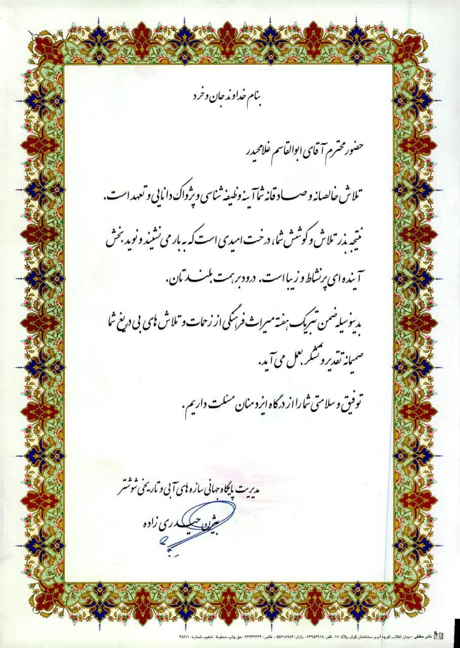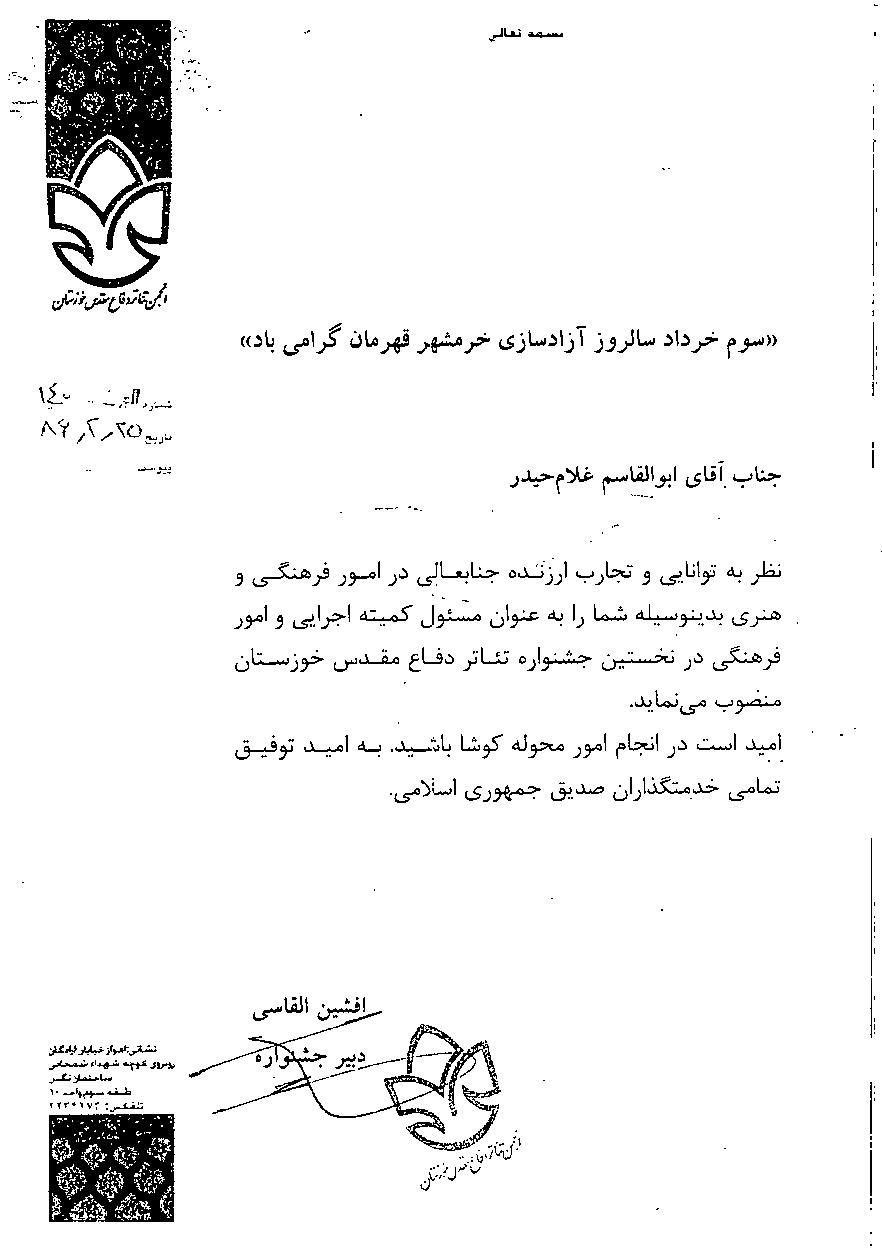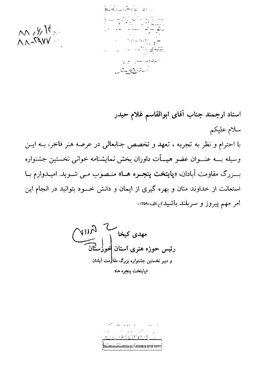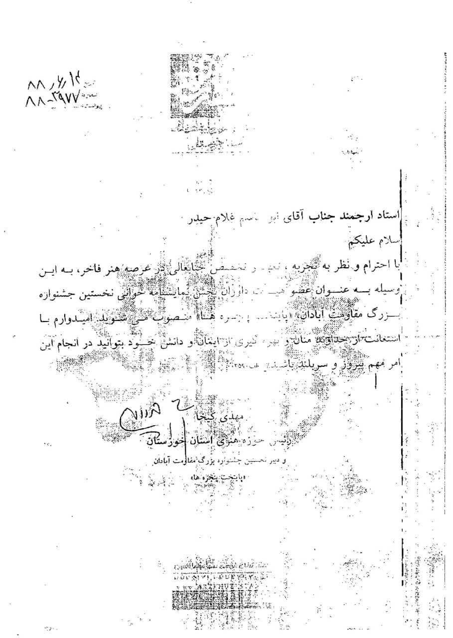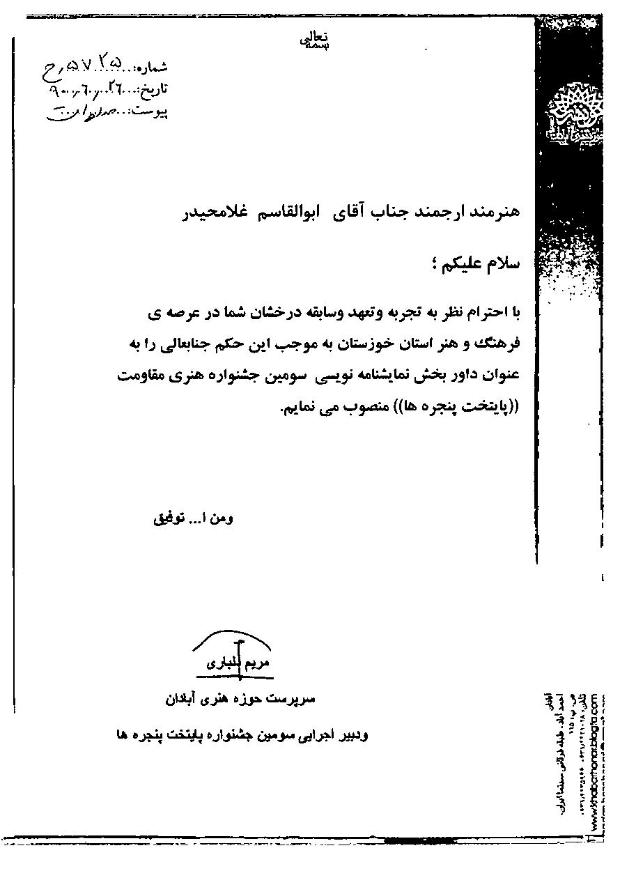 تقدیرنامه ها حکم انتصاب عضو هیئت داوران بخش نقالی و پرده خوانی حکم مسئولیت مدیر اجرایی هجدمین جشنوار تئاتر استان خوزستان بازخوان نوزدهمین جشنواره تئاتر استان خوزستان حکم مسئولیت داور بخش نمایشنامه نویسی سومین جشنواره هنری مقاومت عضو هیات داوران بخش نمایشنامه خوانی نخستین جشنواره بزرگ مقاومت آبادان حکم مسئولیت داور بخش نمایشنامه نویسی سومین جشنواره هنری مقاومت حکم مسئولیت مشاور نخستین جشنواره تئاتر دفاع مقدس خوزستان تقدیرنامه هیجدهمین جشنواره تئاتر استان خوزستان حکم مسئولیت شورای بررسی و انتخاب آثار حرفه ای و عضو کارگروه تئاتر استان خوزستان حکم مسئولیت عضو هیات داوران بخش نمایشنامه خوانی دومین جشنواره هنری مقاومت ویژه شکست حصر آبادان حکم مسئولیت مدیر اجرایی هجدهمین جشنواره تئاتر استان خوزستان حکم مسئولیت عضو هیئت نظارت بر تولیدات و مشاور فنی عضو شورای مشورتی تئاتر خوزستان حکم مسئولیت عضو هیات داوران بخش نمایشنامه خوانی دومین جشنواره هنری مقاومت ویژه شکست حصر آبادان حکم مسئولیت رئیس و عضو هیئت امنا انجمن نمایش حکم مسئول کمیته اجرایی و امور فرهنگی در نحستین جشنواره تئاتر دفاع مقدس خوزستان حکم مسئولیت شورای بررسی و انتخاب آثار حرفه ای و عضو کارگروه تئاتر خوزستان حکم مسئولیت بازخوان نوزدهمین جشنواره تئاتر استان خوزستان مسئول کمیته اجرایی و امور فرهنگی در نخستین جشنواره تئاتر دفاع مقدس خوزستان مشاور نخستین جشنواره تئاتر دفاع مقدس خوزستان حکم مسئولیت عضو هیات نظارت بر تولیدات و مشاور فنی واحد نمایش تقدیرنامه به مناسبت روز جوان حکم مسئولیت مشاور اجرایی در حوزه جوانان حکم مسئولیت عضویت در شورای نظارت بر نمایش شهرستان شوشتر عضو هیات داوران بخش نمایشنامه خوانی نخستین جشنواره بزرگ مقاومت آبادان حکم مسئولیت مشاور بررسی مسائل جوانان حکم عضویت شورای نظارت بر نمایش شهرستان شوشتر حکم مسئولیت عنوان رئیس و عضو هیئت امنا انجمن نمایش تقدیرنامه هجدهمین جشنواره تئاتر استان خوزستان تقدیرنامه در نشر و اعتلای هنر استان خوزستان حکم مسئولیت دبیر جمعیت پیشرفت و عدالت ایران اسلامی در شهرستان شوشتر لوح یادمان بیست و هفتمین جشنواره تئاتر مناطق کشور تقدیرنامه به مناسبت روز جوان تقدیرنامه اجرای نمایش غم در غیاب خداوند حکم مسئولیت راه اندازی خانه تشکلهای جوان در شهرستان ماهشهر بازخوان نوزدهمین جشنواره تئاتر استان خوزستان حکم مسئولیت داور بخش نمایشنامه نویسی سومین جشنوازه هنری مقاومت لوح یادبود نمایش آژیر چهار گوش لوح یادمان جشنواره فرهنگ جوانان خلیج فارس حکم مسئولیت دبیرخانه نشر آثار و پژوهش های انجمن هنرهای نمایشی استان خوزستان حکم مسئولیت مدیر اجرایی هجدهمین جشنواره تئاتر استان خوزستان تقدیرنامه نفر اول جشنواره اتفاق لوح تقدیر دهمین جشنواره استانی نمایش های کوتاه خوزستان حکم مسئولیت داوری اولین سوگواره عرشیان تقدیرنامه جوان منتخب در نخستین جشنواره استانی حضرت علی اکبر تقدیرنامه به مناسبت نوروز تقدیرنامه نفر اول جشنواره اتفاق حکم مسئولیت داور مرحله حضوری مسابقات هنرهای نمایشی در رشته تئاتر صحنه ای دانش آموزان استان خوزستان نبریک هفته میراث فرهنگی لوح یادبود چهارمین جشنواره تئاتر بسیج خوزستان حکم مسئولیت مشاور در نخستین جشنواره تئاتر دفاع مقدس خوزستان حکم مسئولیت عضو هیئت داوران بخش نمایشنامه خوانی نخستین جشنواره بزرگ مقاومت آبادان حکم مسئولیت شورای بررسی و انتخاب آثار حکم مسئولیت عضو هیات داوران بخش نمایشنامه خوانی دومین جشنواره هنری مقاومت ویژه شکست حصر آبادان حکم مسئولیت نماینده هفته نامه عصر کارون در شهرستان شوشتر تقدیرنامه نمایش زیبا و با شکوه آرش بزرگ اسطوره وطن لوح تقدیر سومین جشنواره استانی نمایش های کوتاه لوح تقدیر دومین کتاب دیجیتال نمایشنامه های خوزستان گواهینامه کارگاه تاریخ شفاهی و فن مصاحبه تقدیرنامه نمایش خورشید کاوران حکم مسئولیت دبی