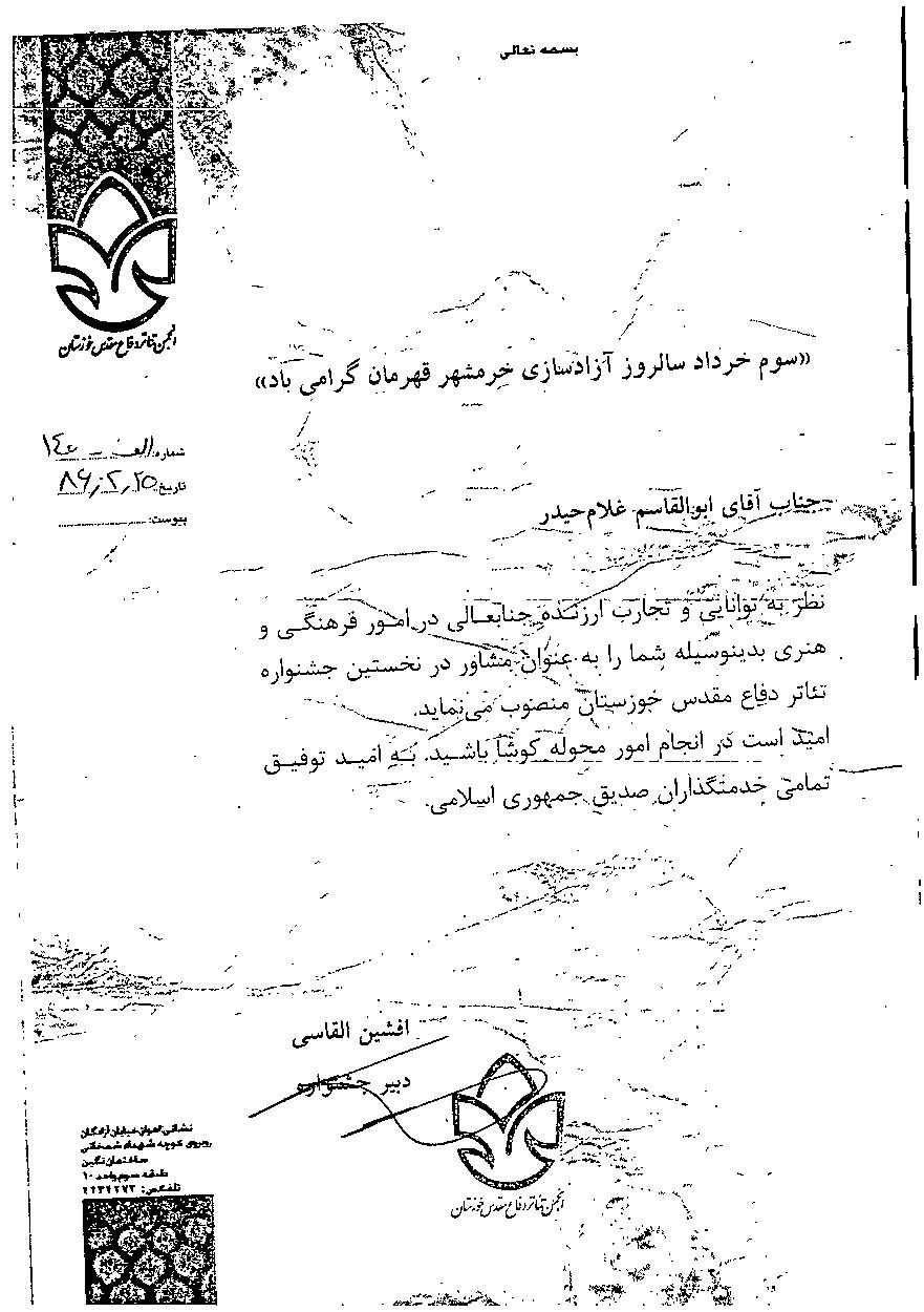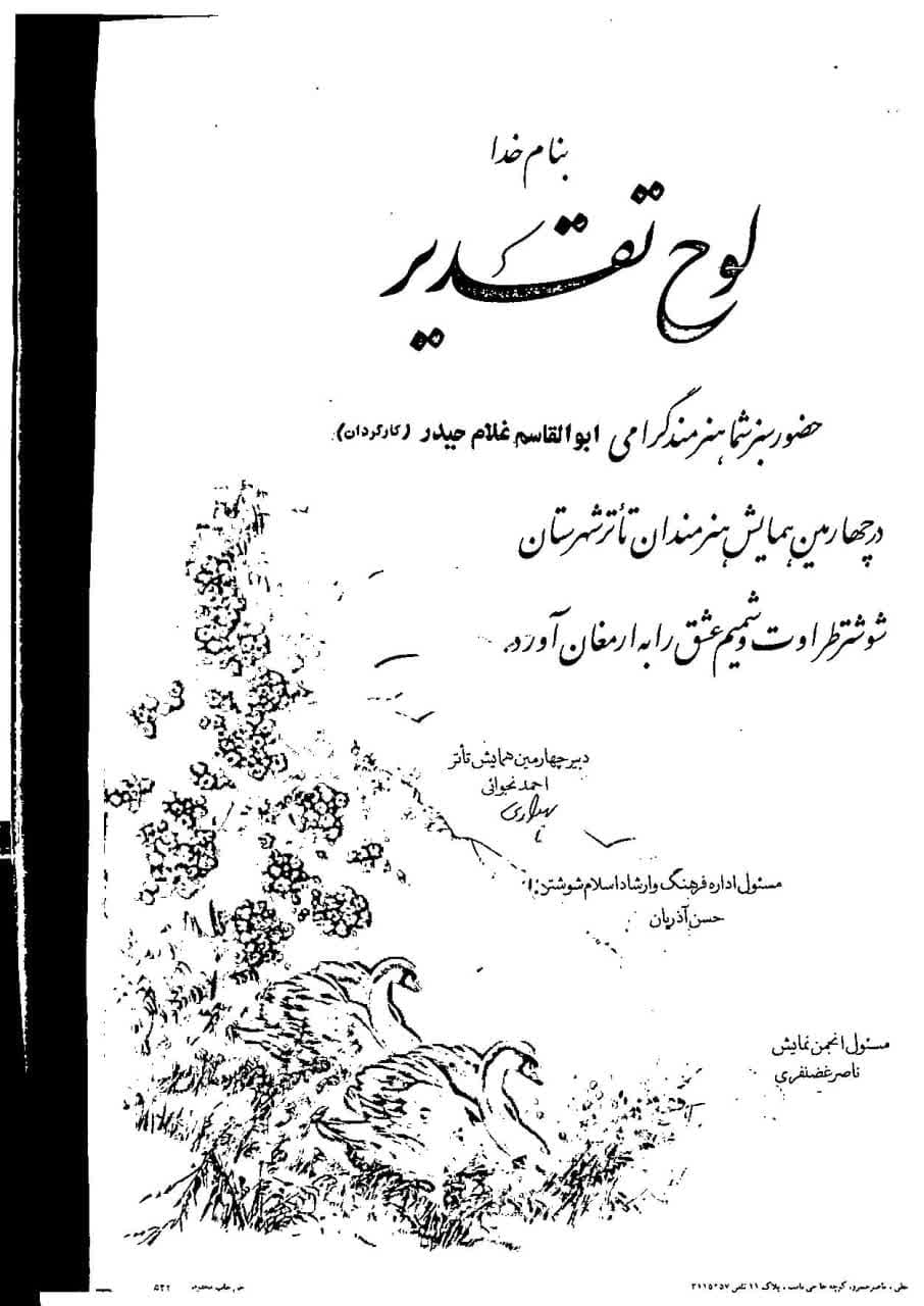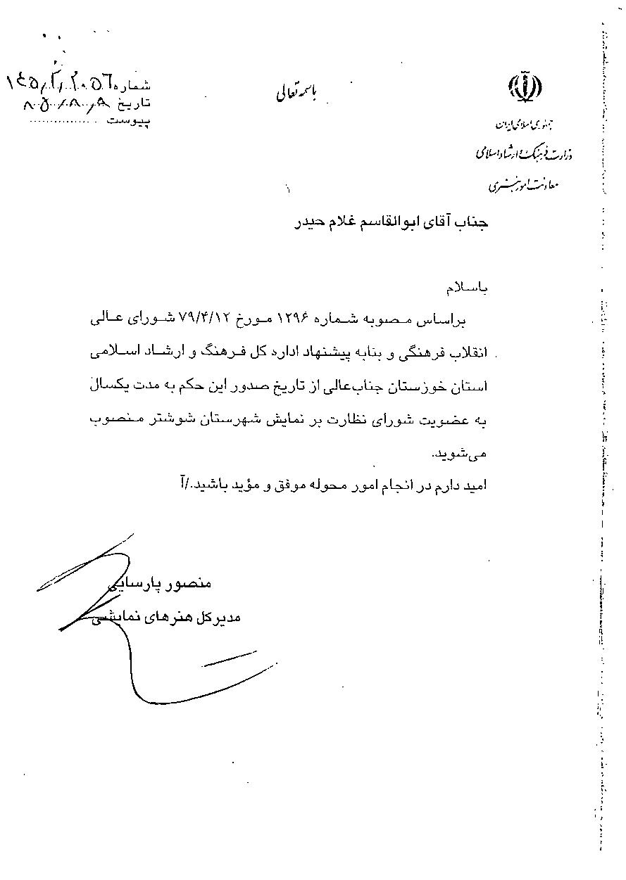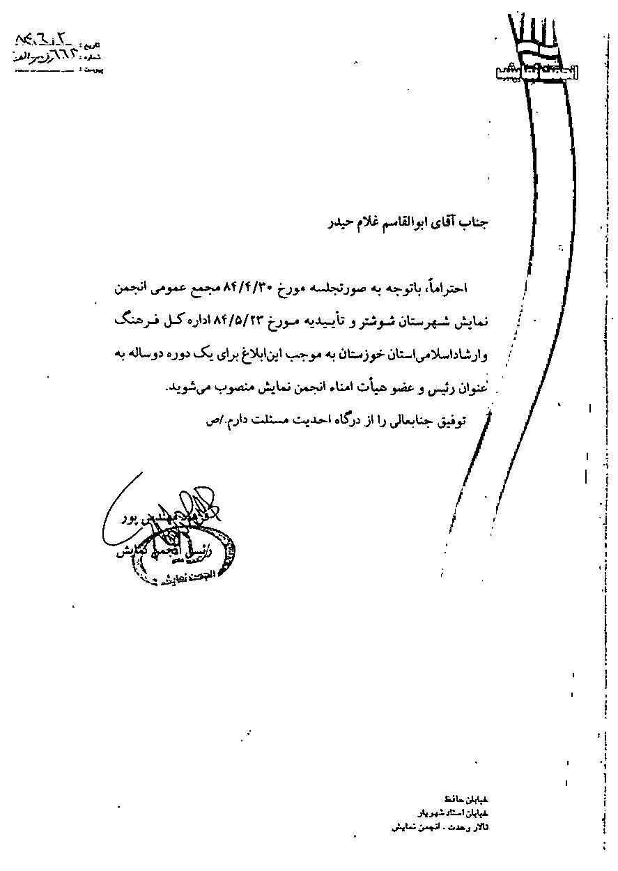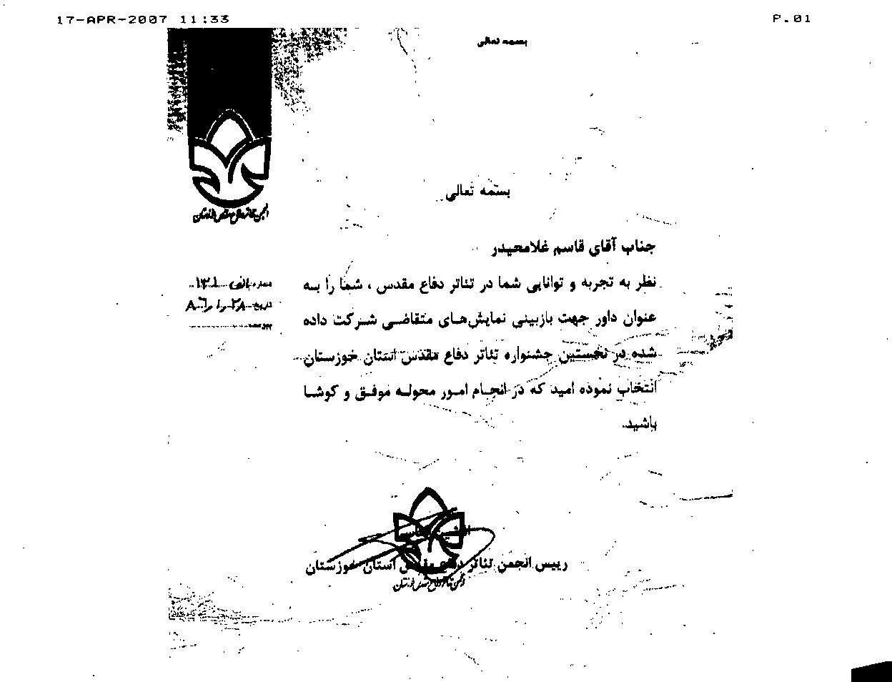 تقدیرنامه ها حکم انتصاب عضو هیئت داوران بخش نقالی و پرده خوانی حکم مسئولیت مدیر اجرایی هجدمین جشنوار تئاتر استان خوزستان بازخوان نوزدهمین جشنواره تئاتر استان خوزستان حکم مسئولیت داور بخش نمایشنامه نویسی سومین جشنواره هنری مقاومت عضو هیات داوران بخش نمایشنامه خوانی نخستین جشنواره بزرگ مقاومت آبادان حکم مسئولیت داور بخش نمایشنامه نویسی سومین جشنواره هنری مقاومت حکم مسئولیت مشاور نخستین جشنواره تئاتر دفاع مقدس خوزستان تقدیرنامه هیجدهمین جشنواره تئاتر استان خوزستان حکم مسئولیت شورای بررسی و انتخاب آثار حرفه ای و عضو کارگروه تئاتر استان خوزستان حکم مسئولیت عضو هیات داوران بخش نمایشنامه خوانی دومین جشنواره هنری مقاومت ویژه شکست حصر آبادان حکم مسئولیت مدیر اجرایی هجدهمین جشنواره تئاتر استان خوزستان حکم مسئولیت عضو هیئت نظارت بر تولیدات و مشاور فنی عضو شورای مشورتی تئاتر خوزستان حکم مسئولیت عضو هیات داوران بخش نمایشنامه خوانی دومین جشنواره هنری مقاومت ویژه شکست حصر آبادان حکم مسئولیت رئیس و عضو هیئت امنا انجمن نمایش حکم مسئول کمیته اجرایی و امور فرهنگی در نحستین جشنواره تئاتر دفاع مقدس خوزستان حکم مسئولیت شورای بررسی و انتخاب آثار حرفه ای و عضو کارگروه تئاتر خوزستان حکم مسئولیت بازخوان نوزدهمین جشنواره تئاتر استان خوزستان مسئول کمیته اجرایی و امور فرهنگی در نخستین جشنواره تئاتر دفاع مقدس خوزستان مشاور نخستین جشنواره تئاتر دفاع مقدس خوزستان حکم مسئولیت عضو هیات نظارت بر تولیدات و مشاور فنی واحد نمایش تقدیرنامه به مناسبت روز جوان حکم مسئولیت مشاور اجرایی در حوزه جوانان حکم مسئولیت عضویت در شورای نظارت بر نمایش شهرستان شوشتر عضو هیات داوران بخش نمایشنامه خوانی نخستین جشنواره بزرگ مقاومت آبادان حکم مسئولیت مشاور بررسی مسائل جوانان حکم عضویت شورای نظارت بر نمایش شهرستان شوشتر حکم مسئولیت عنوان رئیس و عضو هیئت امنا انجمن نمایش تقدیرنامه هجدهمین جشنواره تئاتر استان خوزستان تقدیرنامه در نشر و اعتلای هنر استان خوزستان حکم مسئولیت دبیر جمعیت پیشرفت و عدالت ایران اسلامی در شهرستان شوشتر لوح یادمان بیست و هفتمین جشنواره تئاتر مناطق کشور تقدیرنامه به مناسبت روز جوان تقدیرنامه اجرای نمایش غم در غیاب خداوند حکم مسئولیت راه اندازی خانه تشکلهای جوان در شهرستان ماهشهر بازخوان نوزدهمین جشنواره تئاتر استان خوزستان حکم مسئولیت داور بخش نمایشنامه نویسی سومین جشنوازه هنری مقاومت لوح یادبود نمایش آژیر چهار گوش لوح یادمان جشنواره فرهنگ جوانان خلیج فارس حکم مسئولیت دبیرخانه نشر آثار و پژوهش های انجمن هنرهای نمایشی استان خوزستان حکم مسئولیت مدیر اجرایی هجدهمین جشنواره تئاتر استان خوزستان تقدیرنامه نفر اول جشنواره اتفاق لوح تقدیر دهمین جشنواره استانی نمایش های کوتاه خوزستان حکم مسئولیت داوری اولین سوگواره عرشیان تقدیرنامه جوان منتخب در نخستین جشنواره استانی حضرت علی اکبر تقدیرنامه به مناسبت نوروز تقدیرنامه نفر اول جشنواره اتفاق حکم مسئولیت داور مرحله حضوری مسابقات هنرهای نمایشی در رشته تئاتر صحنه ای دانش آموزان استان خوزستان نبریک هفته میراث فرهنگی لوح یادبود چهارمین جشنواره تئاتر بسیج خوزستان حکم مسئولیت مشاور در نخستین جشنواره تئاتر دفاع مقدس خوزستان حکم مسئولیت عضو هیئت داوران بخش نمایشنامه خوانی نخستین جشنواره بزرگ مقاومت آبادان حکم مسئولیت شورای بررسی و انتخاب آثار حکم مسئولیت عضو هیات داوران بخش نمایشنامه خوانی دومین جشنواره هنری مقاومت ویژه شکست حصر آبادان حکم مسئولیت نماینده هفته نامه عصر کارون در شهرستان شوشتر تقدیرنامه نمایش زیبا و با شکوه آرش بزرگ اسطوره وطن لوح تقدیر سومین جشنواره استانی نمایش های کوتاه لوح تقدیر دومین کتاب دیجیتال نمایشنامه های خوزستان گواهینامه کارگاه تاریخ شفاهی و فن مصاحبه تقدیرنامه نمایش خورشید کاوران حکم مسئولیت دبی