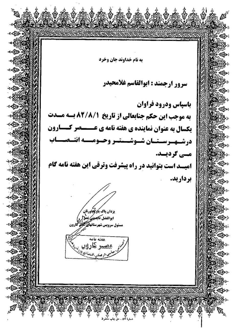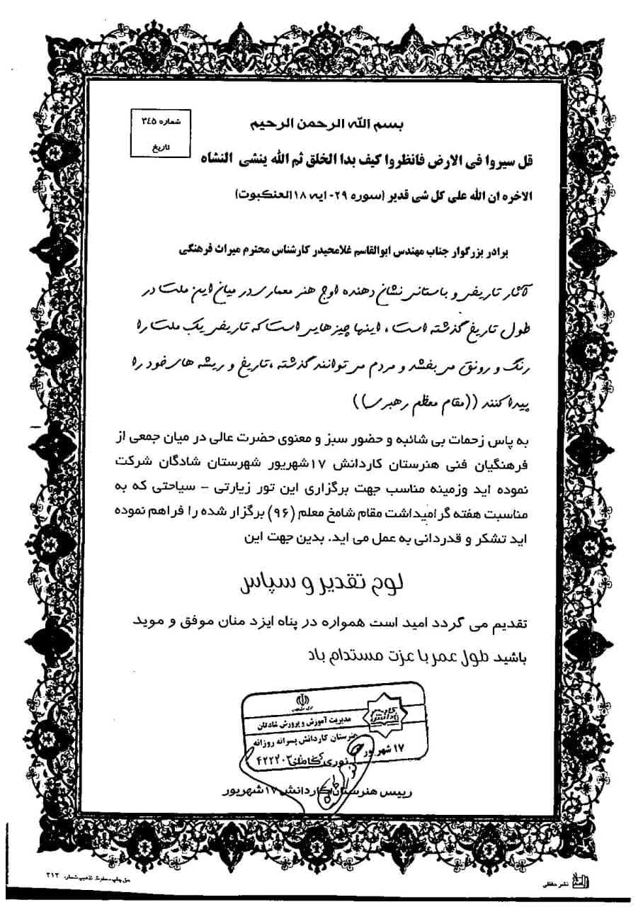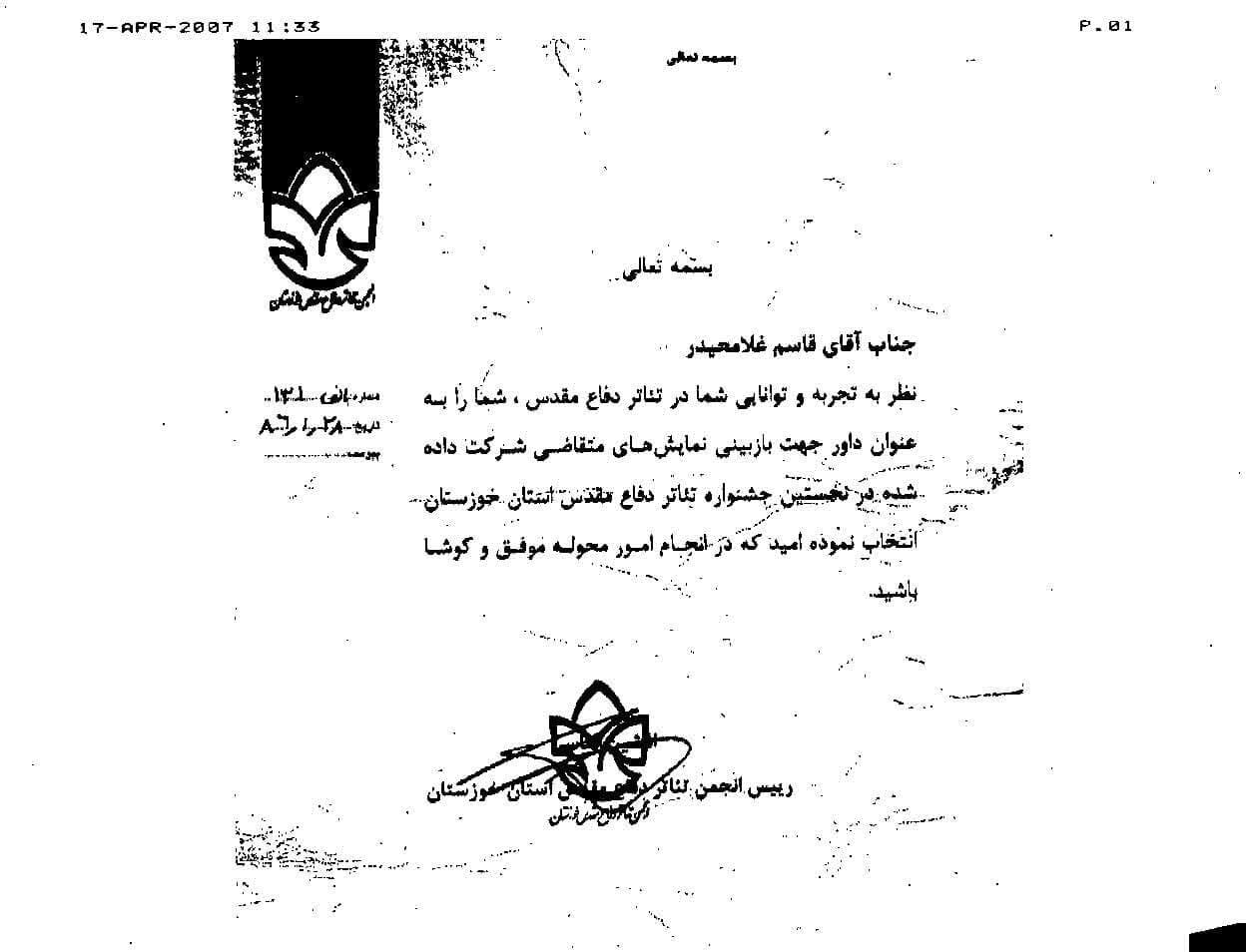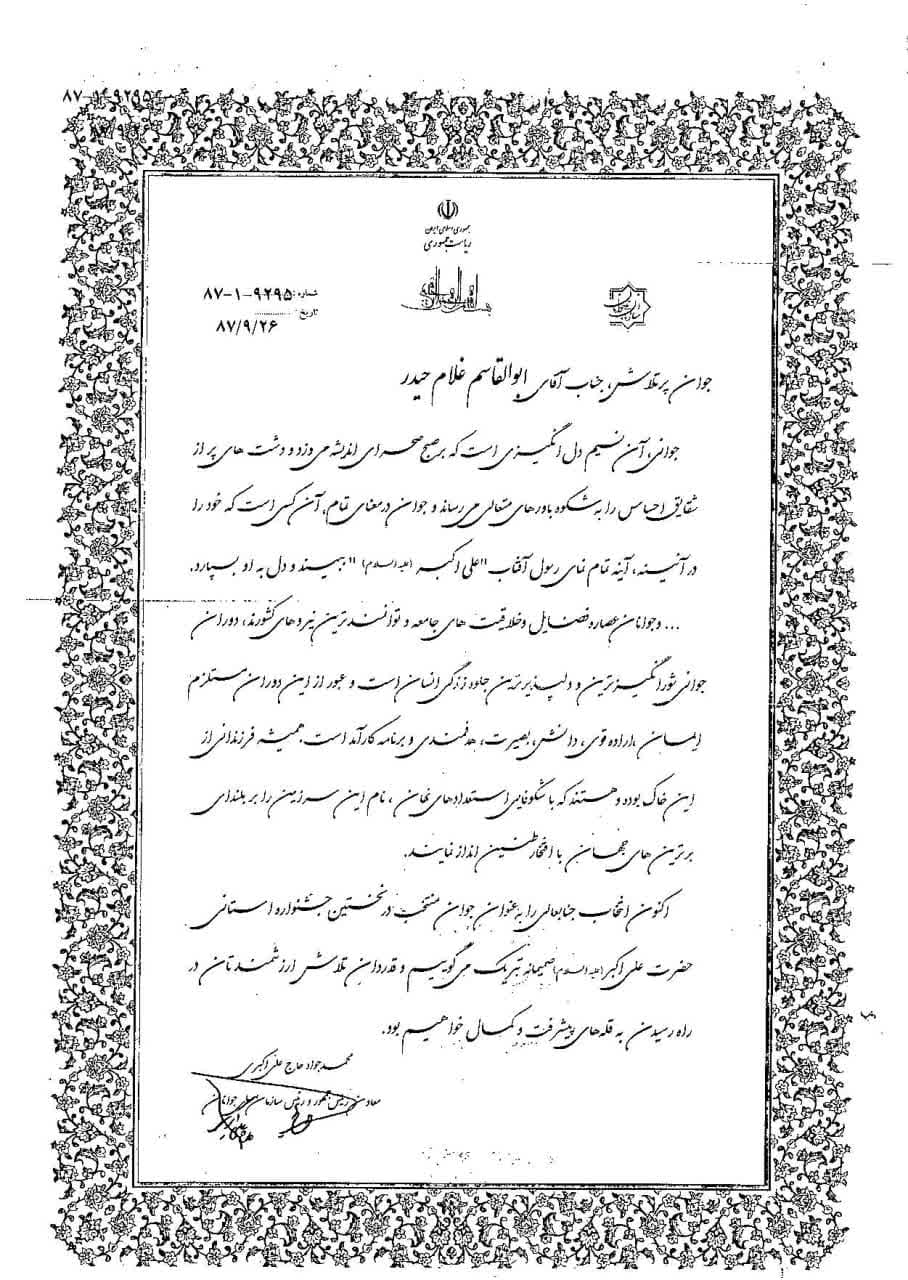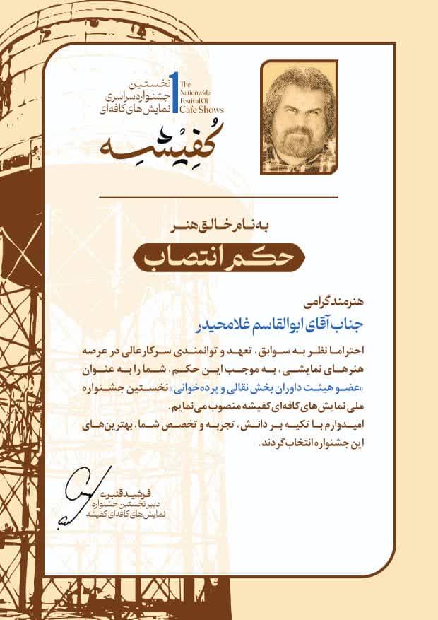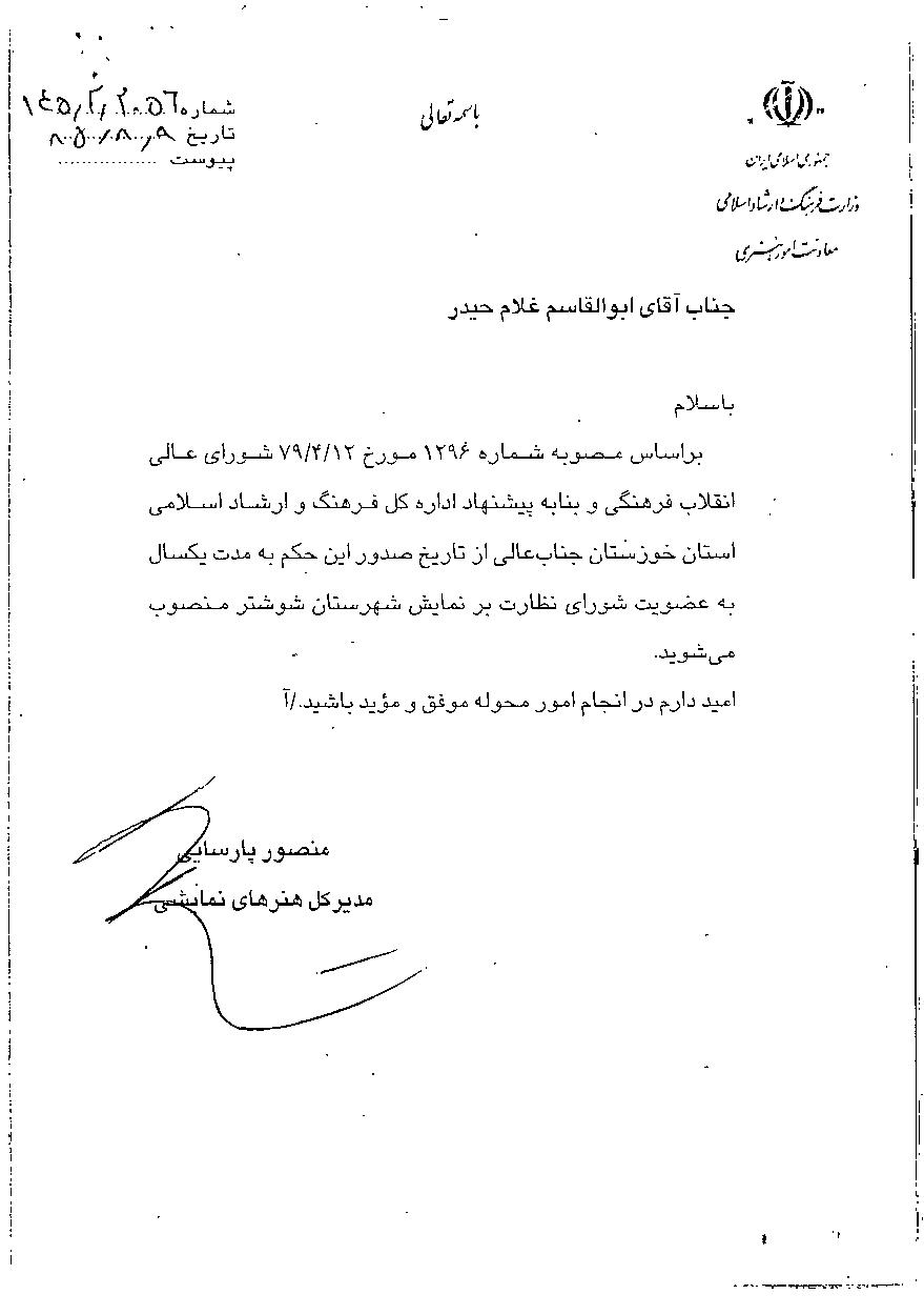 تقدیرنامه ها حکم انتصاب عضو هیئت داوران بخش نقالی و پرده خوانی حکم مسئولیت مدیر اجرایی هجدمین جشنوار تئاتر استان خوزستان بازخوان نوزدهمین جشنواره تئاتر استان خوزستان حکم مسئولیت داور بخش نمایشنامه نویسی سومین جشنواره هنری مقاومت عضو هیات داوران بخش نمایشنامه خوانی نخستین جشنواره بزرگ مقاومت آبادان حکم مسئولیت داور بخش نمایشنامه نویسی سومین جشنواره هنری مقاومت حکم مسئولیت مشاور نخستین جشنواره تئاتر دفاع مقدس خوزستان تقدیرنامه هیجدهمین جشنواره تئاتر استان خوزستان حکم مسئولیت شورای بررسی و انتخاب آثار حرفه ای و عضو کارگروه تئاتر استان خوزستان حکم مسئولیت عضو هیات داوران بخش نمایشنامه خوانی دومین جشنواره هنری مقاومت ویژه شکست حصر آبادان حکم مسئولیت مدیر اجرایی هجدهمین جشنواره تئاتر استان خوزستان حکم مسئولیت عضو هیئت نظارت بر تولیدات و مشاور فنی عضو شورای مشورتی تئاتر خوزستان حکم مسئولیت عضو هیات داوران بخش نمایشنامه خوانی دومین جشنواره هنری مقاومت ویژه شکست حصر آبادان حکم مسئولیت رئیس و عضو هیئت امنا انجمن نمایش حکم مسئول کمیته اجرایی و امور فرهنگی در نحستین جشنواره تئاتر دفاع مقدس خوزستان حکم مسئولیت شورای بررسی و انتخاب آثار حرفه ای و عضو کارگروه تئاتر خوزستان حکم مسئولیت بازخوان نوزدهمین جشنواره تئاتر استان خوزستان مسئول کمیته اجرایی و امور فرهنگی در نخستین جشنواره تئاتر دفاع مقدس خوزستان مشاور نخستین جشنواره تئاتر دفاع مقدس خوزستان حکم مسئولیت عضو هیات نظارت بر تولیدات و مشاور فنی واحد نمایش تقدیرنامه به مناسبت روز جوان حکم مسئولیت مشاور اجرایی در حوزه جوانان حکم مسئولیت عضویت در شورای نظارت بر نمایش شهرستان شوشتر عضو هیات داوران بخش نمایشنامه خوانی نخستین جشنواره بزرگ مقاومت آبادان حکم مسئولیت مشاور بررسی مسائل جوانان حکم عضویت شورای نظارت بر نمایش شهرستان شوشتر حکم مسئولیت عنوان رئیس و عضو هیئت امنا انجمن نمایش تقدیرنامه هجدهمین جشنواره تئاتر استان خوزستان تقدیرنامه در نشر و اعتلای هنر استان خوزستان حکم مسئولیت دبیر جمعیت پیشرفت و عدالت ایران اسلامی در شهرستان شوشتر لوح یادمان بیست و هفتمین جشنواره تئاتر مناطق کشور تقدیرنامه به مناسبت روز جوان تقدیرنامه اجرای نمایش غم در غیاب خداوند حکم مسئولیت راه اندازی خانه تشکلهای جوان در شهرستان ماهشهر بازخوان نوزدهمین جشنواره تئاتر استان خوزستان حکم مسئولیت داور بخش نمایشنامه نویسی سومین جشنوازه هنری مقاومت لوح یادبود نمایش آژیر چهار گوش لوح یادمان جشنواره فرهنگ جوانان خلیج فارس حکم مسئولیت دبیرخانه نشر آثار و پژوهش های انجمن هنرهای نمایشی استان خوزستان حکم مسئولیت مدیر اجرایی هجدهمین جشنواره تئاتر استان خوزستان تقدیرنامه نفر اول جشنواره اتفاق لوح تقدیر دهمین جشنواره استانی نمایش های کوتاه خوزستان حکم مسئولیت داوری اولین سوگواره عرشیان تقدیرنامه جوان منتخب در نخستین جشنواره استانی حضرت علی اکبر تقدیرنامه به مناسبت نوروز تقدیرنامه نفر اول جشنواره اتفاق حکم مسئولیت داور مرحله حضوری مسابقات هنرهای نمایشی در رشته تئاتر صحنه ای دانش آموزان استان خوزستان نبریک هفته میراث فرهنگی لوح یادبود چهارمین جشنواره تئاتر بسیج خوزستان حکم مسئولیت مشاور در نخستین جشنواره تئاتر دفاع مقدس خوزستان حکم مسئولیت عضو هیئت داوران بخش نمایشنامه خوانی نخستین جشنواره بزرگ مقاومت آبادان حکم مسئولیت شورای بررسی و انتخاب آثار حکم مسئولیت عضو هیات داوران بخش نمایشنامه خوانی دومین جشنواره هنری مقاومت ویژه شکست حصر آبادان حکم مسئولیت نماینده هفته نامه عصر کارون در شهرستان شوشتر تقدیرنامه نمایش زیبا و با شکوه آرش بزرگ اسطوره وطن لوح تقدیر سومین جشنواره استانی نمایش های کوتاه لوح تقدیر دومین کتاب دیجیتال نمایشنامه های خوزستان گواهینامه کارگاه تاریخ شفاهی و فن مصاحبه تقدیرنامه نمایش خورشید کاوران حکم مسئولیت دبی