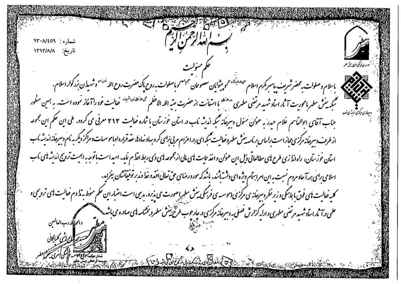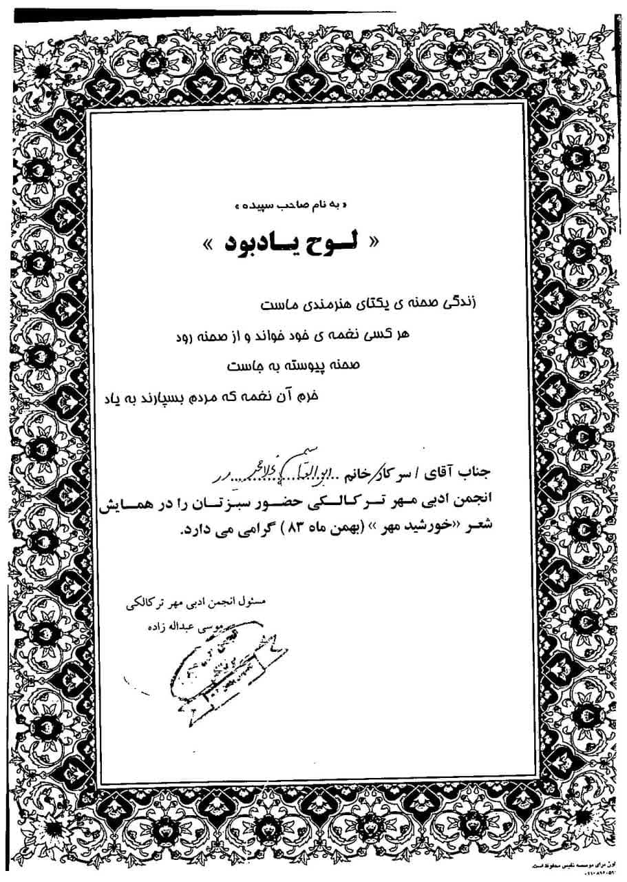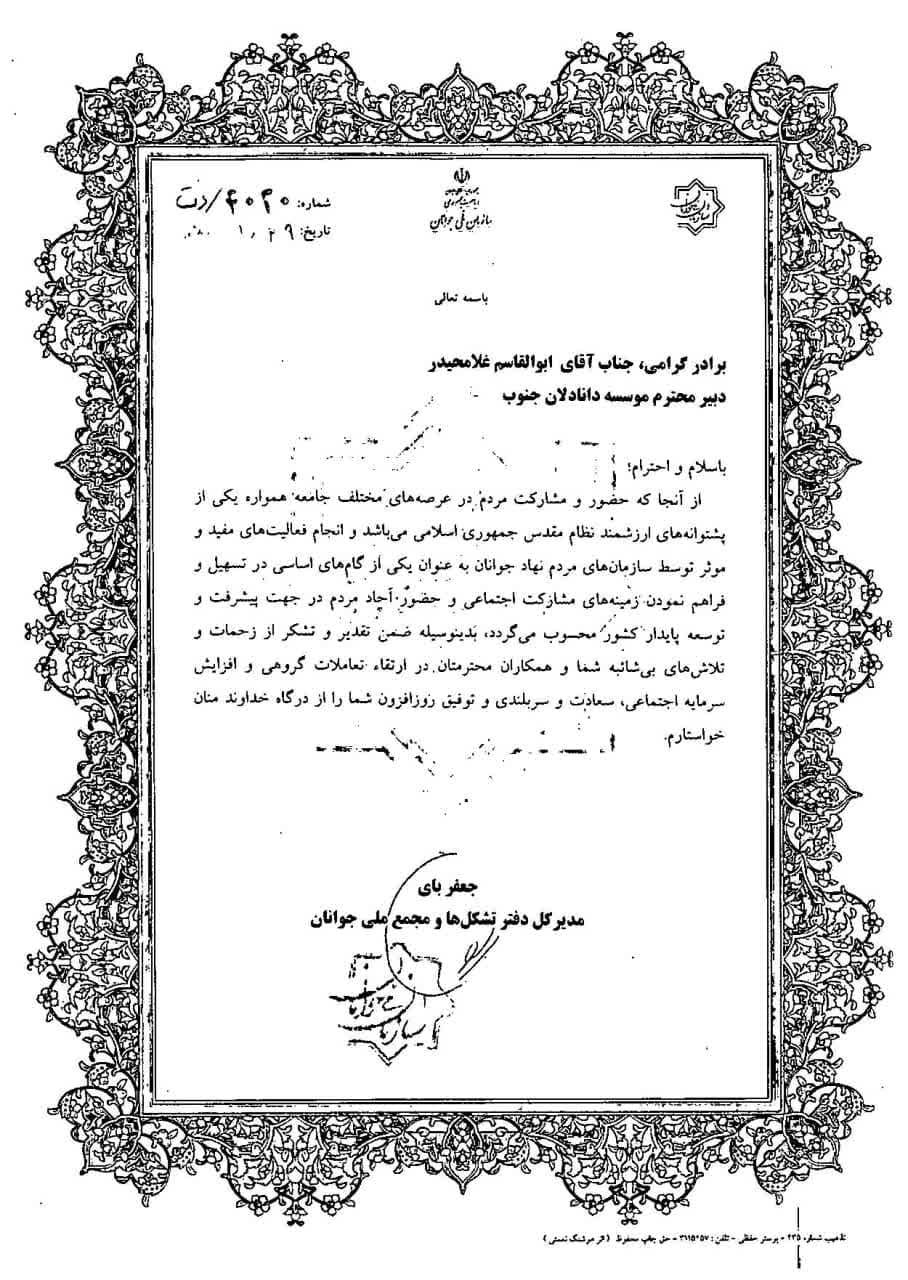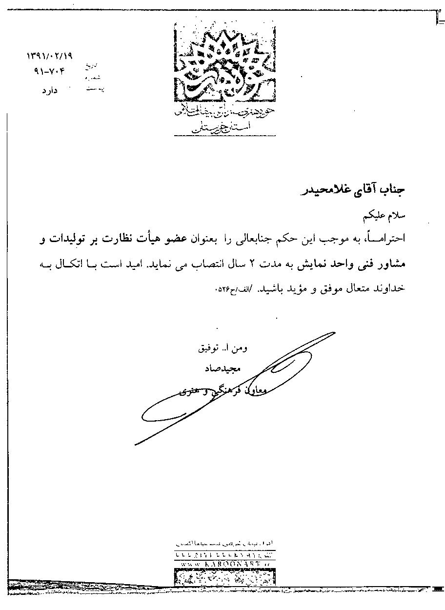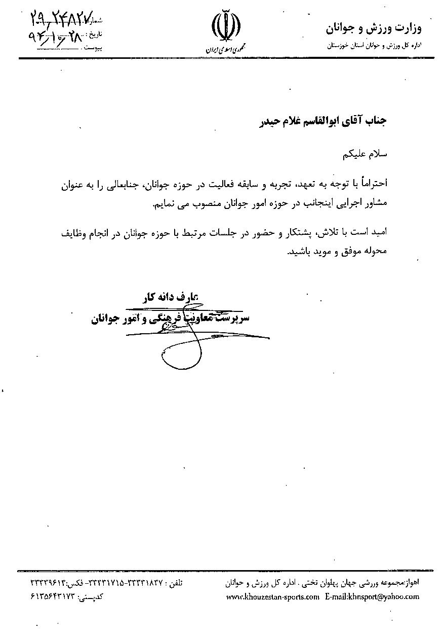 تقدیرنامه ها حکم انتصاب عضو هیئت داوران بخش نقالی و پرده خوانی حکم مسئولیت مدیر اجرایی هجدمین جشنوار تئاتر استان خوزستان بازخوان نوزدهمین جشنواره تئاتر استان خوزستان حکم مسئولیت داور بخش نمایشنامه نویسی سومین جشنواره هنری مقاومت عضو هیات داوران بخش نمایشنامه خوانی نخستین جشنواره بزرگ مقاومت آبادان حکم مسئولیت داور بخش نمایشنامه نویسی سومین جشنواره هنری مقاومت حکم مسئولیت مشاور نخستین جشنواره تئاتر دفاع مقدس خوزستان تقدیرنامه هیجدهمین جشنواره تئاتر استان خوزستان حکم مسئولیت شورای بررسی و انتخاب آثار حرفه ای و عضو کارگروه تئاتر استان خوزستان حکم مسئولیت عضو هیات داوران بخش نمایشنامه خوانی دومین جشنواره هنری مقاومت ویژه شکست حصر آبادان حکم مسئولیت مدیر اجرایی هجدهمین جشنواره تئاتر استان خوزستان حکم مسئولیت عضو هیئت نظارت بر تولیدات و مشاور فنی عضو شورای مشورتی تئاتر خوزستان حکم مسئولیت عضو هیات داوران بخش نمایشنامه خوانی دومین جشنواره هنری مقاومت ویژه شکست حصر آبادان حکم مسئولیت رئیس و عضو هیئت امنا انجمن نمایش حکم مسئول کمیته اجرایی و امور فرهنگی در نحستین جشنواره تئاتر دفاع مقدس خوزستان حکم مسئولیت شورای بررسی و انتخاب آثار حرفه ای و عضو کارگروه تئاتر خوزستان حکم مسئولیت بازخوان نوزدهمین جشنواره تئاتر استان خوزستان مسئول کمیته اجرایی و امور فرهنگی در نخستین جشنواره تئاتر دفاع مقدس خوزستان مشاور نخستین جشنواره تئاتر دفاع مقدس خوزستان حکم مسئولیت عضو هیات نظارت بر تولیدات و مشاور فنی واحد نمایش تقدیرنامه به مناسبت روز جوان حکم مسئولیت مشاور اجرایی در حوزه جوانان حکم مسئولیت عضویت در شورای نظارت بر نمایش شهرستان شوشتر عضو هیات داوران بخش نمایشنامه خوانی نخستین جشنواره بزرگ مقاومت آبادان حکم مسئولیت مشاور بررسی مسائل جوانان حکم عضویت شورای نظارت بر نمایش شهرستان شوشتر حکم مسئولیت عنوان رئیس و عضو هیئت امنا انجمن نمایش تقدیرنامه هجدهمین جشنواره تئاتر استان خوزستان تقدیرنامه در نشر و اعتلای هنر استان خوزستان حکم مسئولیت دبیر جمعیت پیشرفت و عدالت ایران اسلامی در شهرستان شوشتر لوح یادمان بیست و هفتمین جشنواره تئاتر مناطق کشور تقدیرنامه به مناسبت روز جوان تقدیرنامه اجرای نمایش غم در غیاب خداوند حکم مسئولیت راه اندازی خانه تشکلهای جوان در شهرستان ماهشهر بازخوان نوزدهمین جشنواره تئاتر استان خوزستان حکم مسئولیت داور بخش نمایشنامه نویسی سومین جشنوازه هنری مقاومت لوح یادبود نمایش آژیر چهار گوش لوح یادمان جشنواره فرهنگ جوانان خلیج فارس حکم مسئولیت دبیرخانه نشر آثار و پژوهش های انجمن هنرهای نمایشی استان خوزستان حکم مسئولیت مدیر اجرایی هجدهمین جشنواره تئاتر استان خوزستان تقدیرنامه نفر اول جشنواره اتفاق لوح تقدیر دهمین جشنواره استانی نمایش های کوتاه خوزستان حکم مسئولیت داوری اولین سوگواره عرشیان تقدیرنامه جوان منتخب در نخستین جشنواره استانی حضرت علی اکبر تقدیرنامه به مناسبت نوروز تقدیرنامه نفر اول جشنواره اتفاق حکم مسئولیت داور مرحله حضوری مسابقات هنرهای نمایشی در رشته تئاتر صحنه ای دانش آموزان استان خوزستان نبریک هفته میراث فرهنگی لوح یادبود چهارمین جشنواره تئاتر بسیج خوزستان حکم مسئولیت مشاور در نخستین جشنواره تئاتر دفاع مقدس خوزستان حکم مسئولیت عضو هیئت داوران بخش نمایشنامه خوانی نخستین جشنواره بزرگ مقاومت آبادان حکم مسئولیت شورای بررسی و انتخاب آثار حکم مسئولیت عضو هیات داوران بخش نمایشنامه خوانی دومین جشنواره هنری مقاومت ویژه شکست حصر آبادان حکم مسئولیت نماینده هفته نامه عصر کارون در شهرستان شوشتر تقدیرنامه نمایش زیبا و با شکوه آرش بزرگ اسطوره وطن لوح تقدیر سومین جشنواره استانی نمایش های کوتاه لوح تقدیر دومین کتاب دیجیتال نمایشنامه های خوزستان گواهینامه کارگاه تاریخ شفاهی و فن مصاحبه تقدیرنامه نمایش خورشید کاوران حکم مسئولیت دبی
