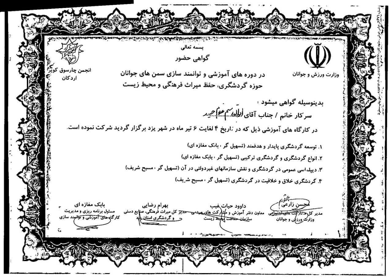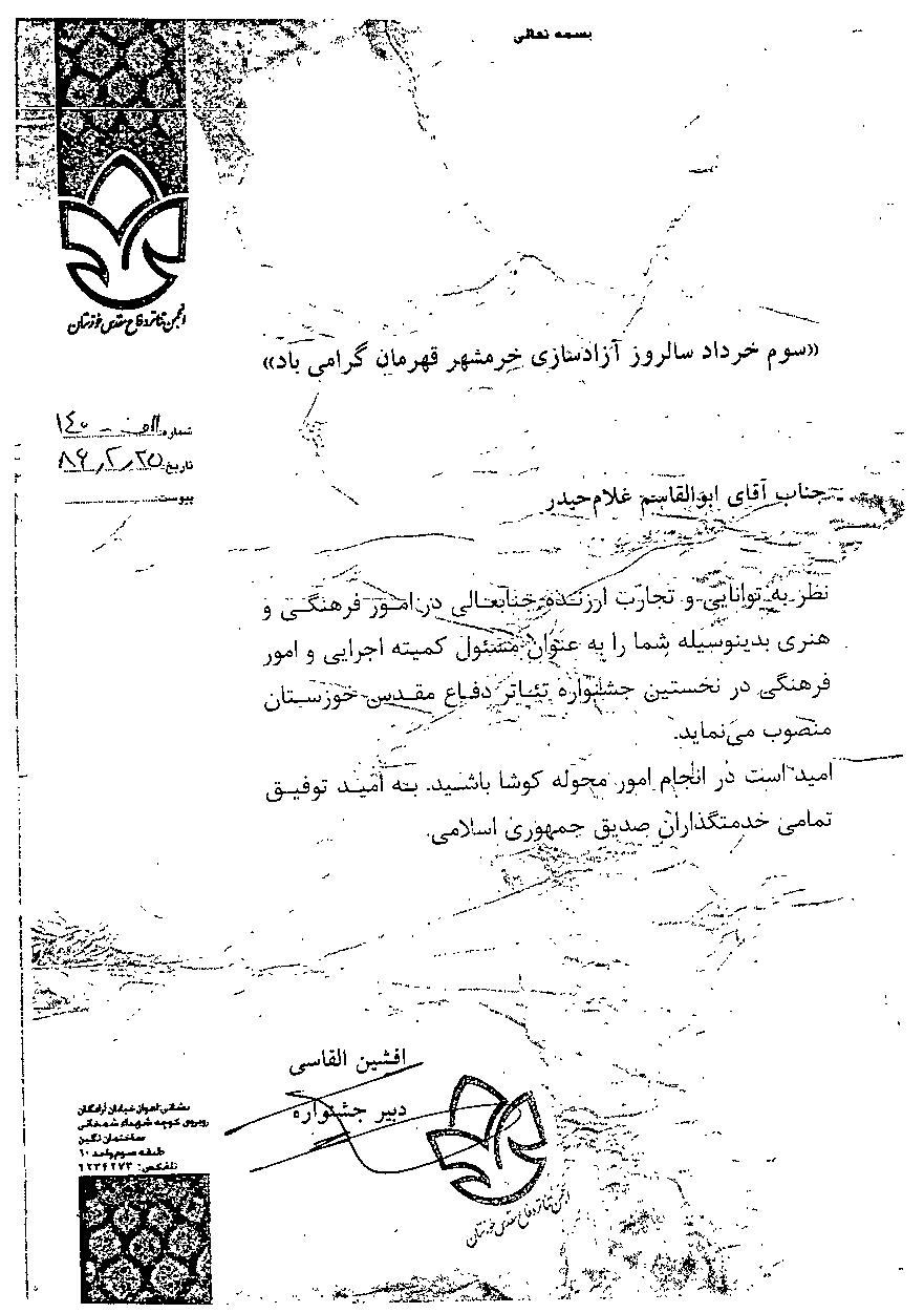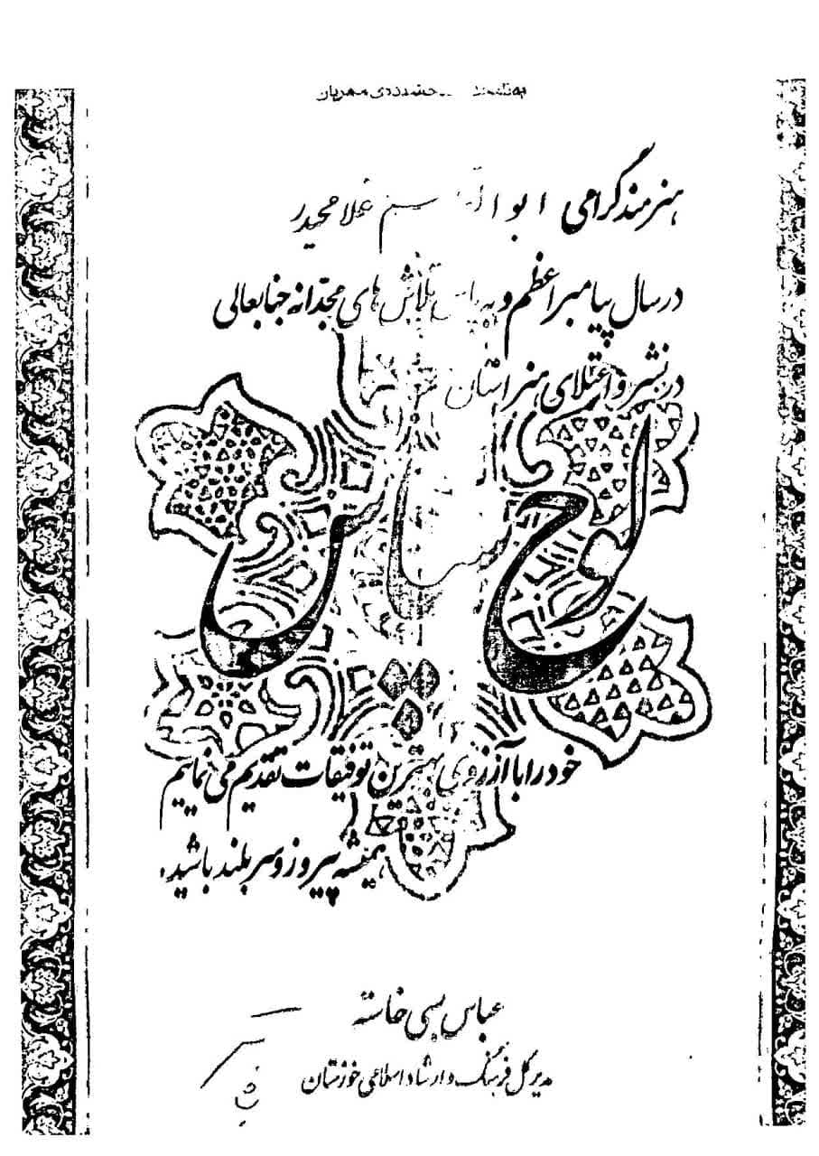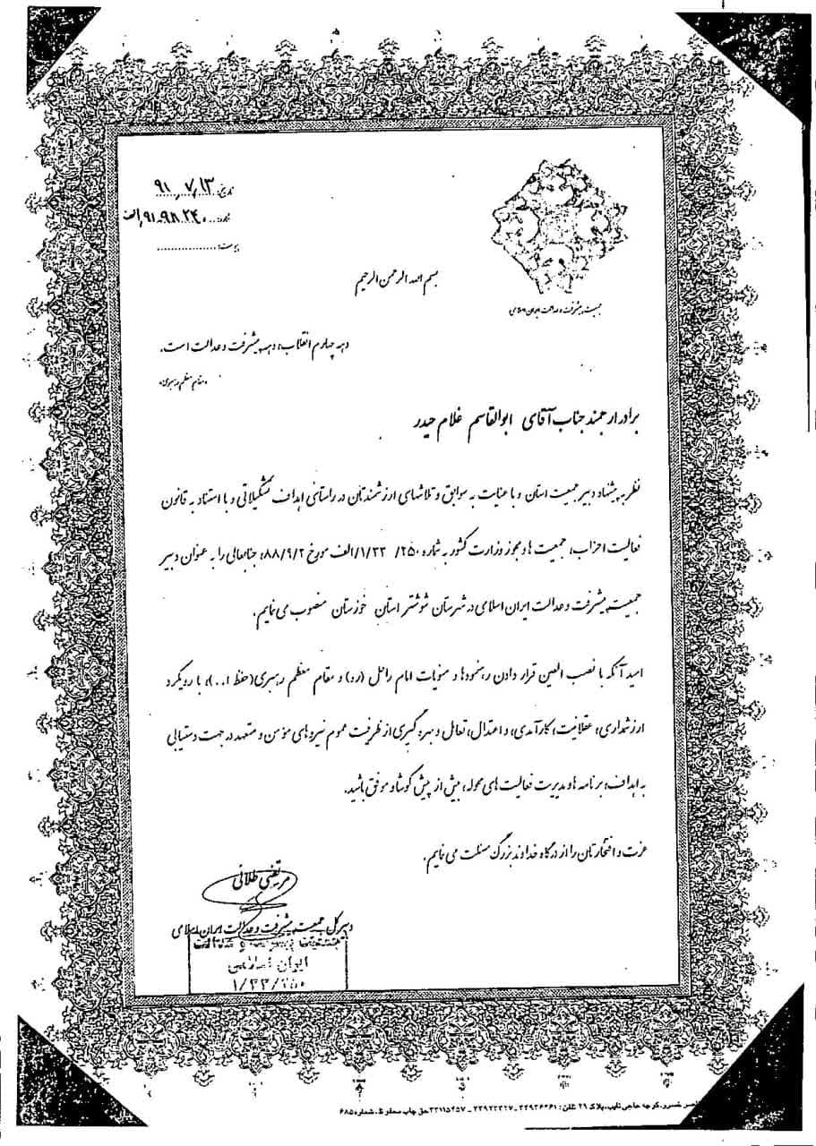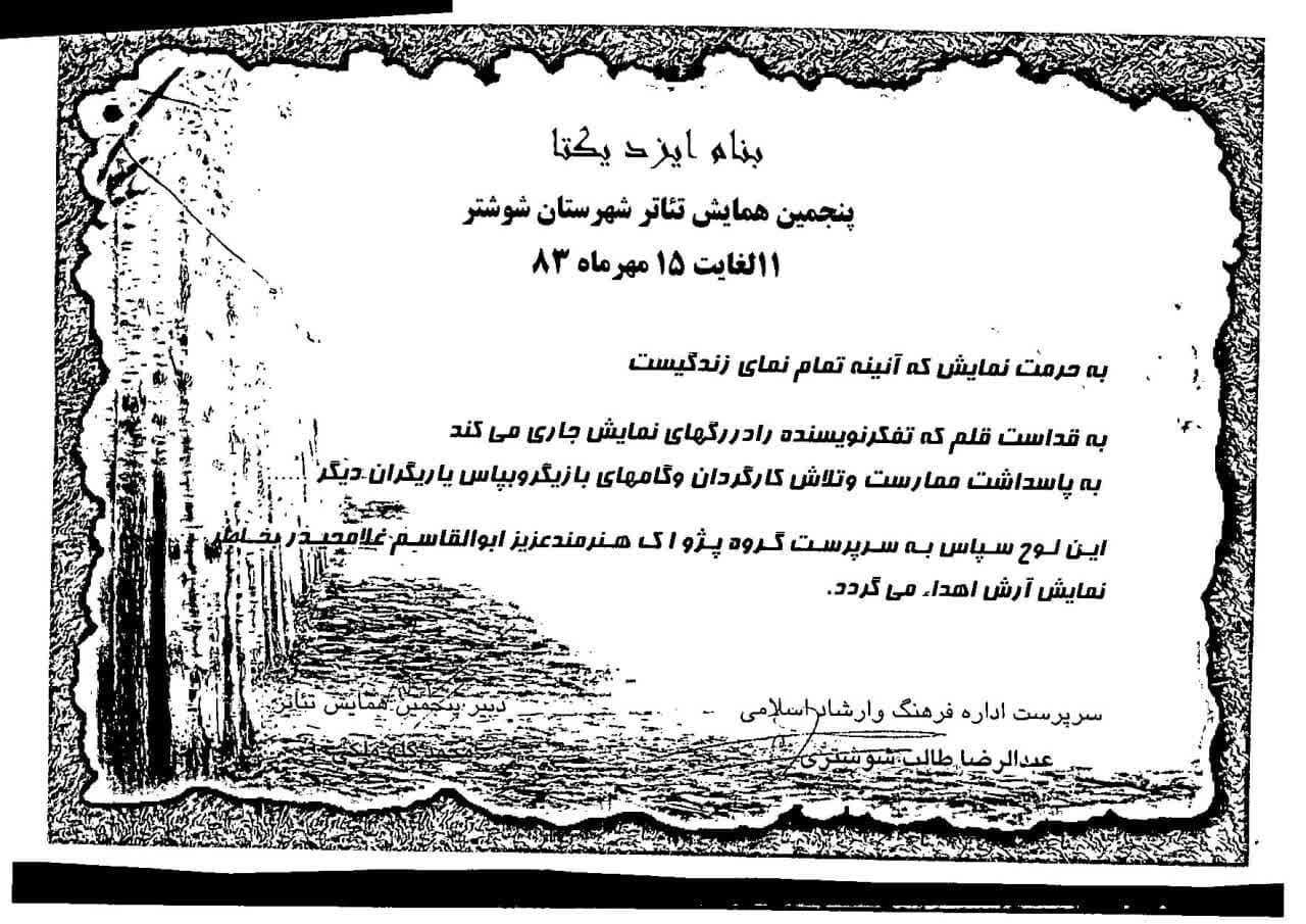 تقدیرنامه ها حکم انتصاب عضو هیئت داوران بخش نقالی و پرده خوانی حکم مسئولیت مدیر اجرایی هجدمین جشنوار تئاتر استان خوزستان بازخوان نوزدهمین جشنواره تئاتر استان خوزستان حکم مسئولیت داور بخش نمایشنامه نویسی سومین جشنواره هنری مقاومت عضو هیات داوران بخش نمایشنامه خوانی نخستین جشنواره بزرگ مقاومت آبادان حکم مسئولیت داور بخش نمایشنامه نویسی سومین جشنواره هنری مقاومت حکم مسئولیت مشاور نخستین جشنواره تئاتر دفاع مقدس خوزستان تقدیرنامه هیجدهمین جشنواره تئاتر استان خوزستان حکم مسئولیت شورای بررسی و انتخاب آثار حرفه ای و عضو کارگروه تئاتر استان خوزستان حکم مسئولیت عضو هیات داوران بخش نمایشنامه خوانی دومین جشنواره هنری مقاومت ویژه شکست حصر آبادان حکم مسئولیت مدیر اجرایی هجدهمین جشنواره تئاتر استان خوزستان حکم مسئولیت عضو هیئت نظارت بر تولیدات و مشاور فنی عضو شورای مشورتی تئاتر خوزستان حکم مسئولیت عضو هیات داوران بخش نمایشنامه خوانی دومین جشنواره هنری مقاومت ویژه شکست حصر آبادان حکم مسئولیت رئیس و عضو هیئت امنا انجمن نمایش حکم مسئول کمیته اجرایی و امور فرهنگی در نحستین جشنواره تئاتر دفاع مقدس خوزستان حکم مسئولیت شورای بررسی و انتخاب آثار حرفه ای و عضو کارگروه تئاتر خوزستان حکم مسئولیت بازخوان نوزدهمین جشنواره تئاتر استان خوزستان مسئول کمیته اجرایی و امور فرهنگی در نخستین جشنواره تئاتر دفاع مقدس خوزستان مشاور نخستین جشنواره تئاتر دفاع مقدس خوزستان حکم مسئولیت عضو هیات نظارت بر تولیدات و مشاور فنی واحد نمایش تقدیرنامه به مناسبت روز جوان حکم مسئولیت مشاور اجرایی در حوزه جوانان حکم مسئولیت عضویت در شورای نظارت بر نمایش شهرستان شوشتر عضو هیات داوران بخش نمایشنامه خوانی نخستین جشنواره بزرگ مقاومت آبادان حکم مسئولیت مشاور بررسی مسائل جوانان حکم عضویت شورای نظارت بر نمایش شهرستان شوشتر حکم مسئولیت عنوان رئیس و عضو هیئت امنا انجمن نمایش تقدیرنامه هجدهمین جشنواره تئاتر استان خوزستان تقدیرنامه در نشر و اعتلای هنر استان خوزستان حکم مسئولیت دبیر جمعیت پیشرفت و عدالت ایران اسلامی در شهرستان شوشتر لوح یادمان بیست و هفتمین جشنواره تئاتر مناطق کشور تقدیرنامه به مناسبت روز جوان تقدیرنامه اجرای نمایش غم در غیاب خداوند حکم مسئولیت راه اندازی خانه تشکلهای جوان در شهرستان ماهشهر بازخوان نوزدهمین جشنواره تئاتر استان خوزستان حکم مسئولیت داور بخش نمایشنامه نویسی سومین جشنوازه هنری مقاومت لوح یادبود نمایش آژیر چهار گوش لوح یادمان جشنواره فرهنگ جوانان خلیج فارس حکم مسئولیت دبیرخانه نشر آثار و پژوهش های انجمن هنرهای نمایشی استان خوزستان حکم مسئولیت مدیر اجرایی هجدهمین جشنواره تئاتر استان خوزستان تقدیرنامه نفر اول جشنواره اتفاق لوح تقدیر دهمین جشنواره استانی نمایش های کوتاه خوزستان حکم مسئولیت داوری اولین سوگواره عرشیان تقدیرنامه جوان منتخب در نخستین جشنواره استانی حضرت علی اکبر تقدیرنامه به مناسبت نوروز تقدیرنامه نفر اول جشنواره اتفاق حکم مسئولیت داور مرحله حضوری مسابقات هنرهای نمایشی در رشته تئاتر صحنه ای دانش آموزان استان خوزستان نبریک هفته میراث فرهنگی لوح یادبود چهارمین جشنواره تئاتر بسیج خوزستان حکم مسئولیت مشاور در نخستین جشنواره تئاتر دفاع مقدس خوزستان حکم مسئولیت عضو هیئت داوران بخش نمایشنامه خوانی نخستین جشنواره بزرگ مقاومت آبادان حکم مسئولیت شورای بررسی و انتخاب آثار حکم مسئولیت عضو هیات داوران بخش نمایشنامه خوانی دومین جشنواره هنری مقاومت ویژه شکست حصر آبادان حکم مسئولیت نماینده هفته نامه عصر کارون در شهرستان شوشتر تقدیرنامه نمایش زیبا و با شکوه آرش بزرگ اسطوره وطن لوح تقدیر سومین جشنواره استانی نمایش های کوتاه لوح تقدیر دومین کتاب دیجیتال نمایشنامه های خوزستان گواهینامه کارگاه تاریخ شفاهی و فن مصاحبه تقدیرنامه نمایش خورشید کاوران حکم مسئولیت دبی