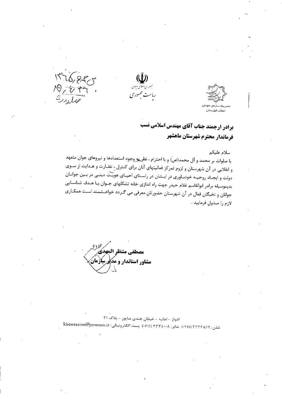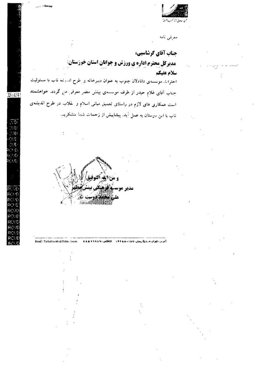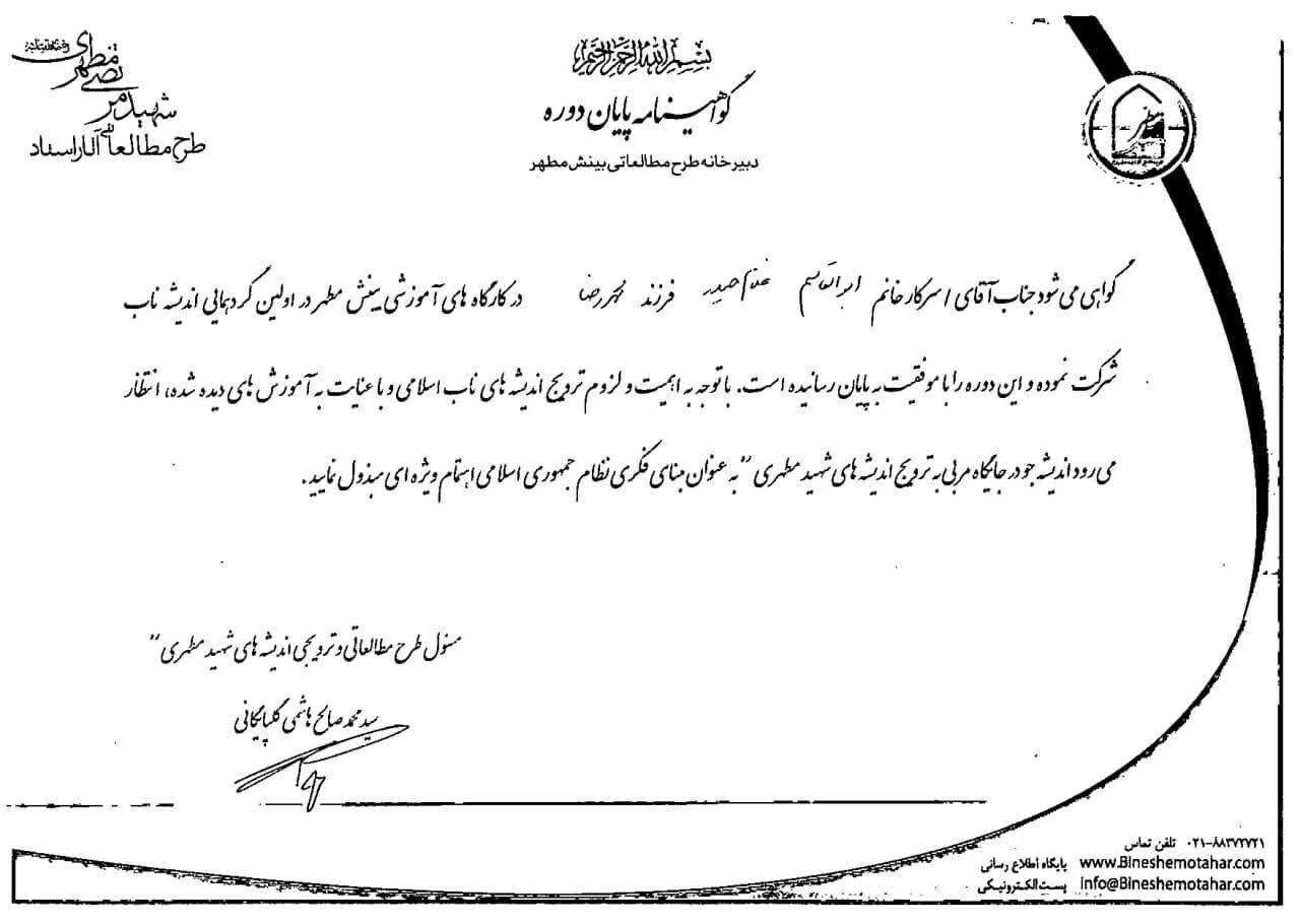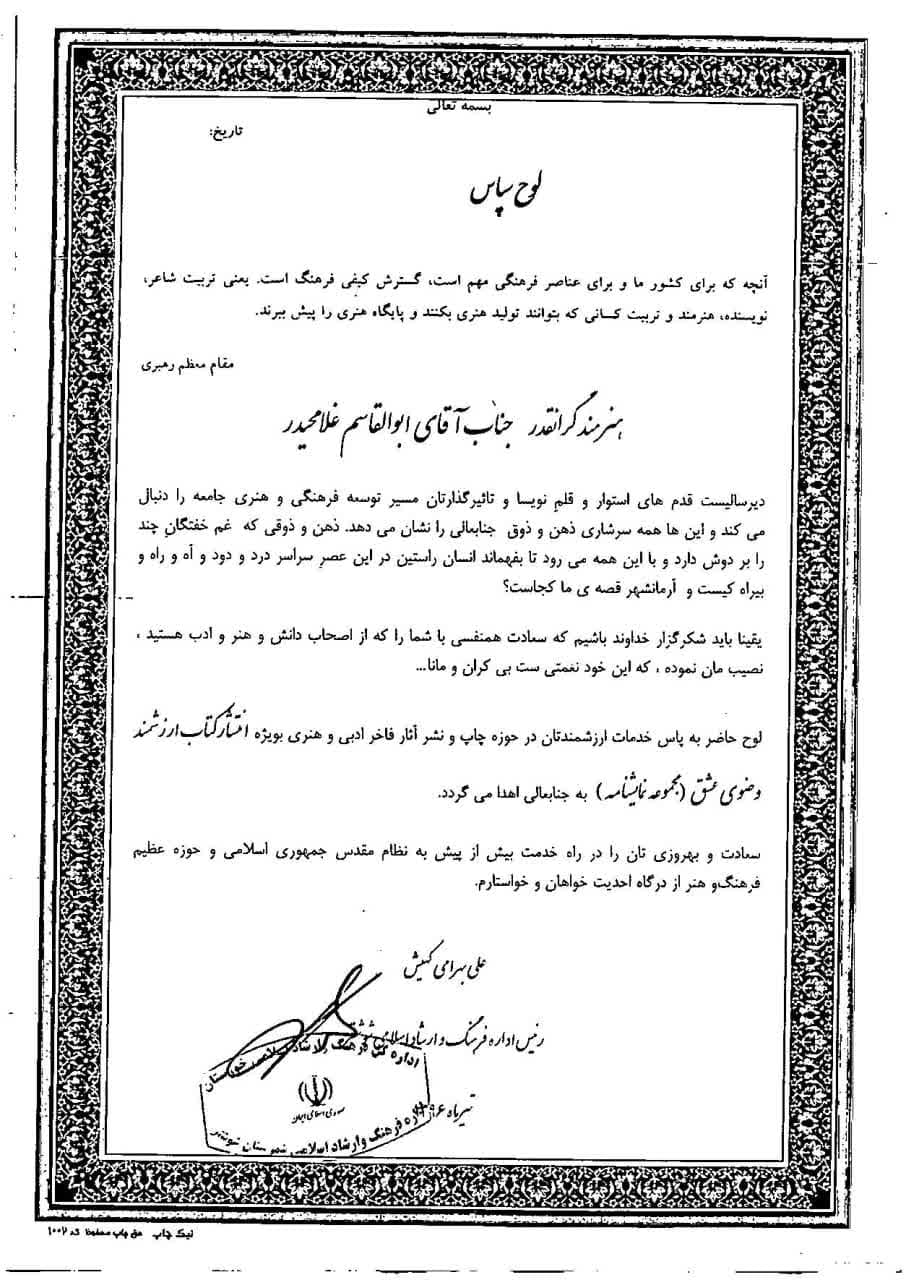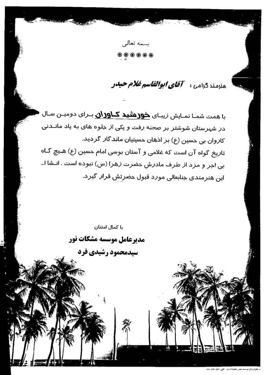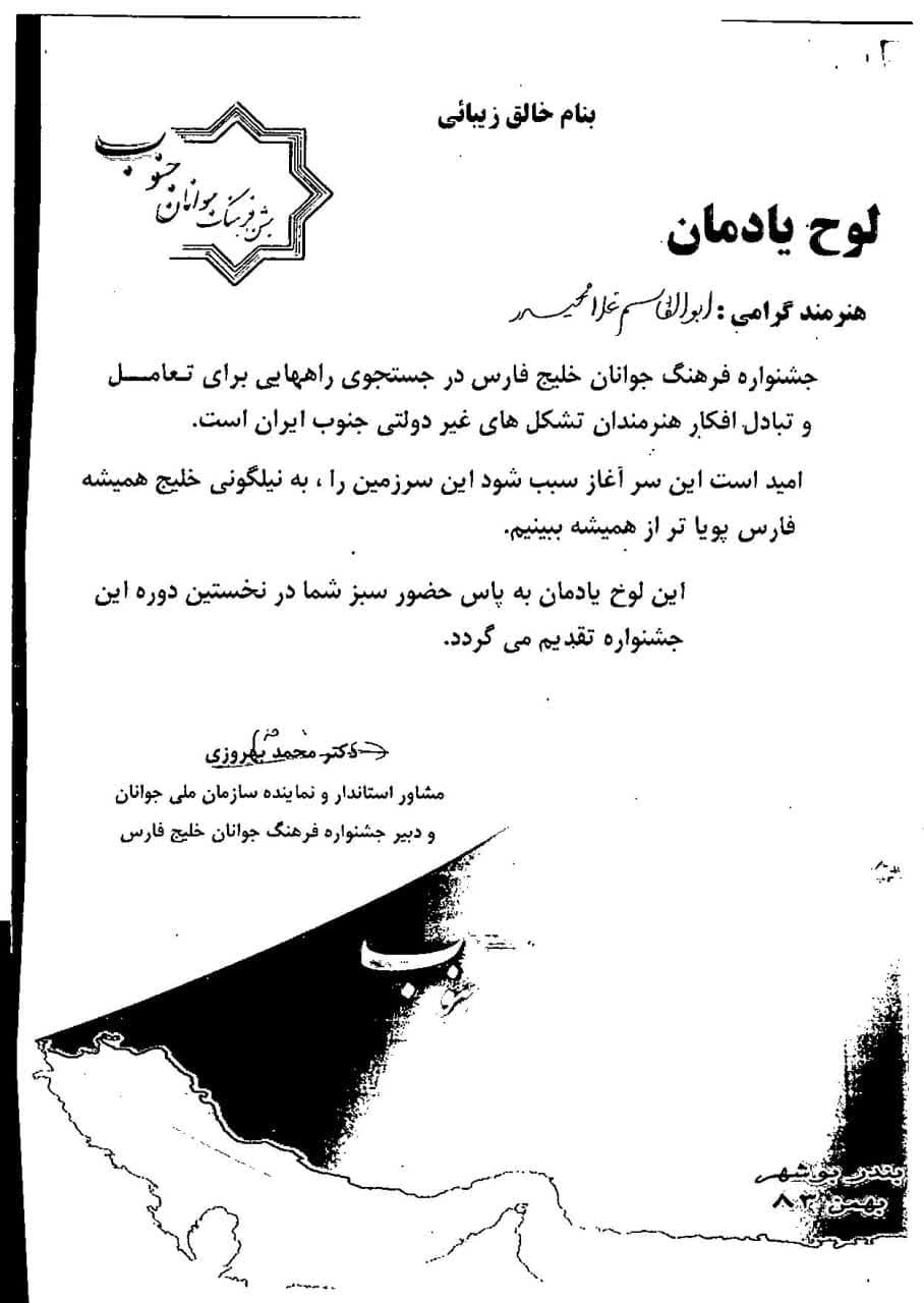 تقدیرنامه ها حکم انتصاب عضو هیئت داوران بخش نقالی و پرده خوانی حکم مسئولیت مدیر اجرایی هجدمین جشنوار تئاتر استان خوزستان بازخوان نوزدهمین جشنواره تئاتر استان خوزستان حکم مسئولیت داور بخش نمایشنامه نویسی سومین جشنواره هنری مقاومت عضو هیات داوران بخش نمایشنامه خوانی نخستین جشنواره بزرگ مقاومت آبادان حکم مسئولیت داور بخش نمایشنامه نویسی سومین جشنواره هنری مقاومت حکم مسئولیت مشاور نخستین جشنواره تئاتر دفاع مقدس خوزستان تقدیرنامه هیجدهمین جشنواره تئاتر استان خوزستان حکم مسئولیت شورای بررسی و انتخاب آثار حرفه ای و عضو کارگروه تئاتر استان خوزستان حکم مسئولیت عضو هیات داوران بخش نمایشنامه خوانی دومین جشنواره هنری مقاومت ویژه شکست حصر آبادان حکم مسئولیت مدیر اجرایی هجدهمین جشنواره تئاتر استان خوزستان حکم مسئولیت عضو هیئت نظارت بر تولیدات و مشاور فنی عضو شورای مشورتی تئاتر خوزستان حکم مسئولیت عضو هیات داوران بخش نمایشنامه خوانی دومین جشنواره هنری مقاومت ویژه شکست حصر آبادان حکم مسئولیت رئیس و عضو هیئت امنا انجمن نمایش حکم مسئول کمیته اجرایی و امور فرهنگی در نحستین جشنواره تئاتر دفاع مقدس خوزستان حکم مسئولیت شورای بررسی و انتخاب آثار حرفه ای و عضو کارگروه تئاتر خوزستان حکم مسئولیت بازخوان نوزدهمین جشنواره تئاتر استان خوزستان مسئول کمیته اجرایی و امور فرهنگی در نخستین جشنواره تئاتر دفاع مقدس خوزستان مشاور نخستین جشنواره تئاتر دفاع مقدس خوزستان حکم مسئولیت عضو هیات نظارت بر تولیدات و مشاور فنی واحد نمایش تقدیرنامه به مناسبت روز جوان حکم مسئولیت مشاور اجرایی در حوزه جوانان حکم مسئولیت عضویت در شورای نظارت بر نمایش شهرستان شوشتر عضو هیات داوران بخش نمایشنامه خوانی نخستین جشنواره بزرگ مقاومت آبادان حکم مسئولیت مشاور بررسی مسائل جوانان حکم عضویت شورای نظارت بر نمایش شهرستان شوشتر حکم مسئولیت عنوان رئیس و عضو هیئت امنا انجمن نمایش تقدیرنامه هجدهمین جشنواره تئاتر استان خوزستان تقدیرنامه در نشر و اعتلای هنر استان خوزستان حکم مسئولیت دبیر جمعیت پیشرفت و عدالت ایران اسلامی در شهرستان شوشتر لوح یادمان بیست و هفتمین جشنواره تئاتر مناطق کشور تقدیرنامه به مناسبت روز جوان تقدیرنامه اجرای نمایش غم در غیاب خداوند حکم مسئولیت راه اندازی خانه تشکلهای جوان در شهرستان ماهشهر بازخوان نوزدهمین جشنواره تئاتر استان خوزستان حکم مسئولیت داور بخش نمایشنامه نویسی سومین جشنوازه هنری مقاومت لوح یادبود نمایش آژیر چهار گوش لوح یادمان جشنواره فرهنگ جوانان خلیج فارس حکم مسئولیت دبیرخانه نشر آثار و پژوهش های انجمن هنرهای نمایشی استان خوزستان حکم مسئولیت مدیر اجرایی هجدهمین جشنواره تئاتر استان خوزستان تقدیرنامه نفر اول جشنواره اتفاق لوح تقدیر دهمین جشنواره استانی نمایش های کوتاه خوزستان حکم مسئولیت داوری اولین سوگواره عرشیان تقدیرنامه جوان منتخب در نخستین جشنواره استانی حضرت علی اکبر تقدیرنامه به مناسبت نوروز تقدیرنامه نفر اول جشنواره اتفاق حکم مسئولیت داور مرحله حضوری مسابقات هنرهای نمایشی در رشته تئاتر صحنه ای دانش آموزان استان خوزستان نبریک هفته میراث فرهنگی لوح یادبود چهارمین جشنواره تئاتر بسیج خوزستان حکم مسئولیت مشاور در نخستین جشنواره تئاتر دفاع مقدس خوزستان حکم مسئولیت عضو هیئت داوران بخش نمایشنامه خوانی نخستین جشنواره بزرگ مقاومت آبادان حکم مسئولیت شورای بررسی و انتخاب آثار حکم مسئولیت عضو هیات داوران بخش نمایشنامه خوانی دومین جشنواره هنری مقاومت ویژه شکست حصر آبادان حکم مسئولیت نماینده هفته نامه عصر کارون در شهرستان شوشتر تقدیرنامه نمایش زیبا و با شکوه آرش بزرگ اسطوره وطن لوح تقدیر سومین جشنواره استانی نمایش های کوتاه لوح تقدیر دومین کتاب دیجیتال نمایشنامه های خوزستان گواهینامه کارگاه تاریخ شفاهی و فن مصاحبه تقدیرنامه نمایش خورشید کاوران حکم مسئولیت دبی