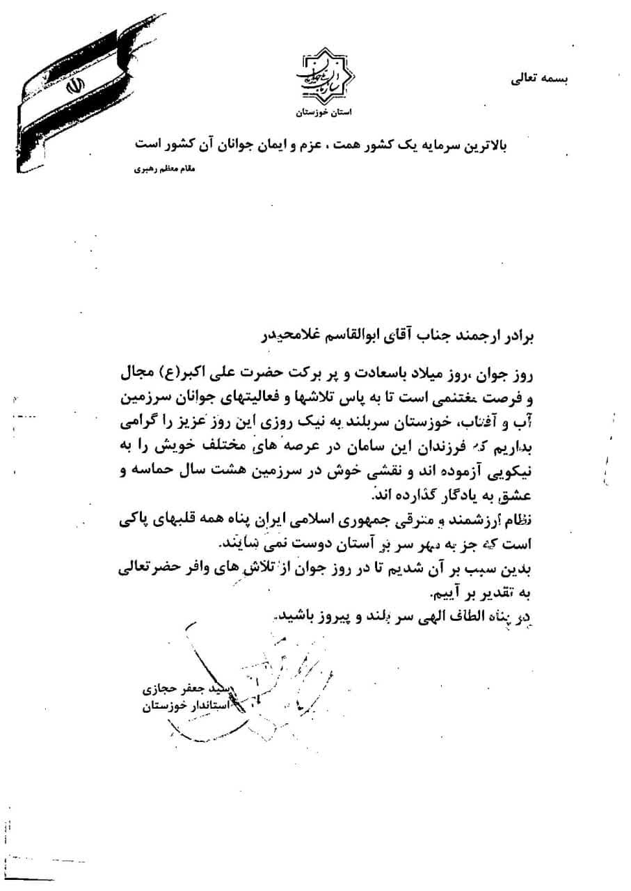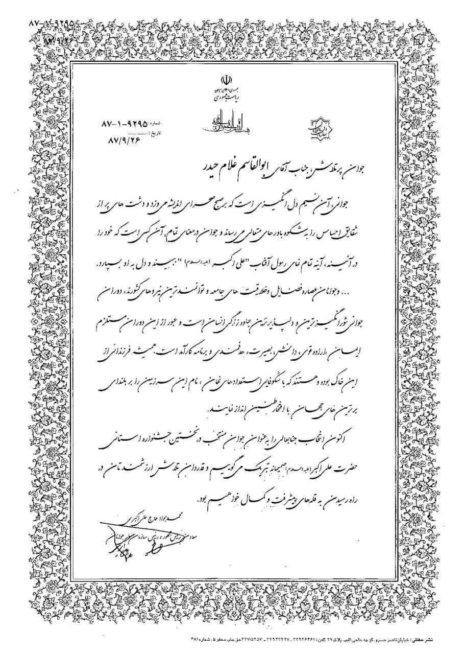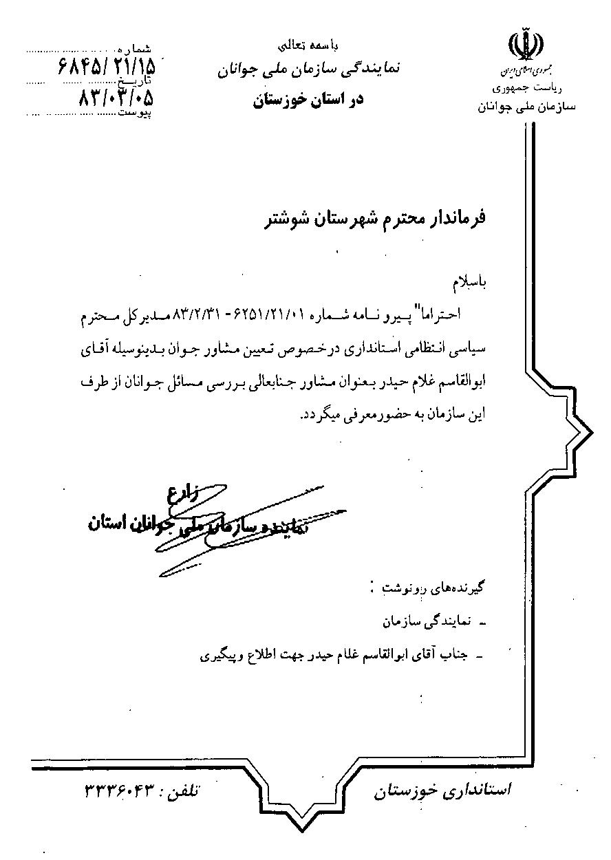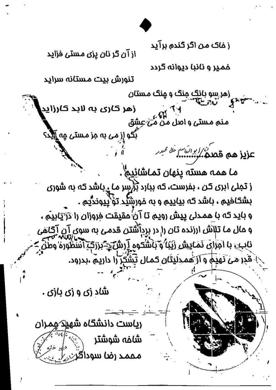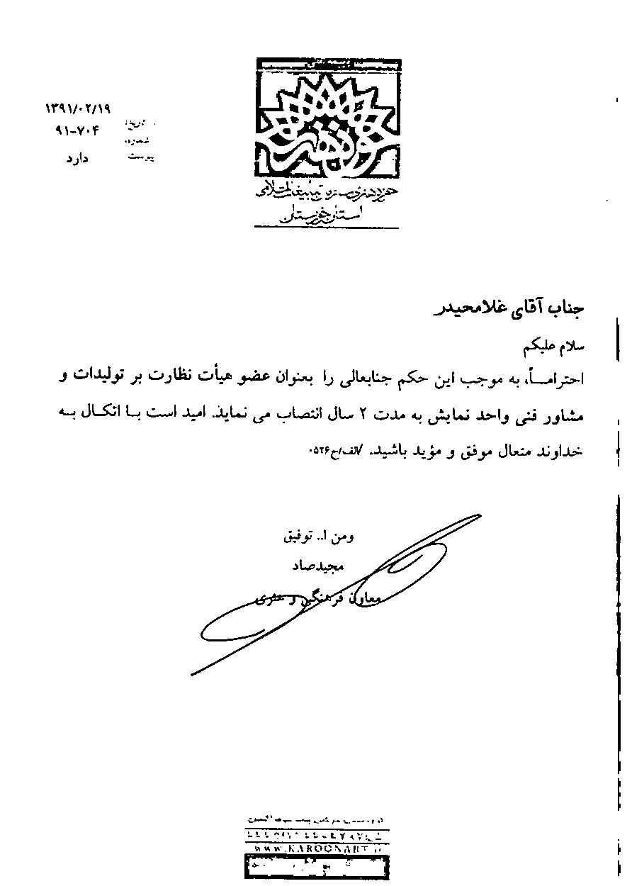 تقدیرنامه ها حکم انتصاب عضو هیئت داوران بخش نقالی و پرده خوانی حکم مسئولیت مدیر اجرایی هجدمین جشنوار تئاتر استان خوزستان بازخوان نوزدهمین جشنواره تئاتر استان خوزستان حکم مسئولیت داور بخش نمایشنامه نویسی سومین جشنواره هنری مقاومت عضو هیات داوران بخش نمایشنامه خوانی نخستین جشنواره بزرگ مقاومت آبادان حکم مسئولیت داور بخش نمایشنامه نویسی سومین جشنواره هنری مقاومت حکم مسئولیت مشاور نخستین جشنواره تئاتر دفاع مقدس خوزستان تقدیرنامه هیجدهمین جشنواره تئاتر استان خوزستان حکم مسئولیت شورای بررسی و انتخاب آثار حرفه ای و عضو کارگروه تئاتر استان خوزستان حکم مسئولیت عضو هیات داوران بخش نمایشنامه خوانی دومین جشنواره هنری مقاومت ویژه شکست حصر آبادان حکم مسئولیت مدیر اجرایی هجدهمین جشنواره تئاتر استان خوزستان حکم مسئولیت عضو هیئت نظارت بر تولیدات و مشاور فنی عضو شورای مشورتی تئاتر خوزستان حکم مسئولیت عضو هیات داوران بخش نمایشنامه خوانی دومین جشنواره هنری مقاومت ویژه شکست حصر آبادان حکم مسئولیت رئیس و عضو هیئت امنا انجمن نمایش حکم مسئول کمیته اجرایی و امور فرهنگی در نحستین جشنواره تئاتر دفاع مقدس خوزستان حکم مسئولیت شورای بررسی و انتخاب آثار حرفه ای و عضو کارگروه تئاتر خوزستان حکم مسئولیت بازخوان نوزدهمین جشنواره تئاتر استان خوزستان مسئول کمیته اجرایی و امور فرهنگی در نخستین جشنواره تئاتر دفاع مقدس خوزستان مشاور نخستین جشنواره تئاتر دفاع مقدس خوزستان حکم مسئولیت عضو هیات نظارت بر تولیدات و مشاور فنی واحد نمایش تقدیرنامه به مناسبت روز جوان حکم مسئولیت مشاور اجرایی در حوزه جوانان حکم مسئولیت عضویت در شورای نظارت بر نمایش شهرستان شوشتر عضو هیات داوران بخش نمایشنامه خوانی نخستین جشنواره بزرگ مقاومت آبادان حکم مسئولیت مشاور بررسی مسائل جوانان حکم عضویت شورای نظارت بر نمایش شهرستان شوشتر حکم مسئولیت عنوان رئیس و عضو هیئت امنا انجمن نمایش تقدیرنامه هجدهمین جشنواره تئاتر استان خوزستان تقدیرنامه در نشر و اعتلای هنر استان خوزستان حکم مسئولیت دبیر جمعیت پیشرفت و عدالت ایران اسلامی در شهرستان شوشتر لوح یادمان بیست و هفتمین جشنواره تئاتر مناطق کشور تقدیرنامه به مناسبت روز جوان تقدیرنامه اجرای نمایش غم در غیاب خداوند حکم مسئولیت راه اندازی خانه تشکلهای جوان در شهرستان ماهشهر بازخوان نوزدهمین جشنواره تئاتر استان خوزستان حکم مسئولیت داور بخش نمایشنامه نویسی سومین جشنوازه هنری مقاومت لوح یادبود نمایش آژیر چهار گوش لوح یادمان جشنواره فرهنگ جوانان خلیج فارس حکم مسئولیت دبیرخانه نشر آثار و پژوهش های انجمن هنرهای نمایشی استان خوزستان حکم مسئولیت مدیر اجرایی هجدهمین جشنواره تئاتر استان خوزستان تقدیرنامه نفر اول جشنواره اتفاق لوح تقدیر دهمین جشنواره استانی نمایش های کوتاه خوزستان حکم مسئولیت داوری اولین سوگواره عرشیان تقدیرنامه جوان منتخب در نخستین جشنواره استانی حضرت علی اکبر تقدیرنامه به مناسبت نوروز تقدیرنامه نفر اول جشنواره اتفاق حکم مسئولیت داور مرحله حضوری مسابقات هنرهای نمایشی در رشته تئاتر صحنه ای دانش آموزان استان خوزستان نبریک هفته میراث فرهنگی لوح یادبود چهارمین جشنواره تئاتر بسیج خوزستان حکم مسئولیت مشاور در نخستین جشنواره تئاتر دفاع مقدس خوزستان حکم مسئولیت عضو هیئت داوران بخش نمایشنامه خوانی نخستین جشنواره بزرگ مقاومت آبادان حکم مسئولیت شورای بررسی و انتخاب آثار حکم مسئولیت عضو هیات داوران بخش نمایشنامه خوانی دومین جشنواره هنری مقاومت ویژه شکست حصر آبادان حکم مسئولیت نماینده هفته نامه عصر کارون در شهرستان شوشتر تقدیرنامه نمایش زیبا و با شکوه آرش بزرگ اسطوره وطن لوح تقدیر سومین جشنواره استانی نمایش های کوتاه لوح تقدیر دومین کتاب دیجیتال نمایشنامه های خوزستان گواهینامه کارگاه تاریخ شفاهی و فن مصاحبه تقدیرنامه نمایش خورشید کاوران حکم مسئولیت دبی